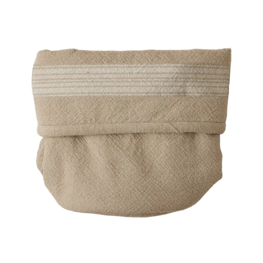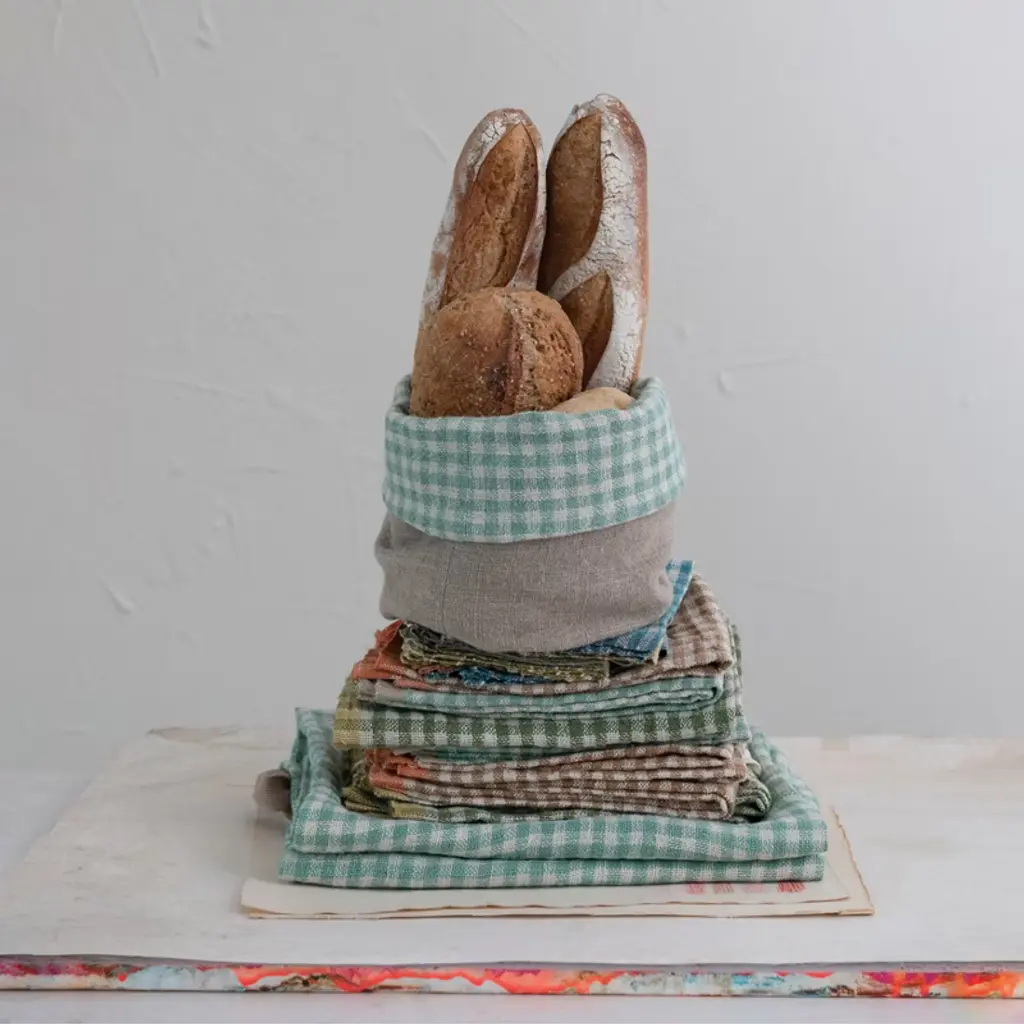 This farmhouse inspired bread basket showcases a handwoven linen construction with a classic gingham lining; 100% Linen; 7" L x 7" W x 9" H