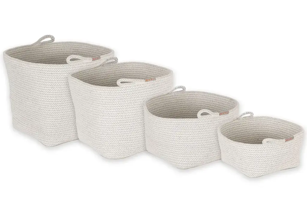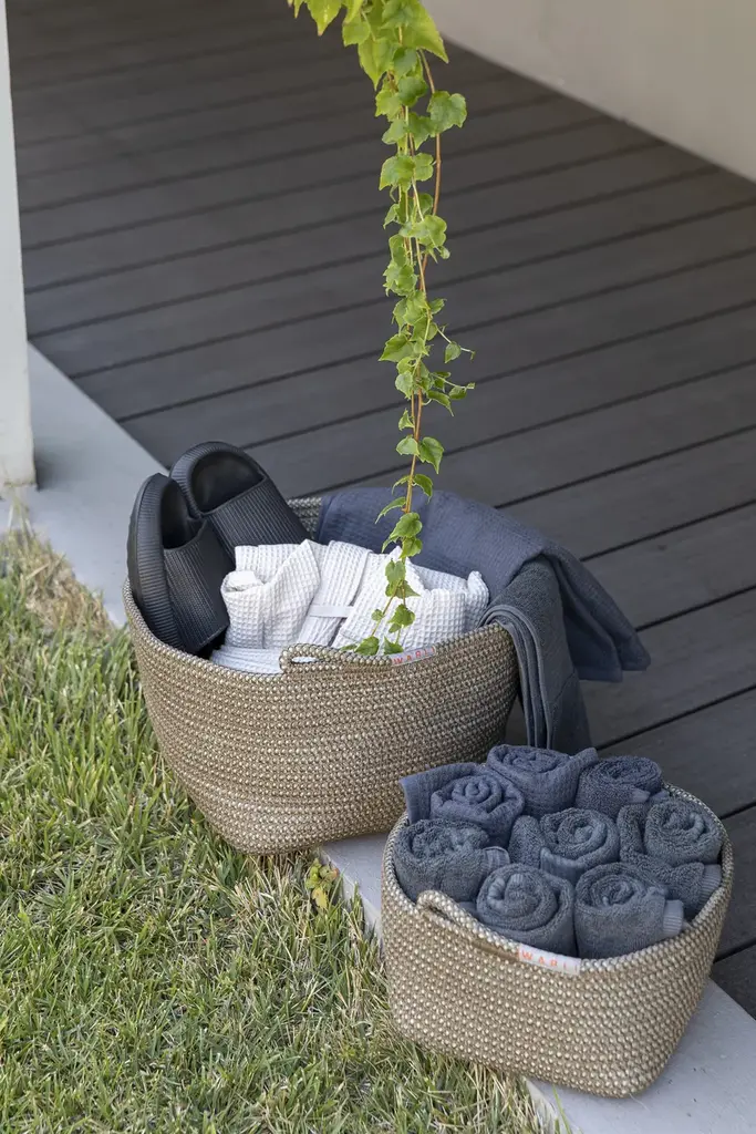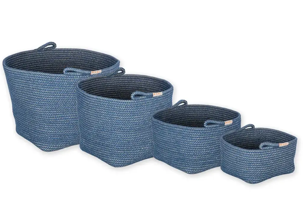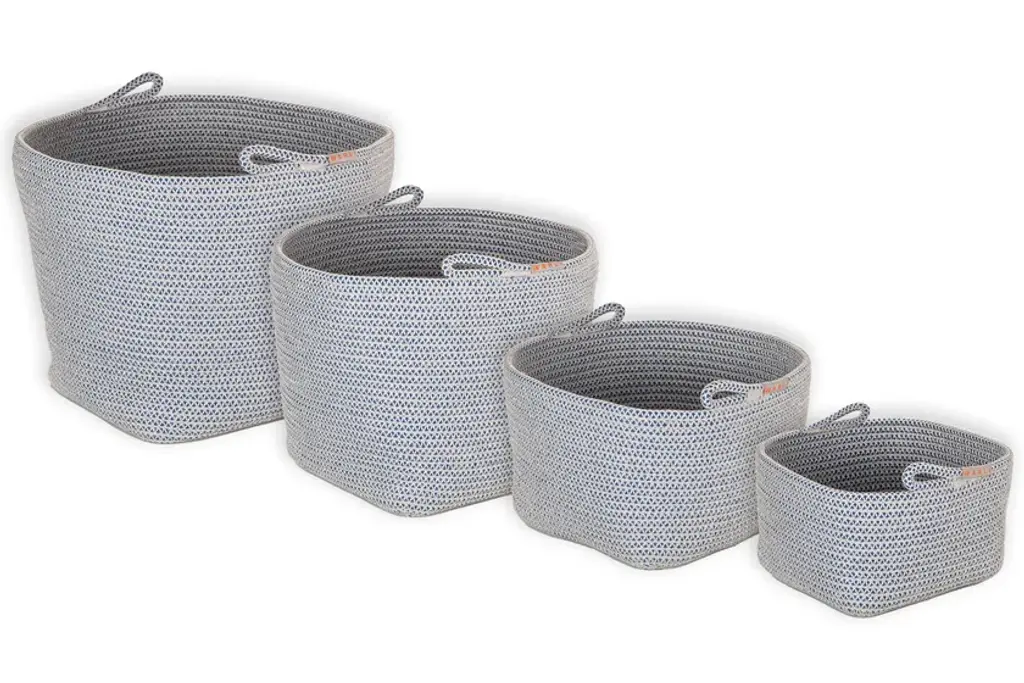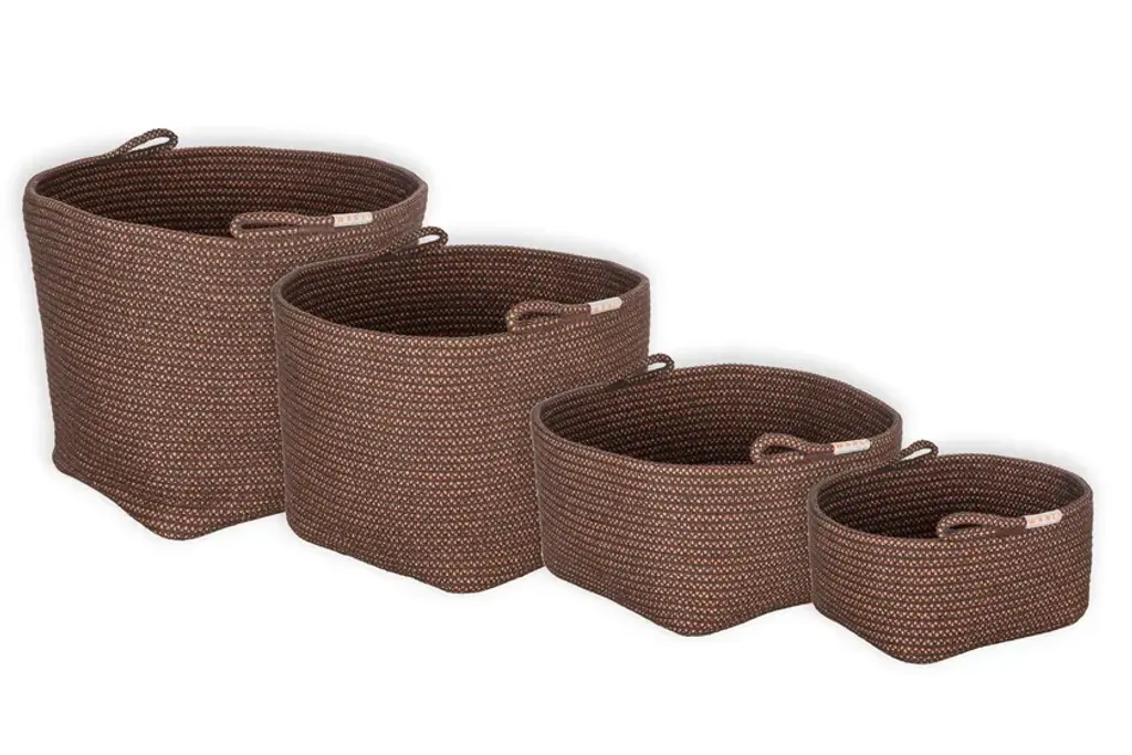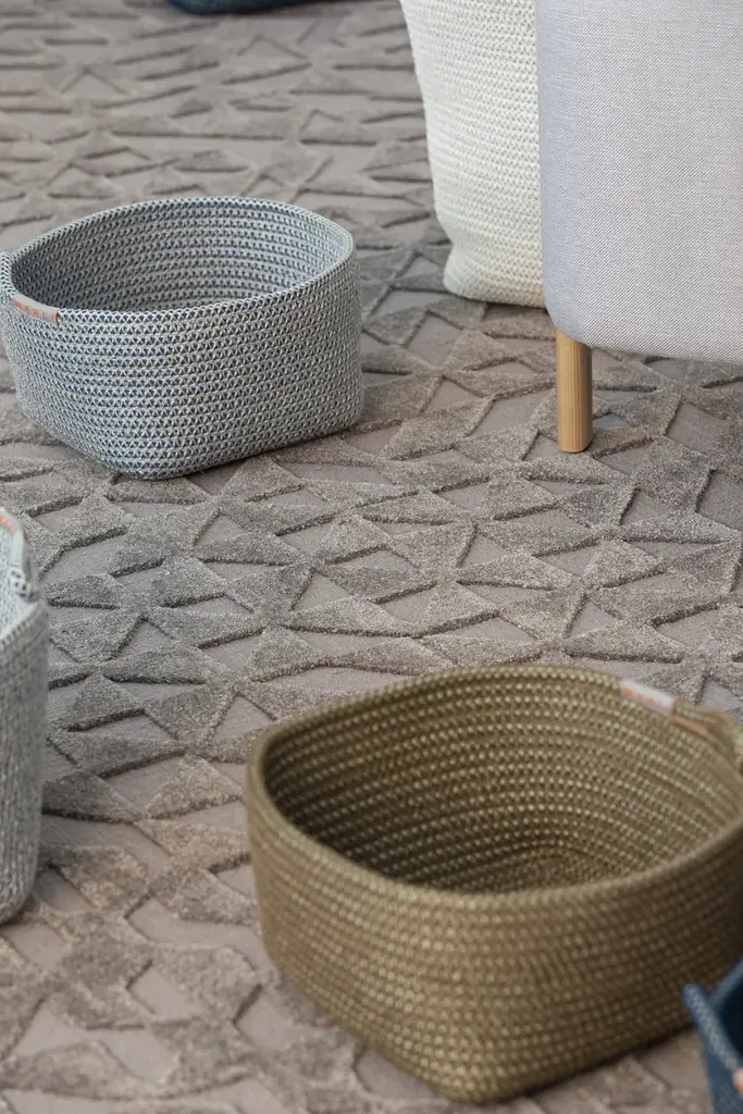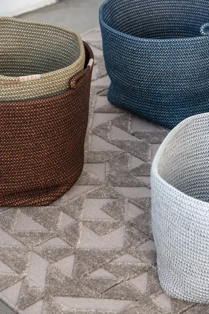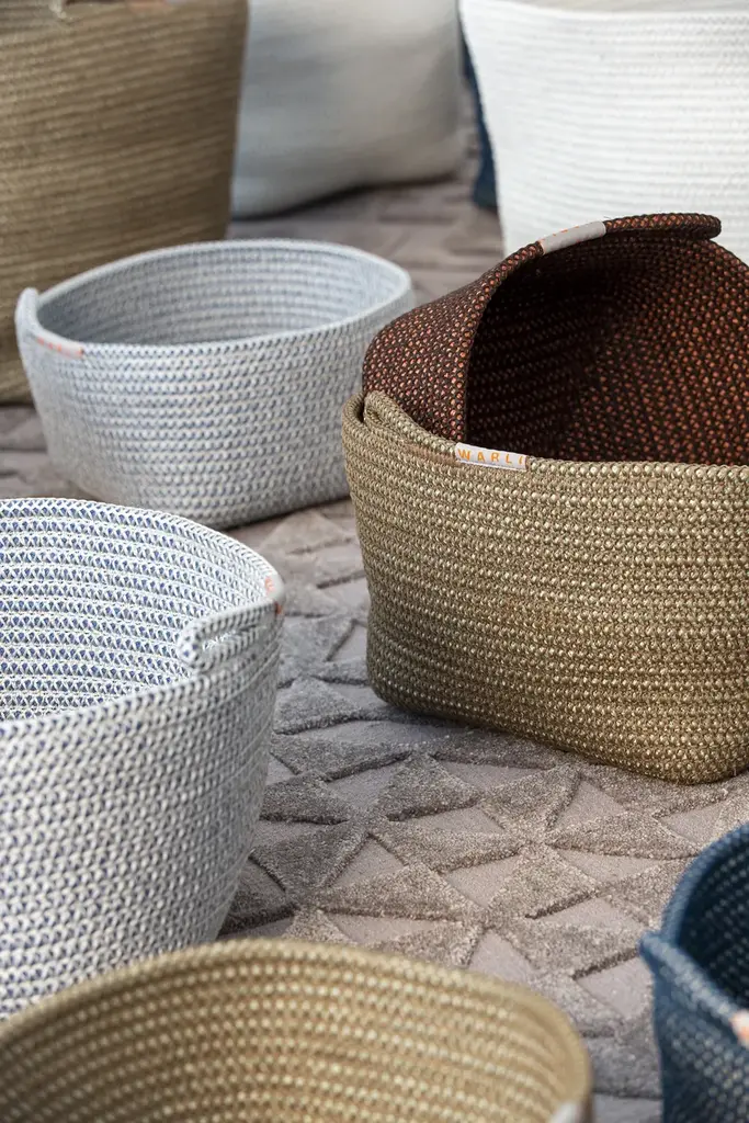Set of stackable multipurpose baskets suitable for indoor and outdoor use, made with an innovative 'bicolor' polypropylene rope lined by a net. For their manufacturing technique, they recall the continuous circular layering of 3D printing. They are instead made entirely by hand and with great attention to detail. Colors SR01 (grey | ivory) SR02 (light green | light brown) SR03 (rust | dark brown) SR04 (beige | blue) SR05 (blue | ivory)Technical Information Baskets in polypropylene 'w-proof' cord, hand-assembled and handsewn. Suitable for outdoor use. Weight: 0,5 Kg ; 0,75 Kg ; 1,08 Kg ; 1,2 Kg