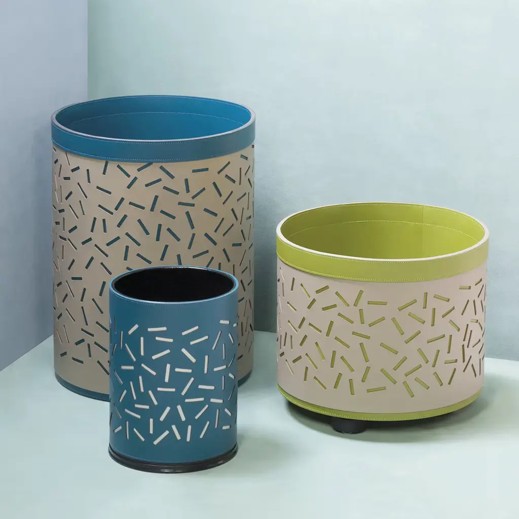 This round basket features a simple yet interesting design made of small cut-outs, all freely arranged. The basket is entirely crafted from Finest Regenerated Leather with a water-resistant and UV-resistant finish. Ideal for laundry, towels, plants or everyday objects, it comes complete with wheels for easy moving. Ideal for both indoor and outdoor use. Two-tone and monochrome versions available.