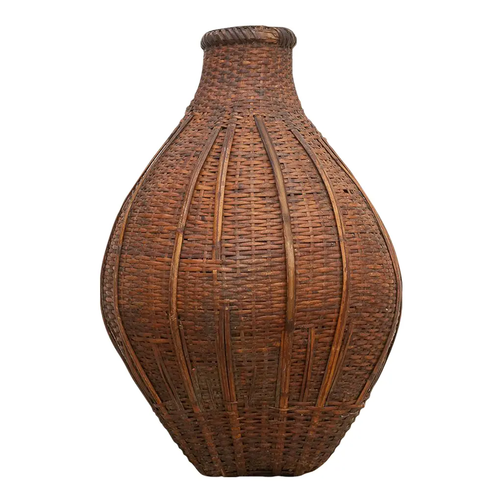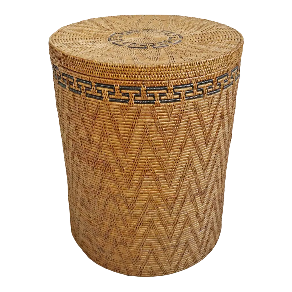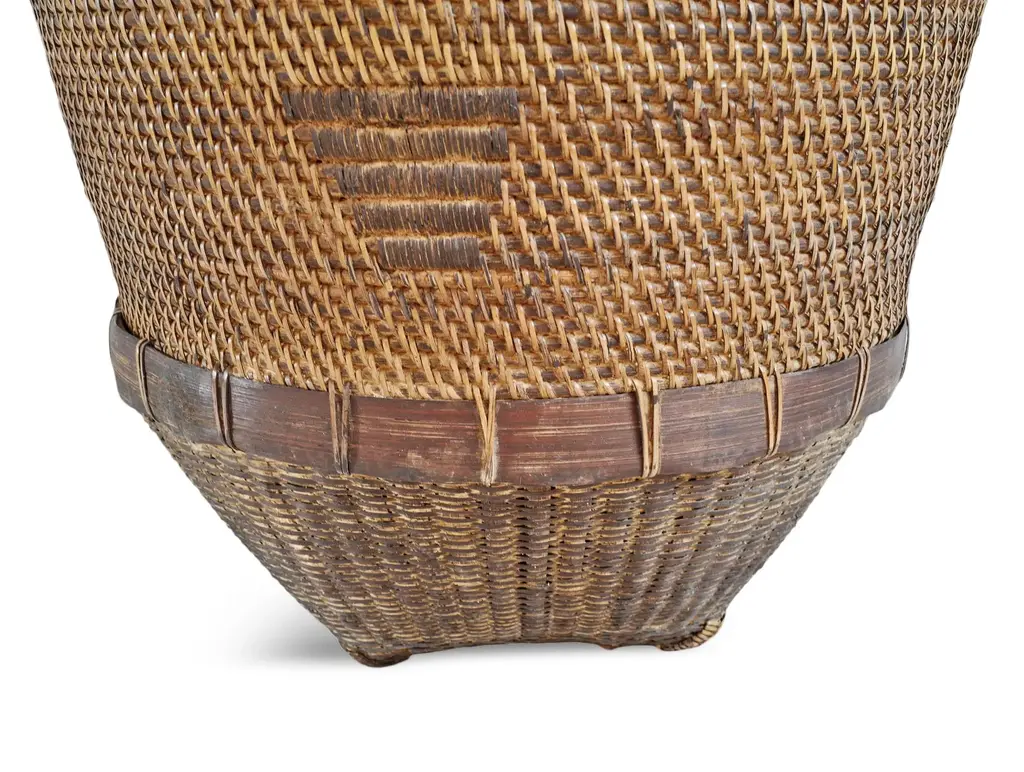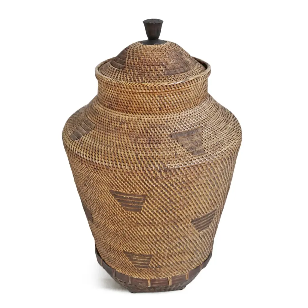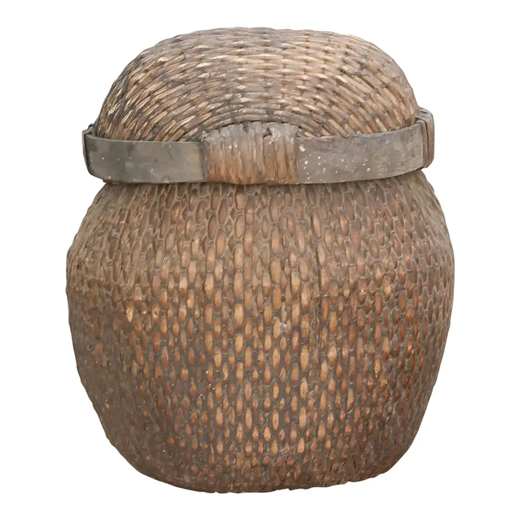 Tall hand woven Suma basket with lid. Opening at top (without lid) is 11" diameter. Each basket will have slight variations in natural tones, handmade differences, and inherent imperfections.