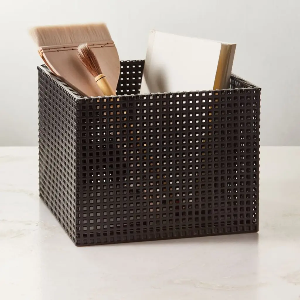 Sleek matte black storage basket is ideal for stashing magazines, textiles and other everyday items. Perforated metal is folded and welded, creating a rigid rectangular structure that functions brilliantly as an attractive bookshelf or office storage. Pair with the Tegan medium black storage basket for versatile use. CB2 exclusive.