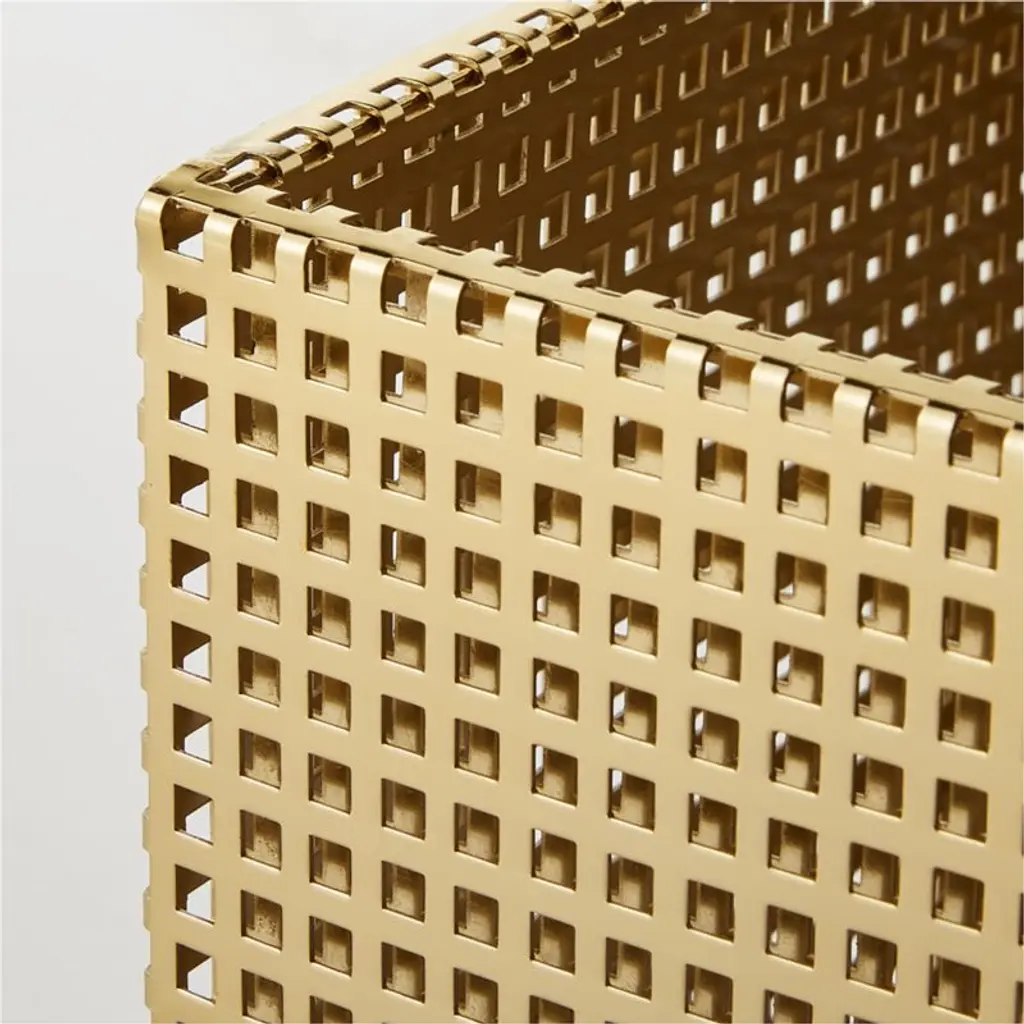 Polished brass storage basket is ideal for stashing magazines, textiles and other everyday items. Perforated material is folded and welded by hand, creating a rigid rectangular structure that functions brilliantly as attractive bookshelf storage. CB2 exclusive.