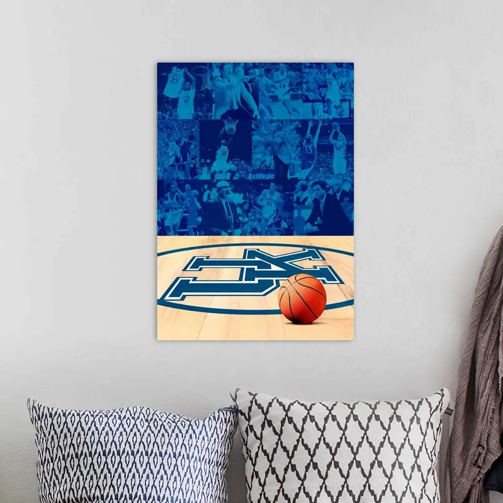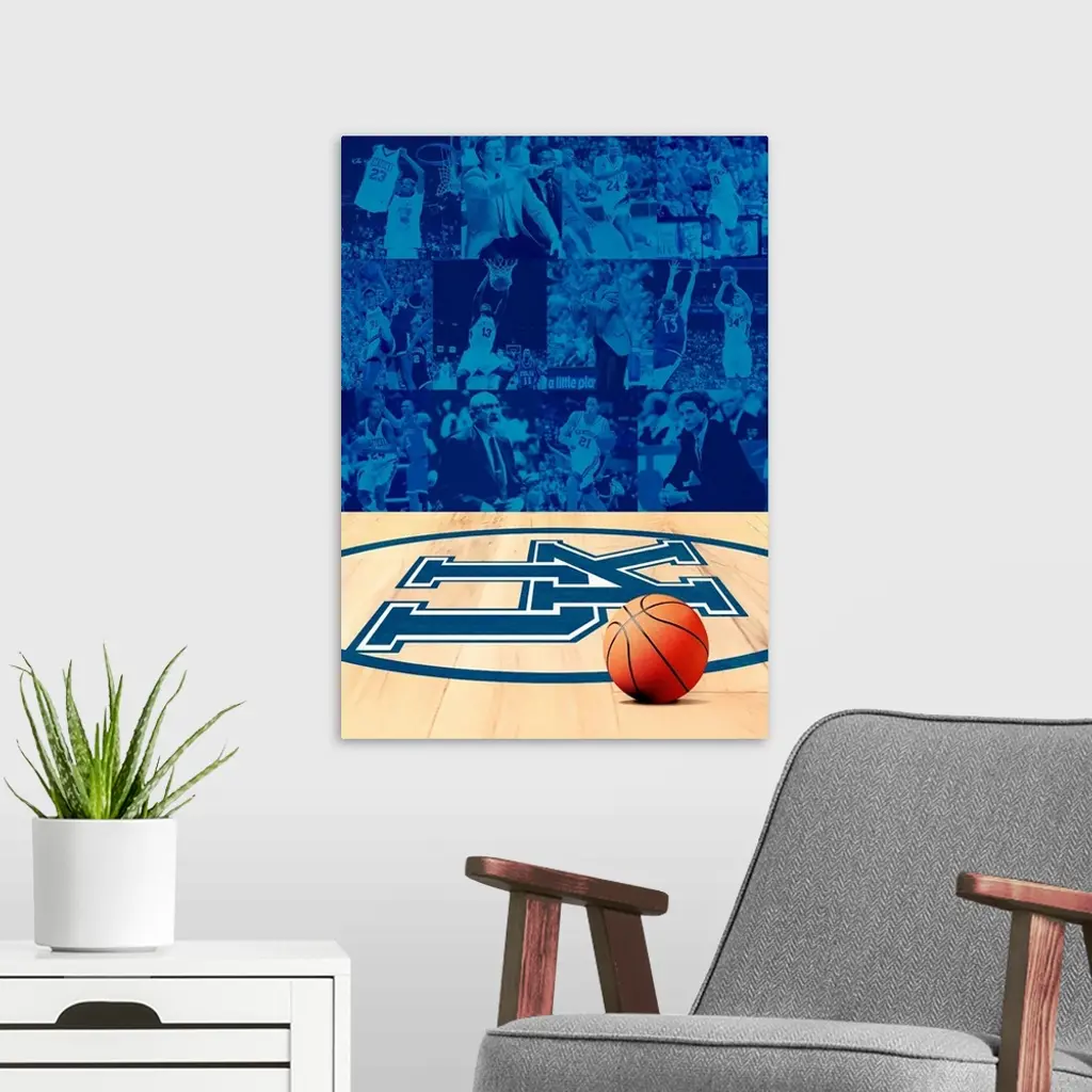 Portrait, large wall picture of collaged images displaying great moments in University of Kentucky basketball history. Below the collage is an image of the UK logo on the court, with a basketball sitting next to it.