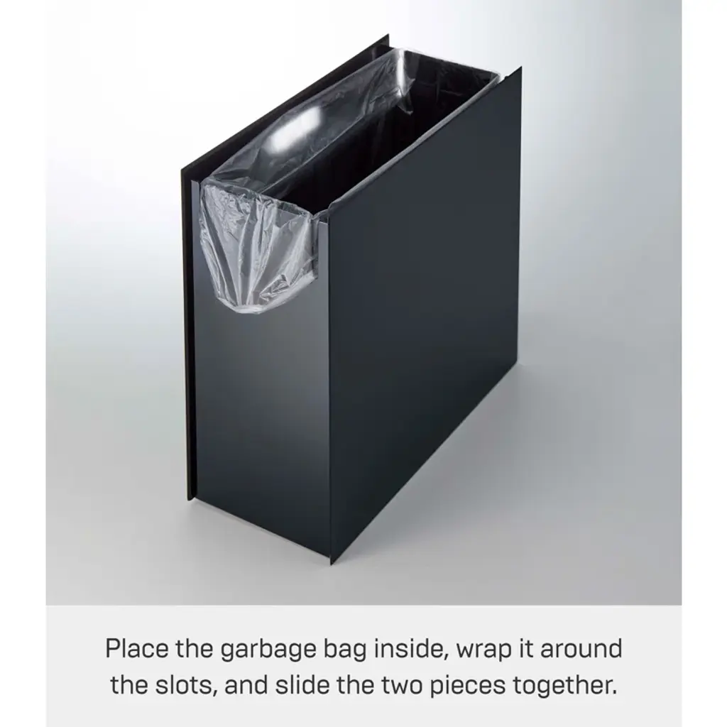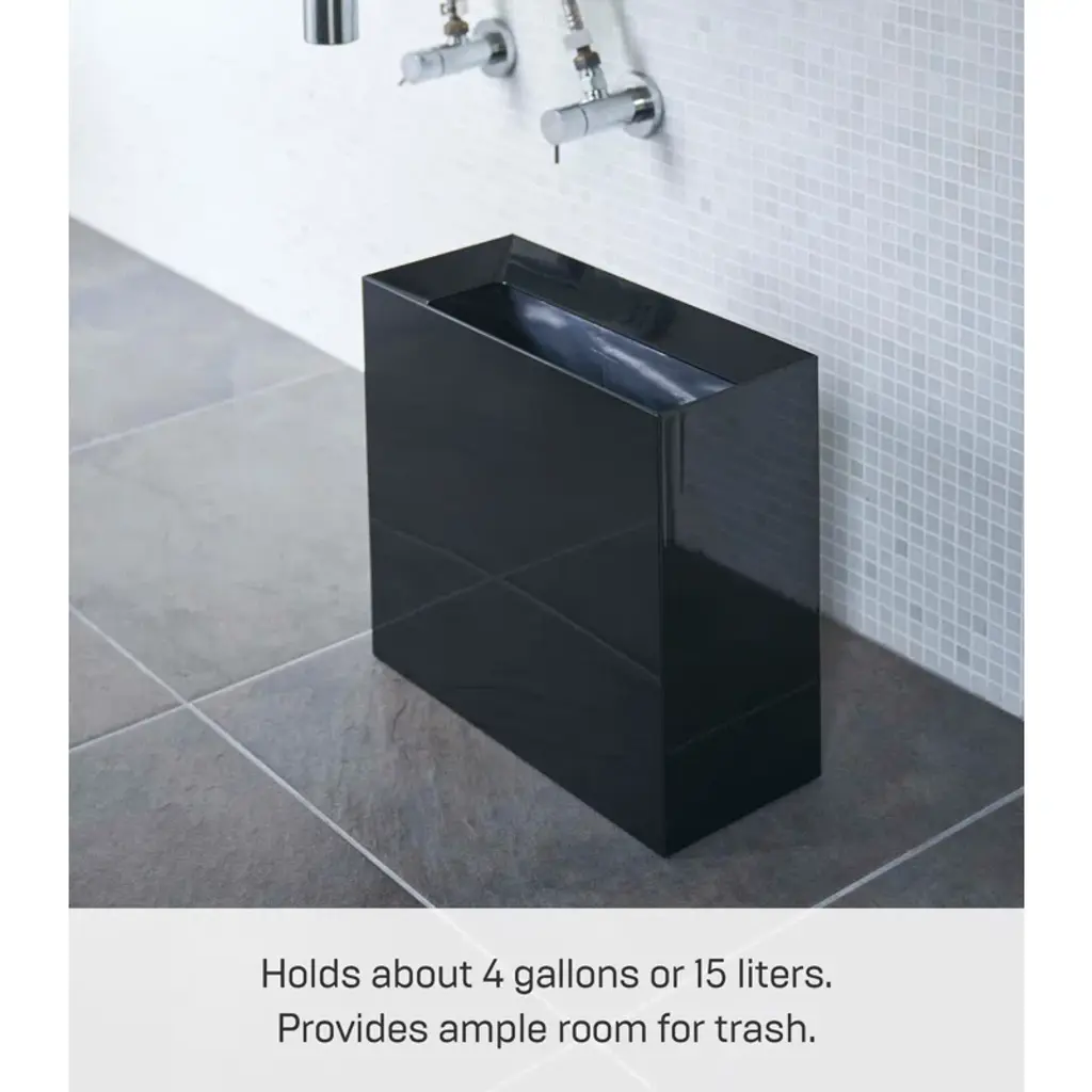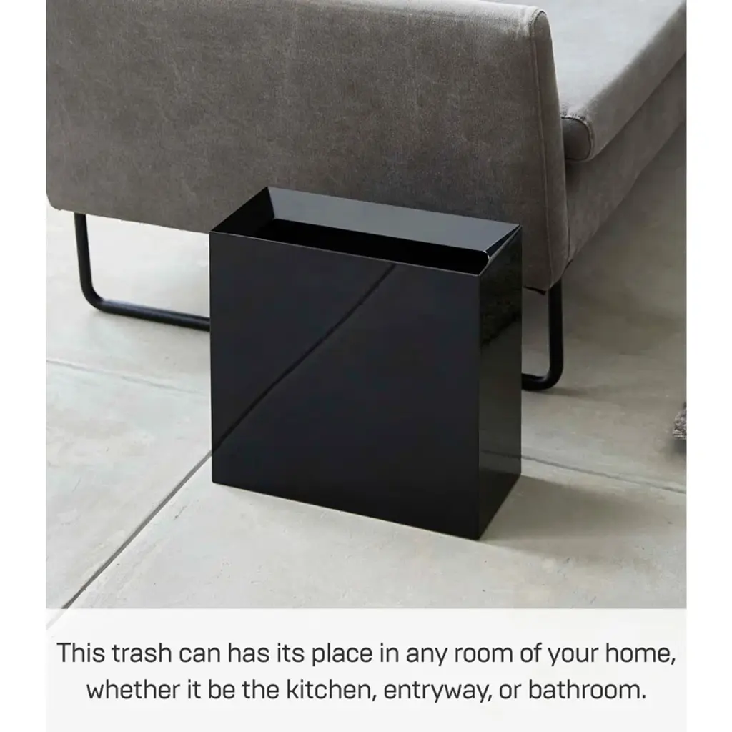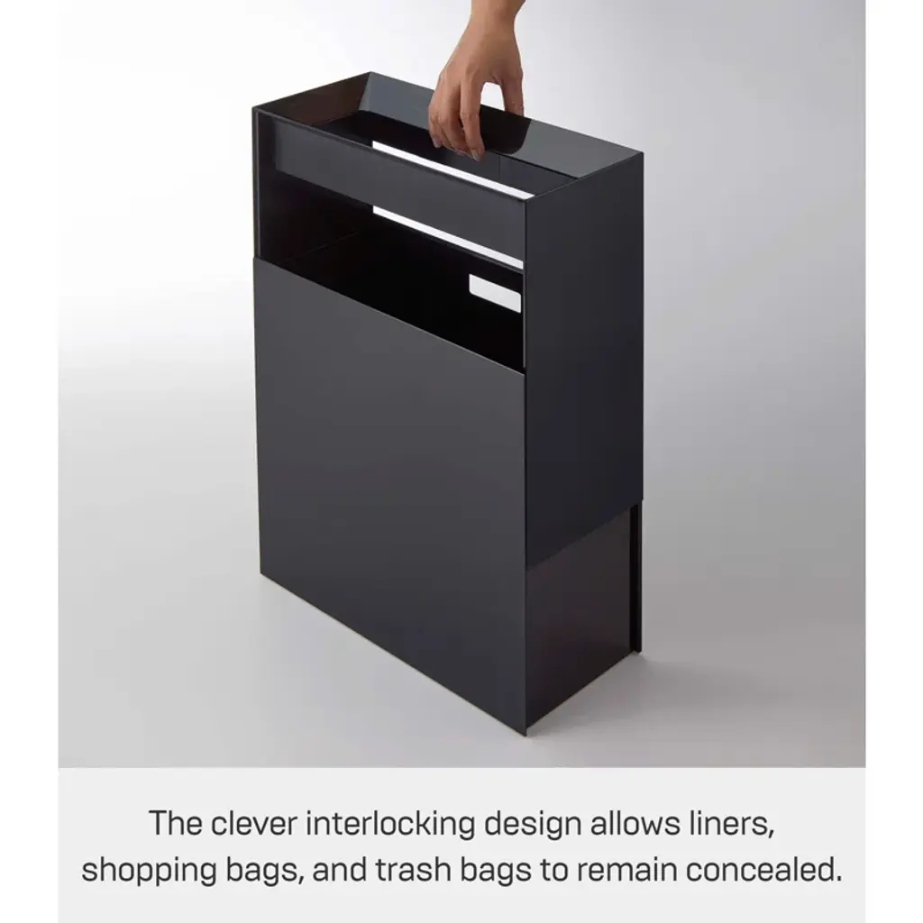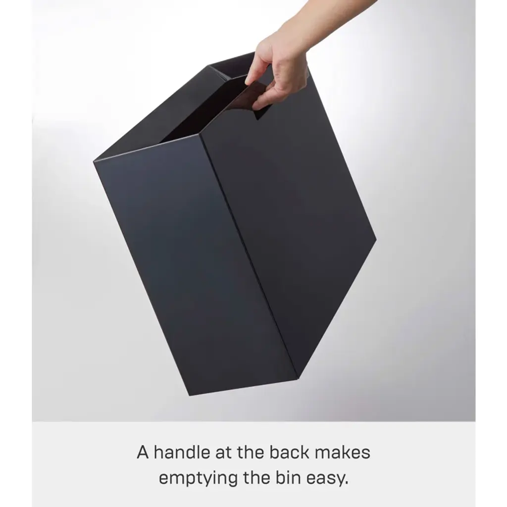 This modern wastebasket is perfectly designed for limited space. A simple square footprint belies the trash can's hidden features that keeps the trash equally hidden.