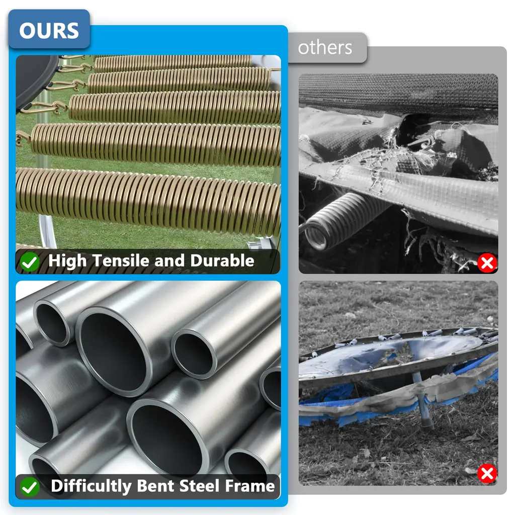 This outdoor trampoline and basketball circle, novel shape, more three-dimensional appearance, net rod and net space, not easy to collide, most of the spring pad is made of PE material, wear resistance UV stronger, thick spring protective cover to protect children's feet from injury, foam and PE plastic wrapped net rod and safety net together to protect children 360 from collision. (Safety guarantee) Do not worry about the safety of children, all around the protective net protection and spring protective pad, can let children play freely, adults can also enjoy it, your child's favorite outdoor games together, let the child get all the games he likes in the backyard. The perfect size allows this trampoline to be set up indoors or outdoors at will, providing a perfect place for children to entertain themselves no matter what the weather.