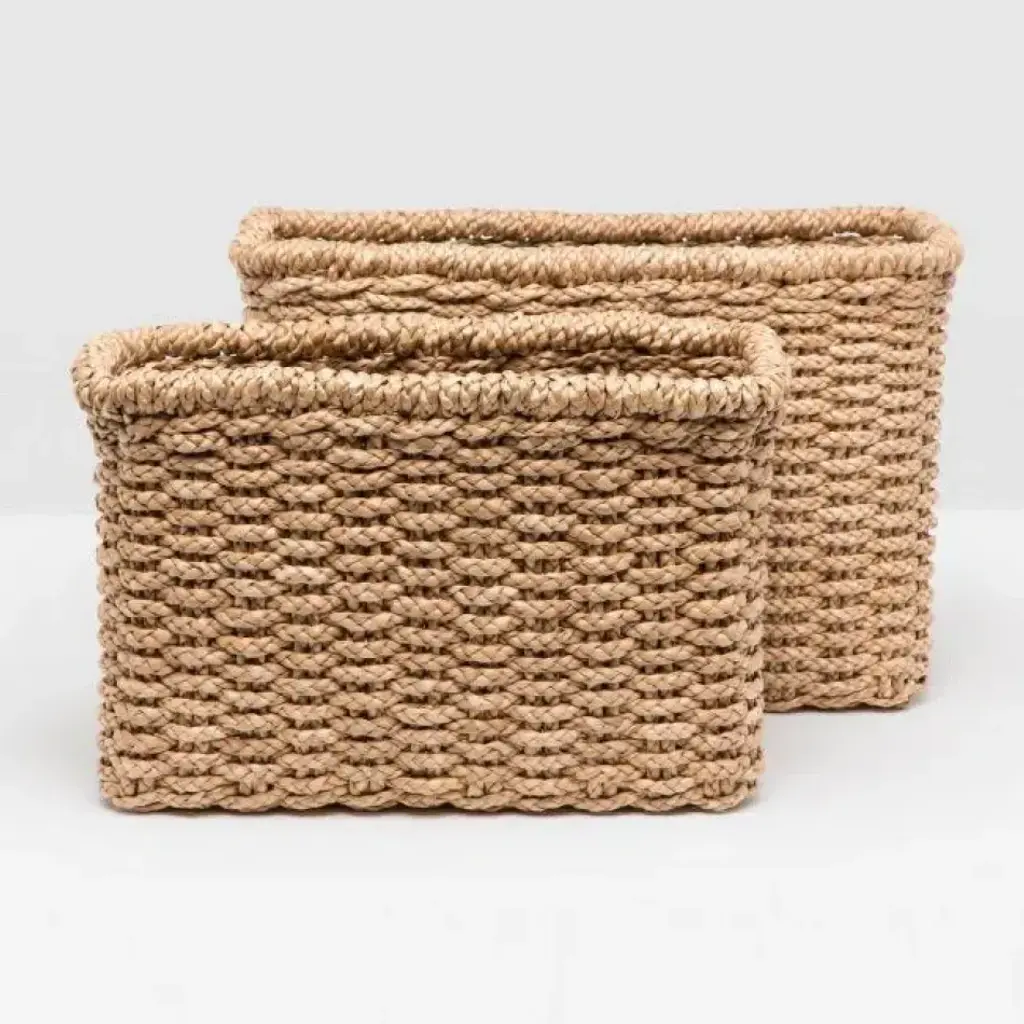 Nestle magazines, linens, towels or pillows in an artisan-crafted storage solution, hand-woven in great chunky coils from water hyacinth stems, a natural, bountiful resource. Thick rope strands loop at the each end to form handles, adding to the rustic feel.