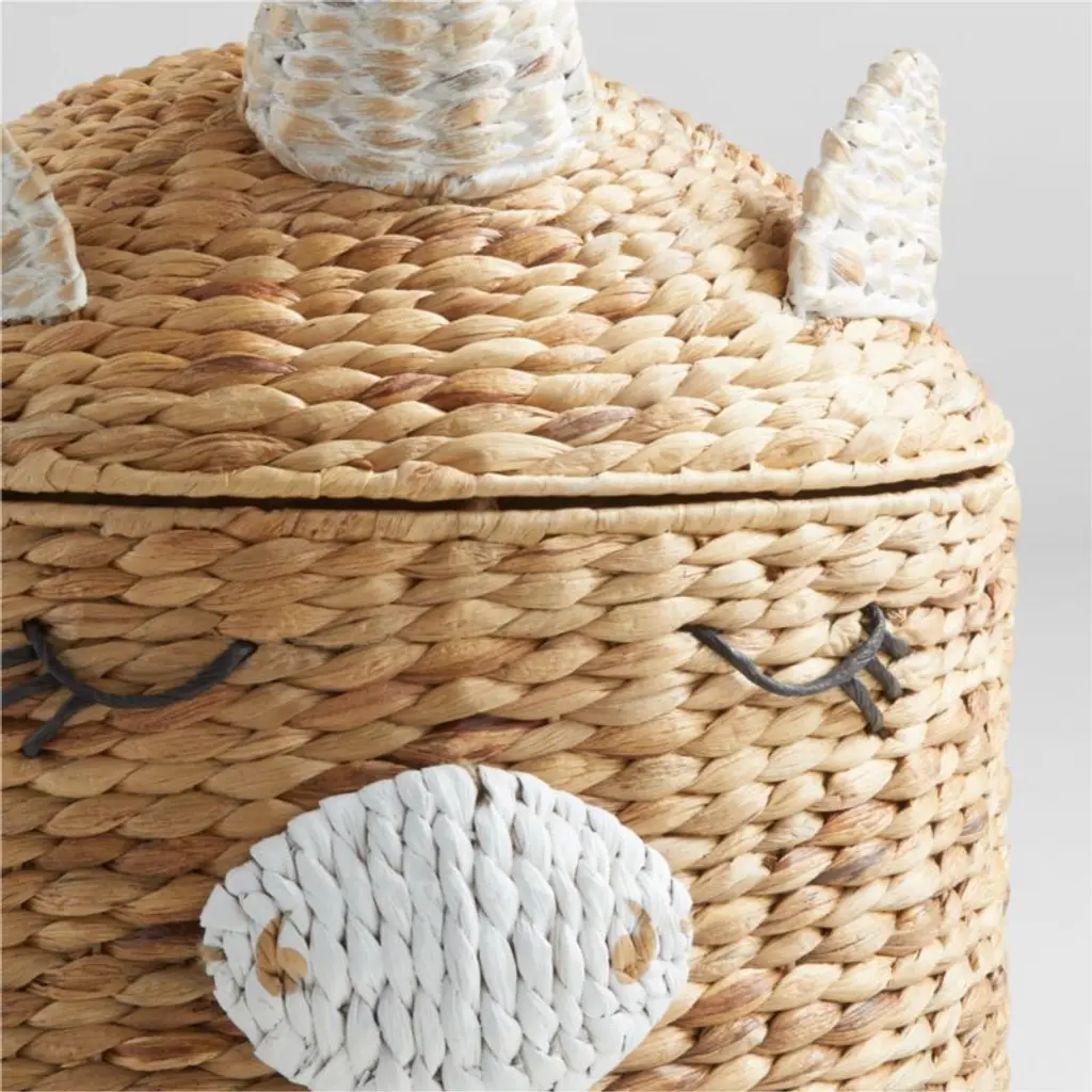 Our sweet-faced unicorn hamper makes room tidying fun. Woven of water hyacinth fibers, the natural-toned hamper sports eyelashed lids and white ears, muzzle and horn that makes it simple for little hands to open the lid. Cutout handles provide an easy grasp for toting the hamper to the laundry room.