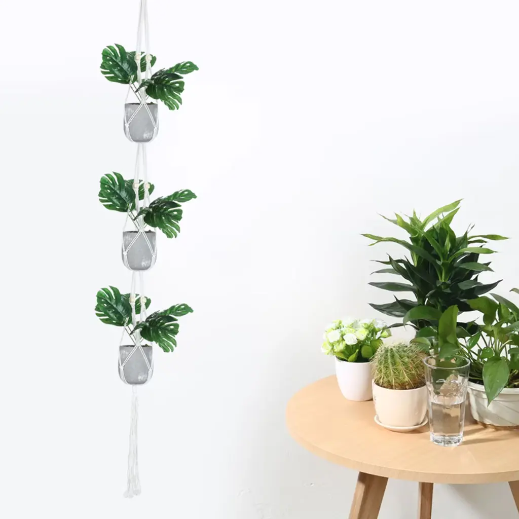 This set of two macrame plant hangers offers a stylish and space-saving solution for displaying your indoor plants. The hangers are crafted from cotton and wood, providing a sturdy base for your plants while adding a modern touch to your home decor. Suitable for both indoor and outdoor use, these hangers are perfect for small apartments or homes with limited space, allowing you to enjoy vertical gardening without taking up floor space. Simply place your flowers or plants in the middle of the rope to beautify your living area, office, or hotel. Note that the flower pots are not included, and there may be a slight measurement error.