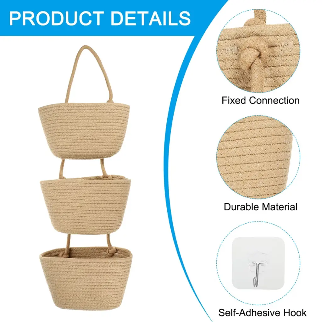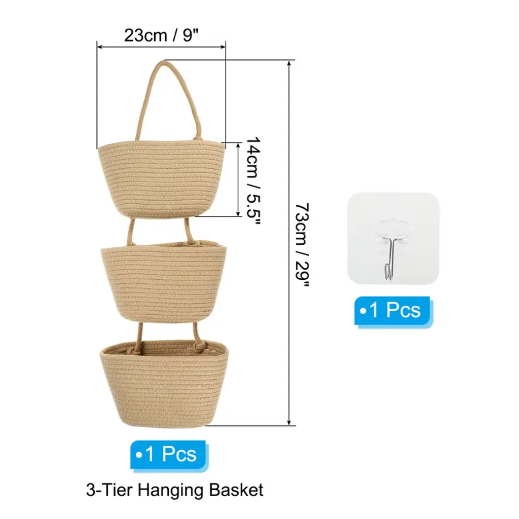 The hanging basket organizer is suitable for use in various areas of the home, such as the kitchen, bathroom, front door, living room, and over doors. It can be used to neatly store items like vegetables, fruits, clothes, towels, keys, scarves, flowers, books, notebooks, magazines, cosmetics, decorations, and more. It serves as both a practical storage organizer and an aesthetically pleasing addition to your home decor. Advantage: It is made of hand-woven material, handmade, soft, natural, durable, and not easy to break. The wall hanging basket makes you better use your space, has a large capacity, and is space-saving. The basket ropes are securely fixed to the basket, capable of supporting a heavy weight, providing you with a reliable and assured user experience. It is a nice present for your friends and family! Instruction: The set comes with 3-tier hanging baskets and 1 hook, allowing you to organize home essentials or decorative items efficiently and elegantly. With its natural color, the hanging basket effortlessly combines the elements in your home, adding a versatile and beautiful addition to your decor. Notice 1. Please confirm the size before purchasing. 2. Hand-washing or machine-washing is available.