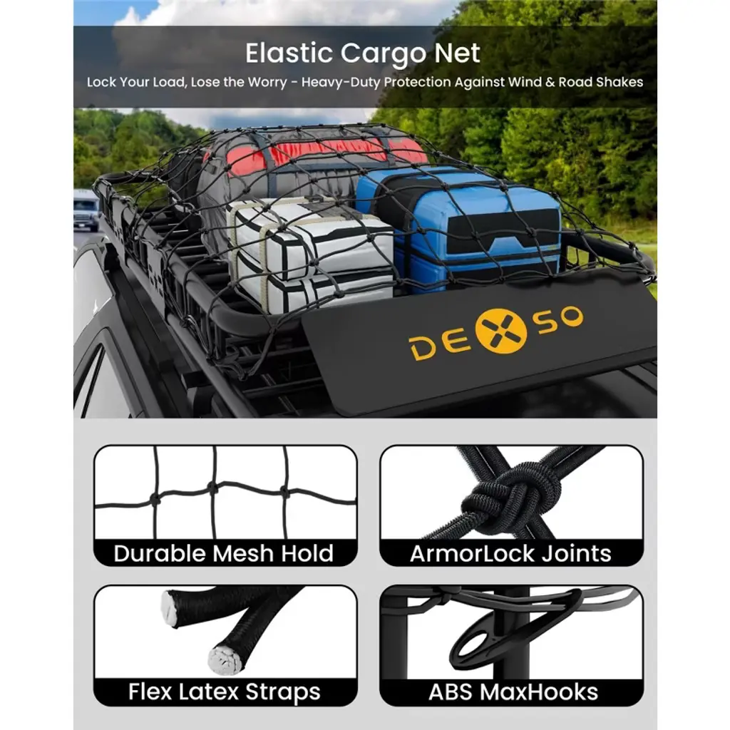 【LARGE STORAGE CAPACITY】Free up space in your vehicle with this roof rack cargo basket that can hold up to 200 Lbs. Overall dimensions include: 64"(L) x 39"(W) x 6"(H). This roof rack set includes elastic cargo net 【BUILT TO LAST】The Universal Roof Rack Basket integrates powder-coated steel and electrophoretic technology to resist rust, corrosion, and extreme weather. Engineered for heavy-duty performance, it safeguards cargo during cross-country trips, camping, or long-term outdoor storage—built tough to outlast every adventure 【EASY INSTALLATION & COMPATIBILITY】Easily installed on the car roof with four universal U-bolts within minutes. Compatible with many types of vehicle crossbars,including Cars, SUVs, Pickups, and RVs(please make sure your car has crossbars) 【SECURE TRANSPORTATION】Featuring Bottom metal bars and side rails, your items are securely supported during travel. And features a steel wind deflector fairing to protect cargo from wind damage and reduce wind resistance 【Customer Satisfaction】Customer is top priority. If you have any questions or need clarification about the cargo carrier luggage rack, please contact us, and our support team is on standby for you