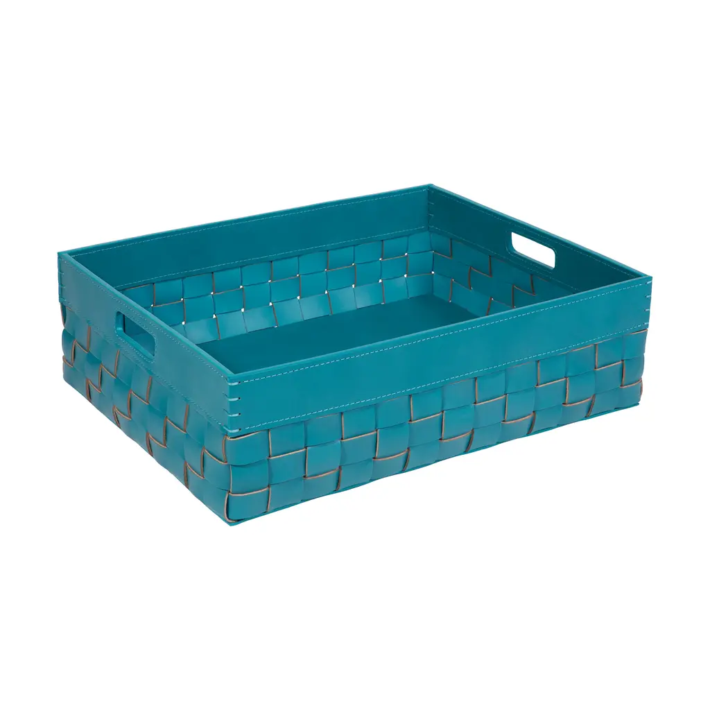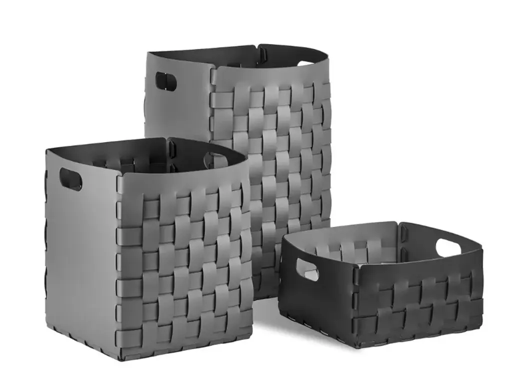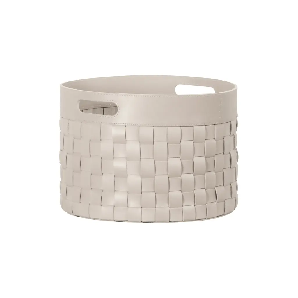 Part of the Verona series, this large basket is a perfect object to store a variety of different items in an elegant and sophisticated way. The structure is entirely made in saddle leather, which was treated using vegetable dyes to give it its light gray color. The strips of fine leather are woven into a striking texture and culminate in the smooth top ring that features two practical handles for easy pickup.