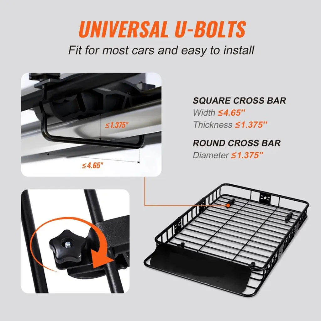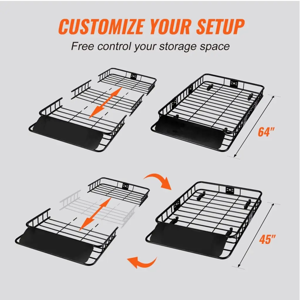 Feature: The Quality Can't Be Beaten: The VEVOR roof rack cargo basket can hold up to 200 lbs, 33% heavier than the market average standard, perfect for your gear or even bulky cargo. The heavy-duty steel used in our basket is powder painted and galvanized to make it more resistant to rust and corrosion. Dual Size Options: Get an extra roomy space on top of your vehicle with our 64 x 39 x 6 inch roof rack cargo carrier! Free up more space in your vehicle for your family and friends. In addition, our roof rack cargo basket can be adjusted from 64x39x6 inches to 45x39x6 inches to fit different cars or adapt to your ever-changing storage needs. Aerodynamic Design: The front of the roof cargo rack is equipped with a wind fairing to reduce resistance and wind noise. The cargo basket is designed with a curved corner to avoid scratches and accidental injuries when loading and unloading cargo. Universal U-Bolts: Thanks to the easy to install 4 universal U-bolts, the installation process has never been quicker. The u-bolts accommodate square crossbars up to 4.65" wide x 1.375" thick or round bars up to 1.375" in diameter. Please make sure your car has a crossbar. Perfect for Travel: This rooftop cargo basket is ideal for loading irregularly shaped items such as camping equipment, luggage, cargo bags, bikes, kayaking gear, and other outdoor equipment. It is a simple yet effective solution for maximizing the storage area of your vehicle. Bring all your favorite camping gear with you, and enjoy your trip! Package Content 1 x M8 Hex Wrench 1 x Dual-purpose Open-end Wrench 4 x U bolts 8 x Rubber Head Plum Nuts 4 x Hex Bolts 4 x Hexagon Locking Nuts 2 x Iron Plates 4 x Blue Saddles 4 x Blue Top Iron Plates 4 x Sleeves
