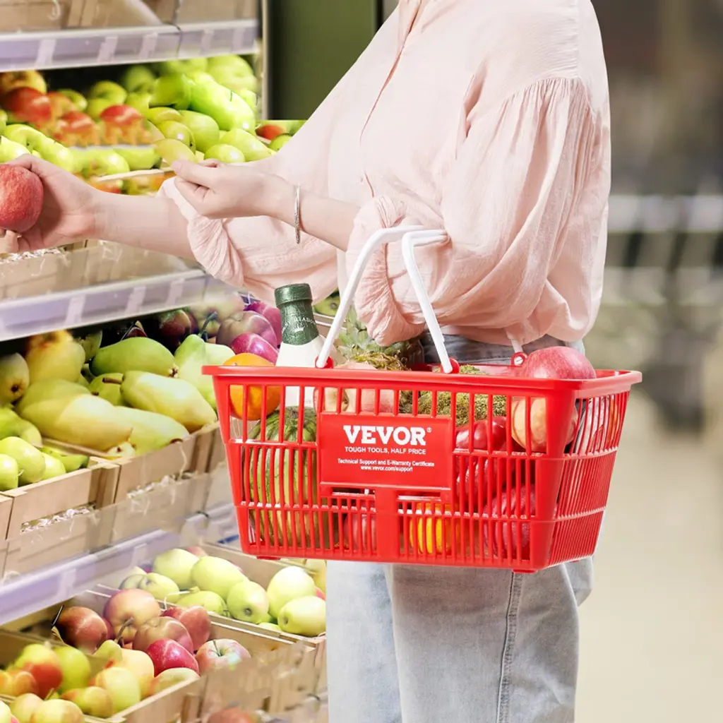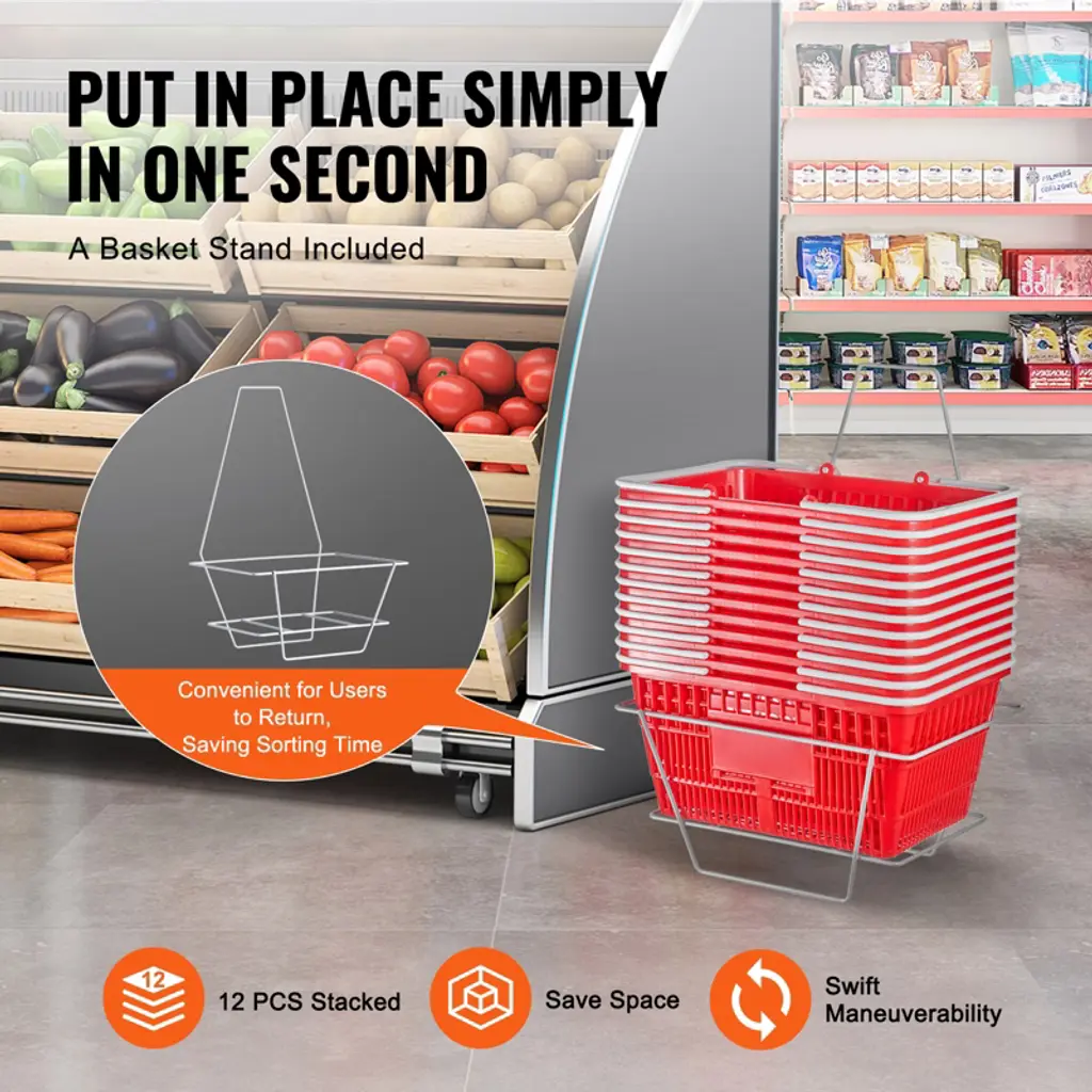 Feature: Large Capacity: Sized at 16.5 x 11.8 x 8.27 inches, our 21L capacity shopping basket takes the stress out of carrying your goods. Ideal for families, it holds a week's worth of shopping and comes in a set of 12 for easy sharing, suitable for storing fruits, vegetables, shampoo, and various groceries. Premium PE Material: Crafted from industrial-grade PE material, this store basket is tough and durable. No funky odors here! With a smooth surface to protect your items and a reinforced bottom for added security, it can handle up to 20 pounds without breaking a sweat. Designed for You: Our shopping hand basket features ergonomic widened handles for a comfortable grip, making carrying heavy loads a breeze. The double-sided handle design facilitates basket placement, stacking, and stability, making it ideal for household shopping and short-term storage needs in commercial environments. High Load-Bearing Basket Stand: Keep your shopping organized with our basket stand! Easily store multiple plastic shopping baskets and keep your space clutter-free. Ideal for supermarkets or at home, it's a must-have for a convenient shopping experience. Place it throughout the store to attract customers' attention and encourage quick purchases. Versatile Use: From supermarkets to convenience stores, bookstores to shopping centers, our store shopping basket fits right in! Its stable placement and high load-bearing design ensure stability wherever you go. Say hello to hassle-free shopping anytime, anywhere! Package Content 12 x Shopping Baskets 1 x Basket Stand