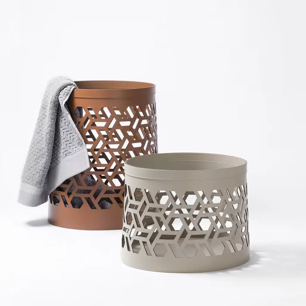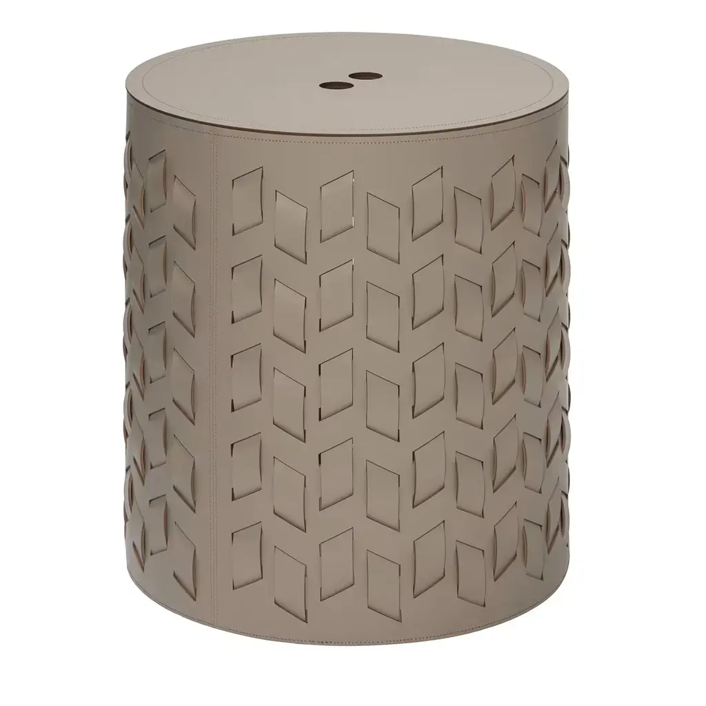 This low round beige basket crafted entirely from high quality Finest Regenerated Leather is perfect for magazines, laundry and everyday objects. The water-resistant and UV-resistant finish of the leather make the basket ideal for both indoor and outdoor use. The Vienna pattern is inspired by classic Vienna weaving, reinterpreted here with an interesting and contemporary spin.