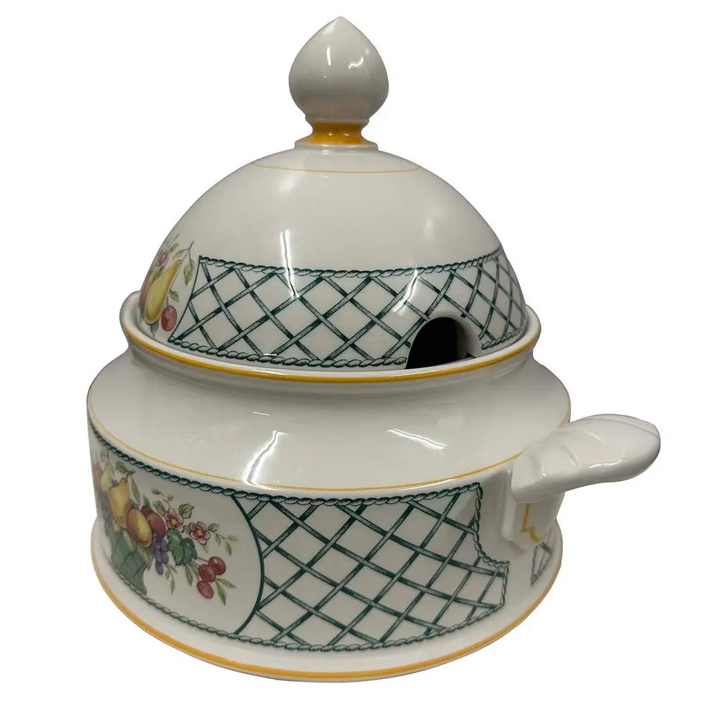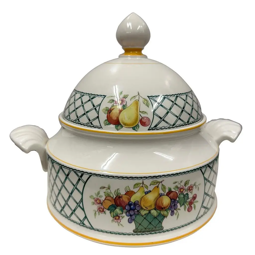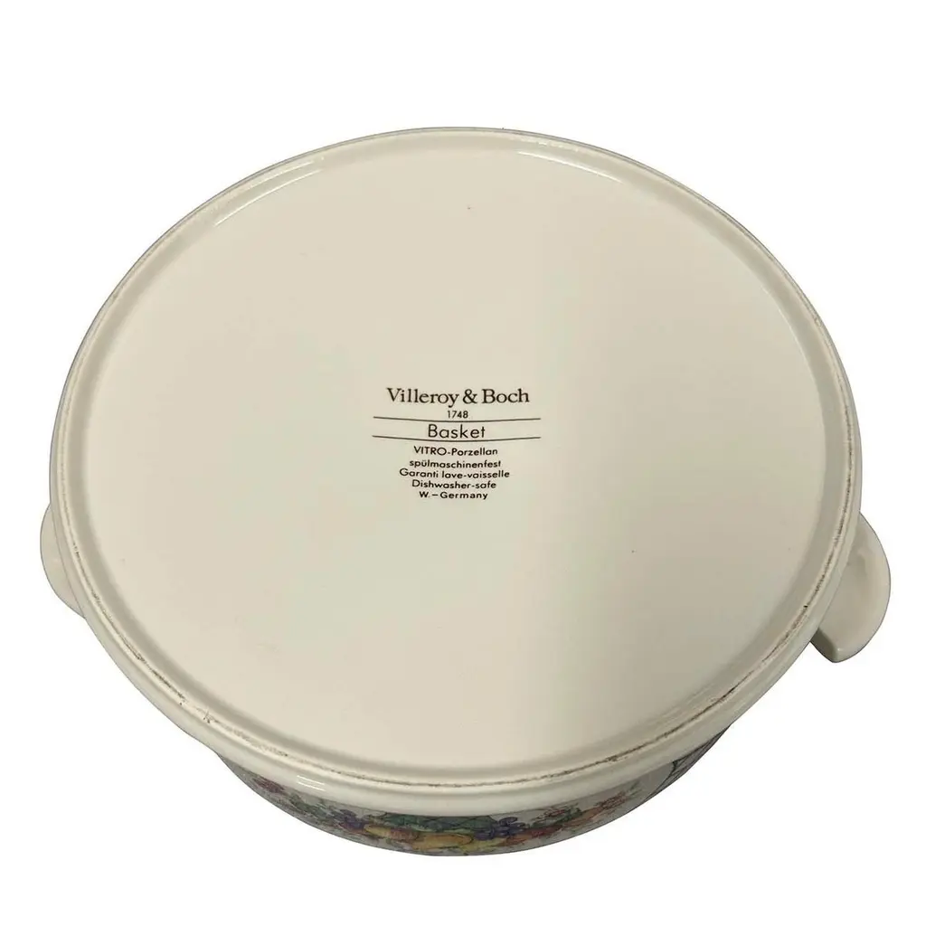 Basket by Villeroy and Boch is a striking dinnerware pattern featuring a charming fruit basket design accentuated with a graceful green and white lattice border. This pattern was produced in Germany from 1983 until 2007. This large covered vegetable bowl is 9 inches tall with the lid on. It is 8 inches in diameter and 10.5 inches wide with the handles. This vegetable bowl is in beautiful like new condition. No chips, cracks or scratches. This pattern has been discontinued but was produced between 1983 - 2007. Made of Vitro Porcelain and dishwasher safe.A pleasant feature of ceramics is its low thermal conductivity - it retains both heat and cold for a long time.Made from high quality porcelain, this kitchen accessory is ideal not only for your own home use, but also as a gift for family and friends.Size: 9in H x 10.5in W x 8in DOrigin: GermanyCirca: 1970sMaterial: PorcelainCondition: Like new condition. No chips, cracks or scratches. Disclaimer: Due to differences in monitor/screen settings, product colors may differ slightly between product photos and the physical product.