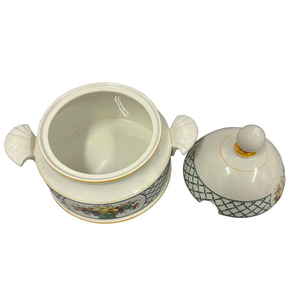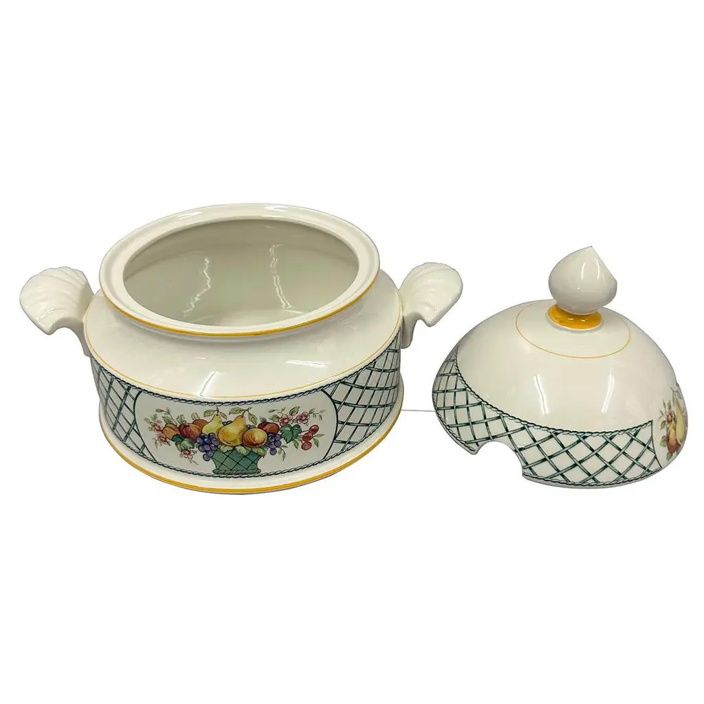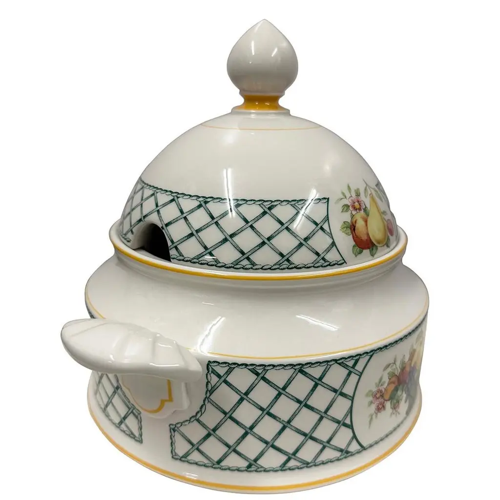 Basket by Villeroy and Boch is a striking dinnerware pattern featuring a charming fruit basket design accentuated with a graceful green and white lattice border. This pattern was produced in Germany from 1983 until 2007. This large covered vegetable bowl is 9 inches tall with the lid on. It is 8 inches in diameter and 10.5 inches wide with the handles. This vegetable bowl is in beautiful like new condition. No chips, cracks or scratches. This pattern has been discontinued but was produced between 1983 - 2007. Made of Vitro Porcelain and dishwasher safe.A pleasant feature of ceramics is its low thermal conductivity - it retains both heat and cold for a long time.Made from high quality porcelain, this kitchen accessory is ideal not only for your own home use, but also as a gift for family and friends.Size: 9in H x 10.5in W x 8in DOrigin: GermanyCirca: 1970sMaterial: PorcelainCondition: Like new condition. No chips, cracks or scratches. Disclaimer: Due to differences in monitor/screen settings, product colors may differ slightly between product photos and the physical product.