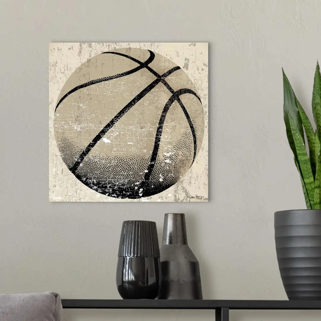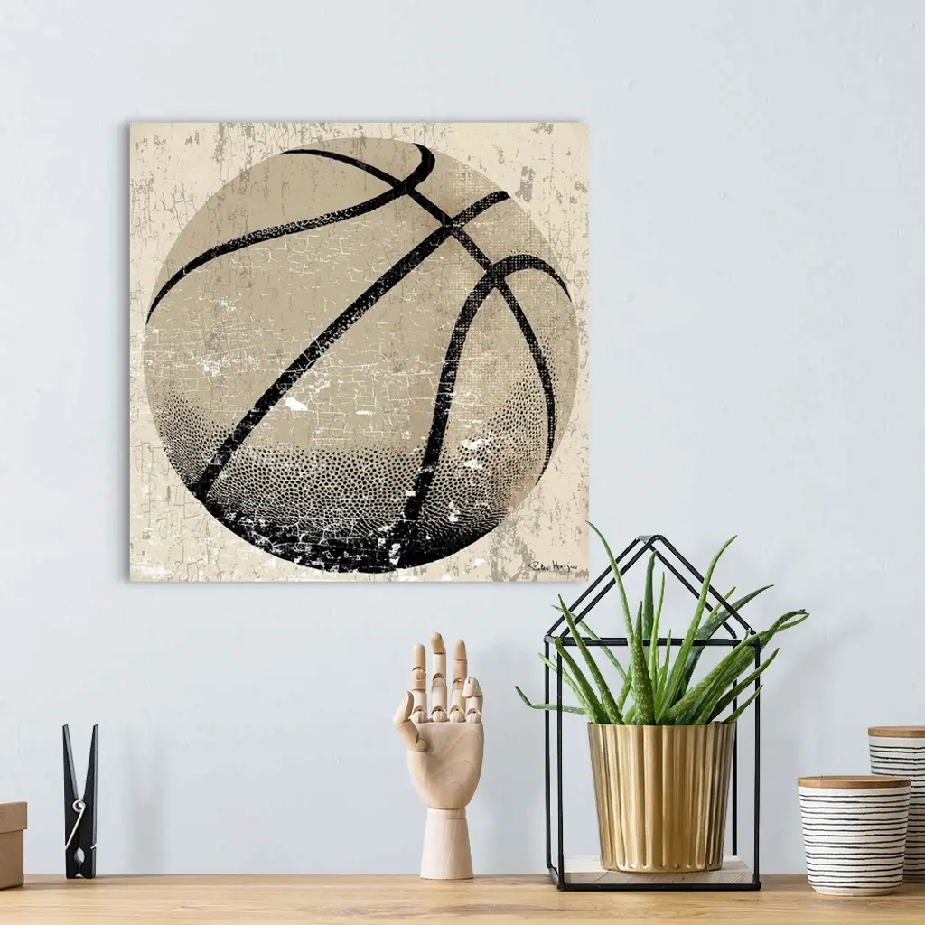 Vintage style wall art of an old distressed basketball on tan and sepia background.