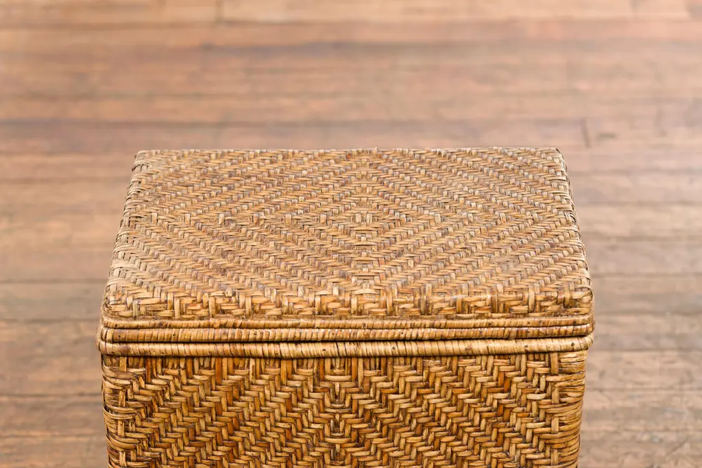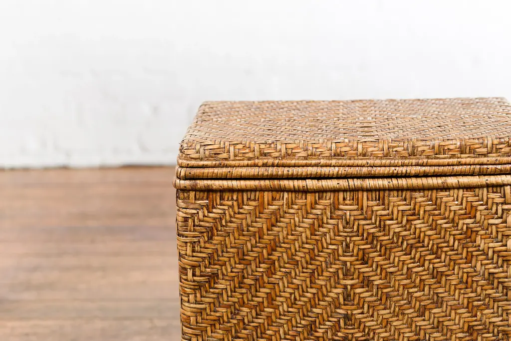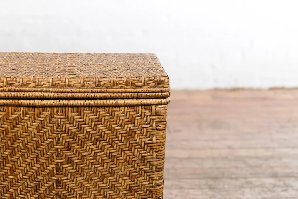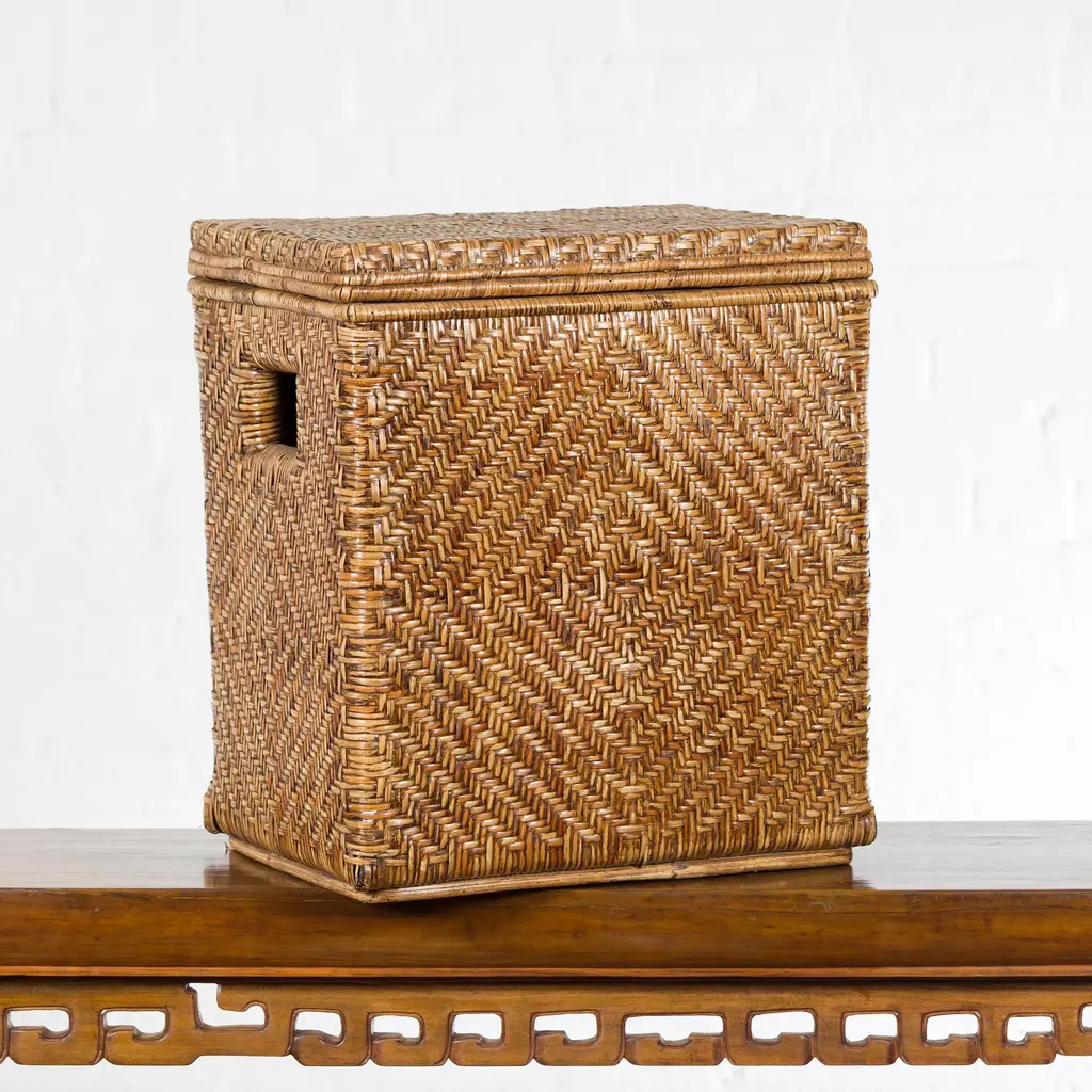 A vintage Burmese hand-woven rattan over wood lidded basket from the mid 20th century, with pierced handles. We have several available, priced and sold $490 each. Crafted in Burma during the midcentury period, this handwoven rattan basket, ideal to be used as a hamper, features a rectangular lid sitting above a linear body pierced on the sides with two handles. Convenient to store any items, from clothes to toys, this Burmese lidded basket will bring a touch of rustic authenticity to any home, whether placed in a bedroom, dressing room of child's room.