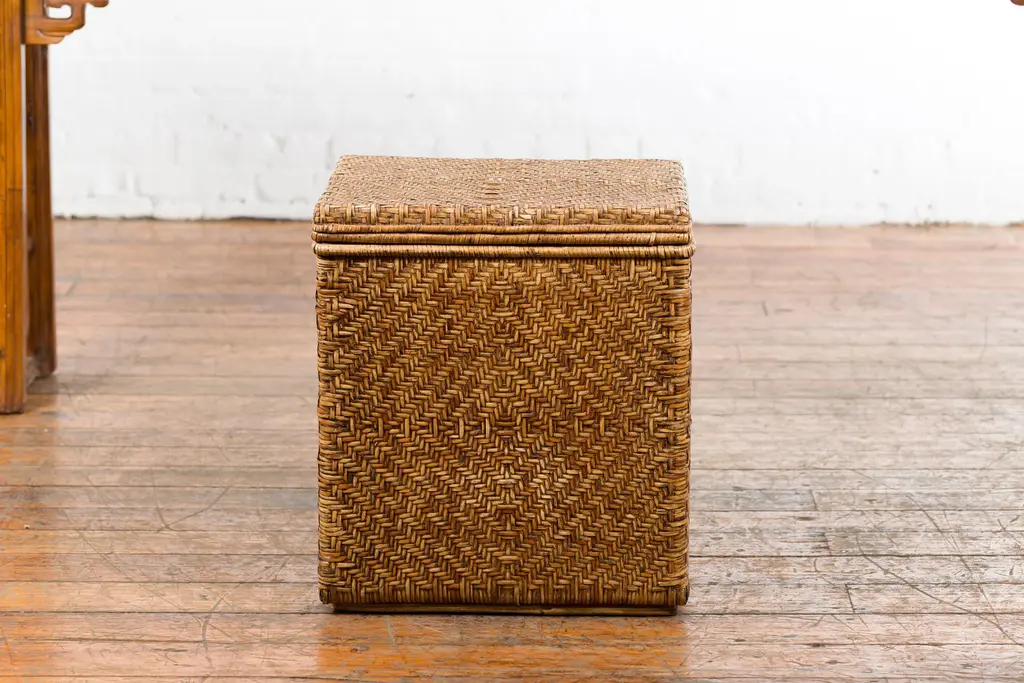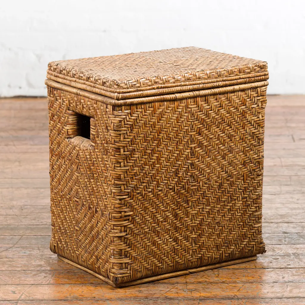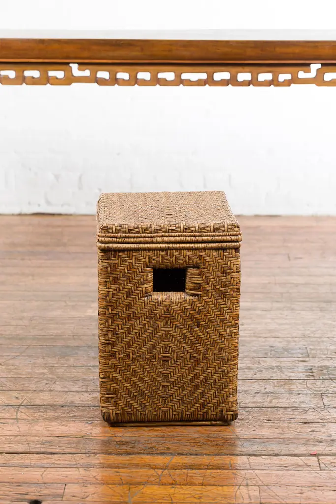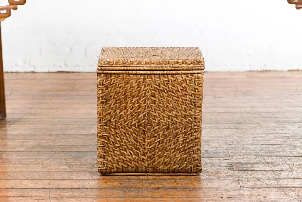 A vintage Burmese hand-woven rattan over wood lidded basket from the mid 20th century, with pierced handles. We have several available, priced and sold $490 each. Crafted in Burma during the midcentury period, this handwoven rattan basket, ideal to be used as a hamper, features a rectangular lid sitting above a linear body pierced on the sides with two handles. Convenient to store any items, from clothes to toys, this Burmese lidded basket will bring a touch of rustic authenticity to any home, whether placed in a bedroom, dressing room of child's room.