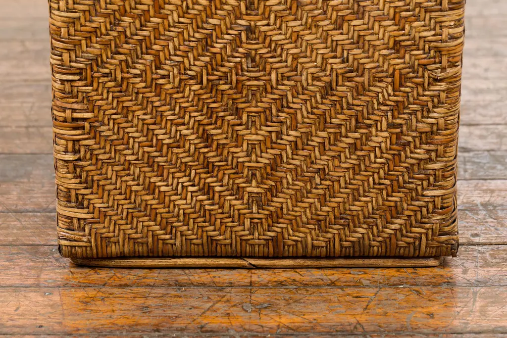 Vintage Burmese Hand-Woven Rattan Over Wood Basket Hamper With Pierced Handles