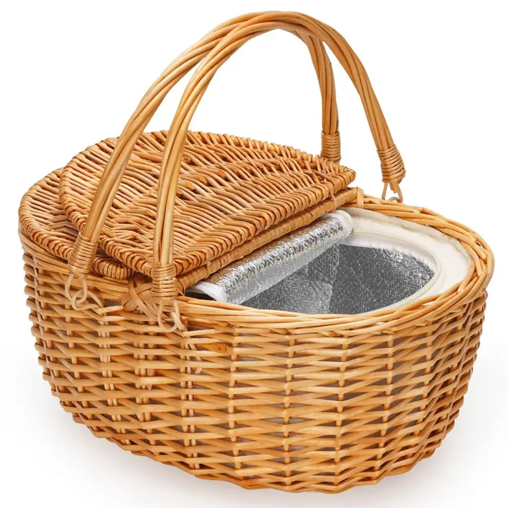 Vintage Style Wicker Picnic Basket, Cooler Basket With Blanket, Split Lid Picnic Basket With Foldable Woven Handles, Picnic - White W/cooler