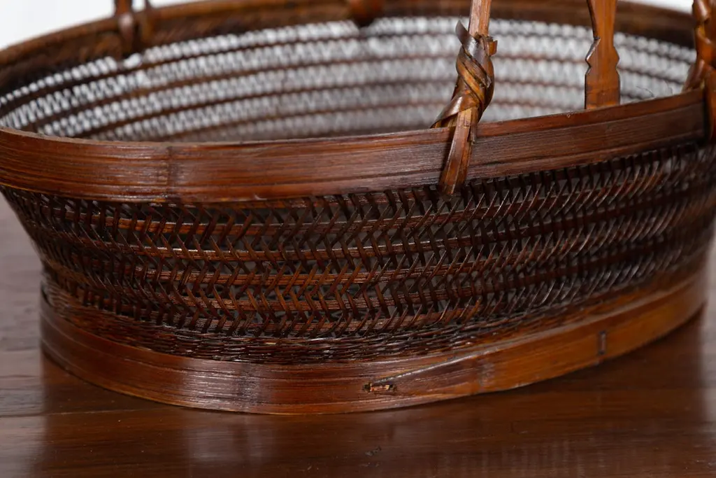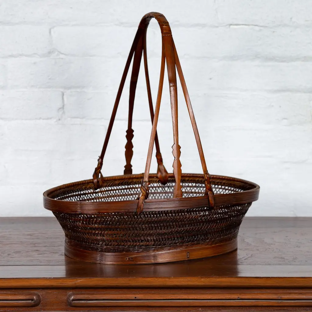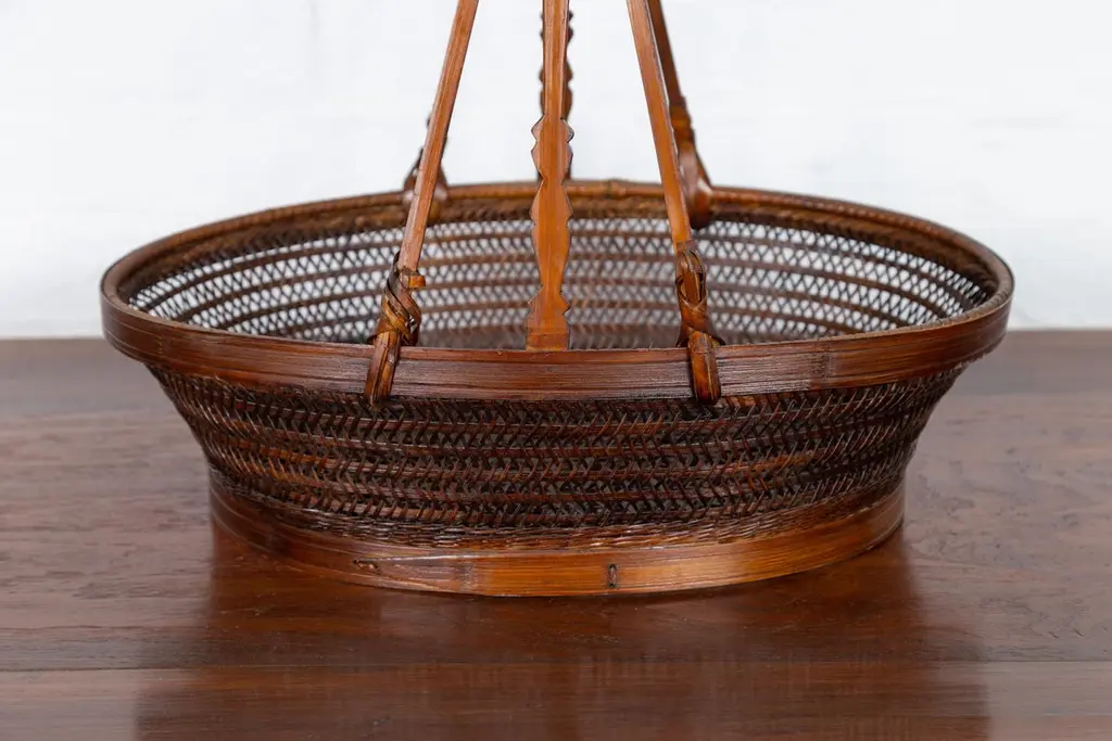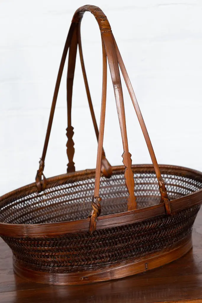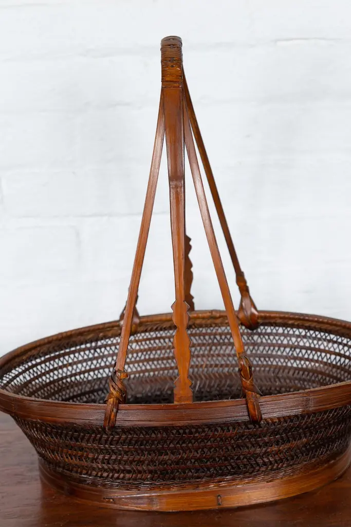 A vintage woven rattan carrying basket from the mid-20th century, with large handle. This mid-century vintage carrying basket, skillfully crafted from woven rattan and enhanced with a sturdy wooden frame, exudes a charming, rustic elegance. Featuring an oval body and topped with a distinctive large handle boasting tripartite extremities, this piece is a testament to practical design and traditional craftsmanship.Ideal for a variety of uses around the home, this basket can serve as a unique decorative element in a kitchen, where it can hold fresh fruits, vegetables, or dried flowers, adding a touch of natural beauty and a hint of rural charm. Alternatively, it can be placed in a living room or entryway as a catch-all for everyday items, or used in a guest room to hold towels and toiletries, offering a warm welcome with its appealing aesthetic.With its authentic appearance and functional design, this carrying basket from the 1950s not only serves as a versatile home accessory but also as a conversation piece that reflects a rich cultural heritage. It is perfect for those looking to infuse their space with a sense of history and a dash of artisanal flair.