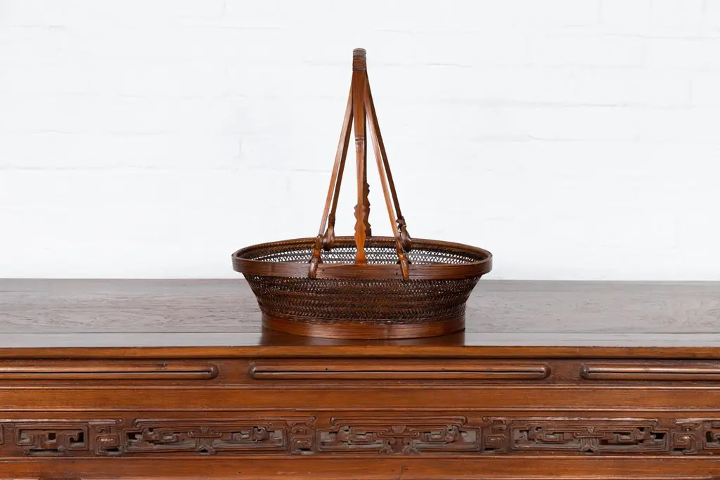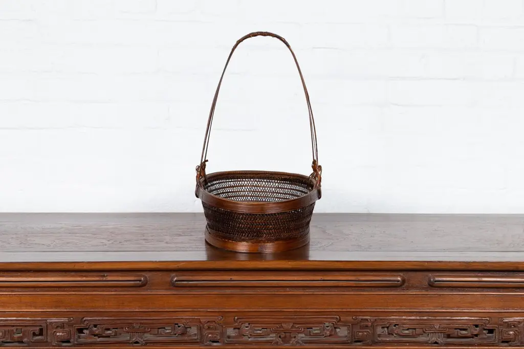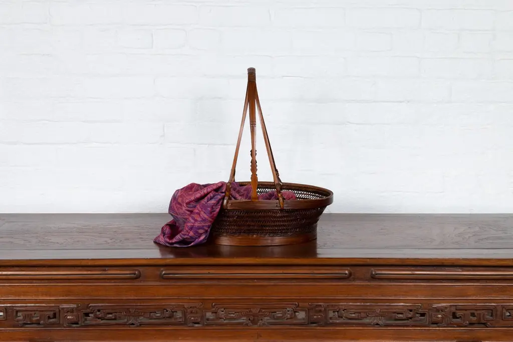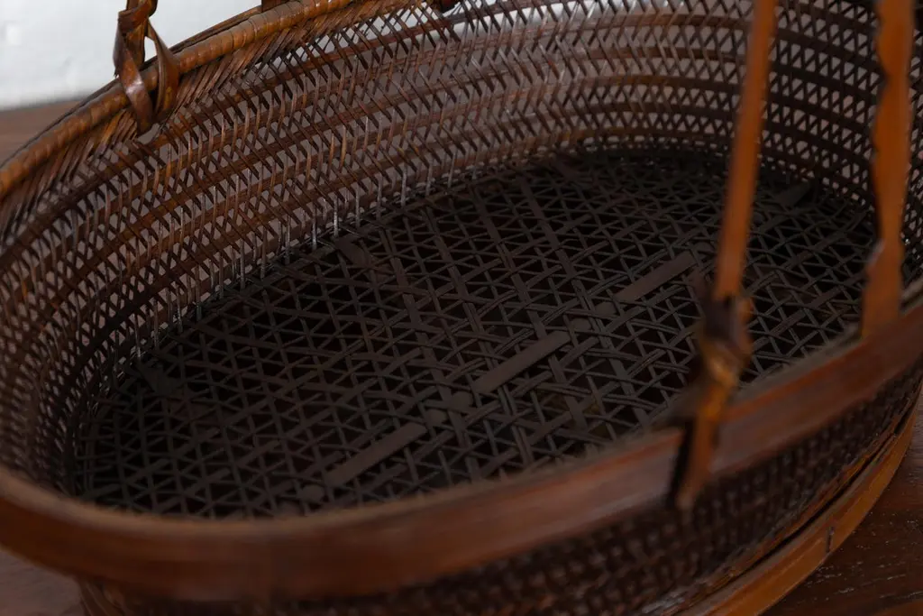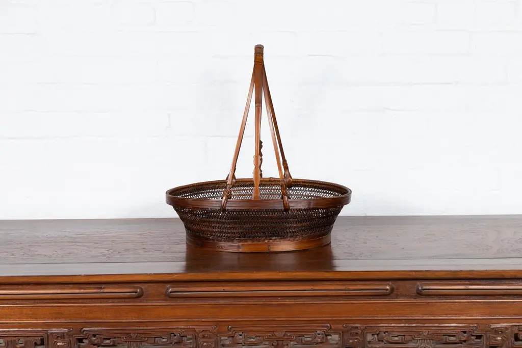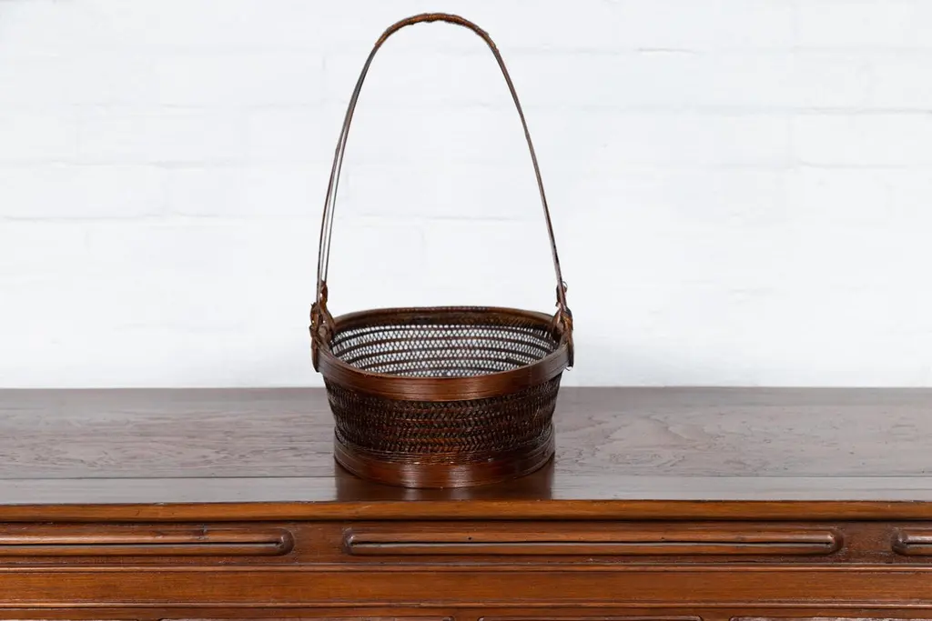 A vintage woven rattan carrying basket from the mid-20th century, with large handle. This mid-century vintage carrying basket, skillfully crafted from woven rattan and enhanced with a sturdy wooden frame, exudes a charming, rustic elegance. Featuring an oval body and topped with a distinctive large handle boasting tripartite extremities, this piece is a testament to practical design and traditional craftsmanship.Ideal for a variety of uses around the home, this basket can serve as a unique decorative element in a kitchen, where it can hold fresh fruits, vegetables, or dried flowers, adding a touch of natural beauty and a hint of rural charm. Alternatively, it can be placed in a living room or entryway as a catch-all for everyday items, or used in a guest room to hold towels and toiletries, offering a warm welcome with its appealing aesthetic.With its authentic appearance and functional design, this carrying basket from the 1950s not only serves as a versatile home accessory but also as a conversation piece that reflects a rich cultural heritage. It is perfect for those looking to infuse their space with a sense of history and a dash of artisanal flair.