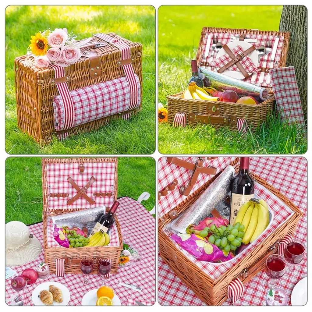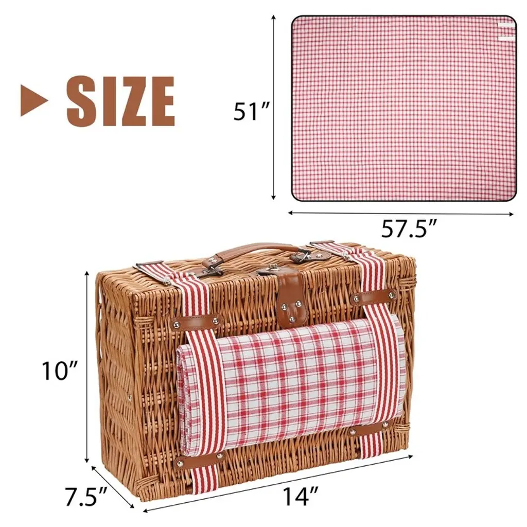 Wicker Picnic Basketwaterproof Picnic Blanket, With Cooler, With Tableware Set, Christmas, Thanksgiving Gift Baskets - Red Check