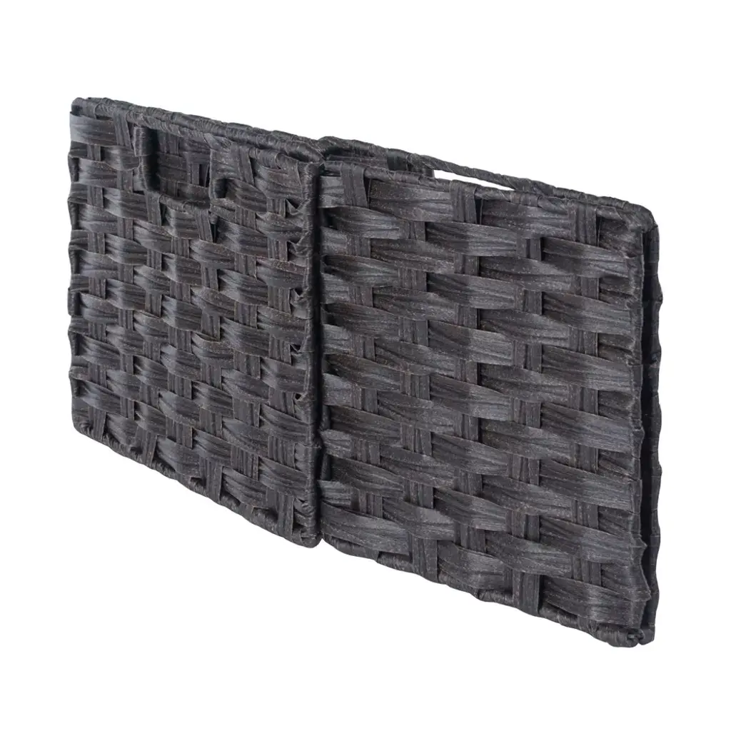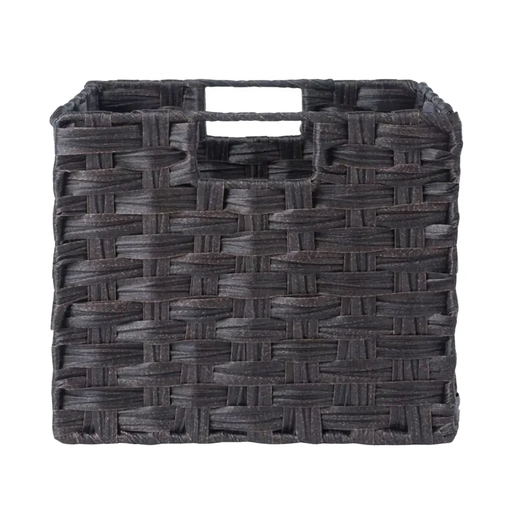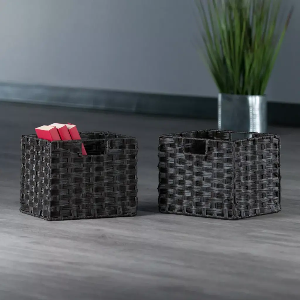 The Winsome Wood Melanie 2-piece Foldable Basket Set makes it easy to organize anywhere with charm and style. Two baskets measuring 10.24""W x 11.02""D are ideal for managing toys, magazines, dishtowels, or simply keeping the clutter of odds and ends neatly out of sight. Woven in durable flat polypropylene, the baskets will stand up to a steamy bathroom or lots of mileage in the kids' rooms. Just wipe clean with a damp cloth. They'll fit standard bookshelf height and depth and fold for easy storage when you don't need them. Cut-out handles on either side make them easy to move from place to place. Finished in a rich chocolate, these handy organizers will look great in either a contemporary or rustic farmhouse setting. Ships in one box, prompt up and ready to use. Also available in a 3-piece set or a 3-piece mixed set with 2 small and 1 large basket.