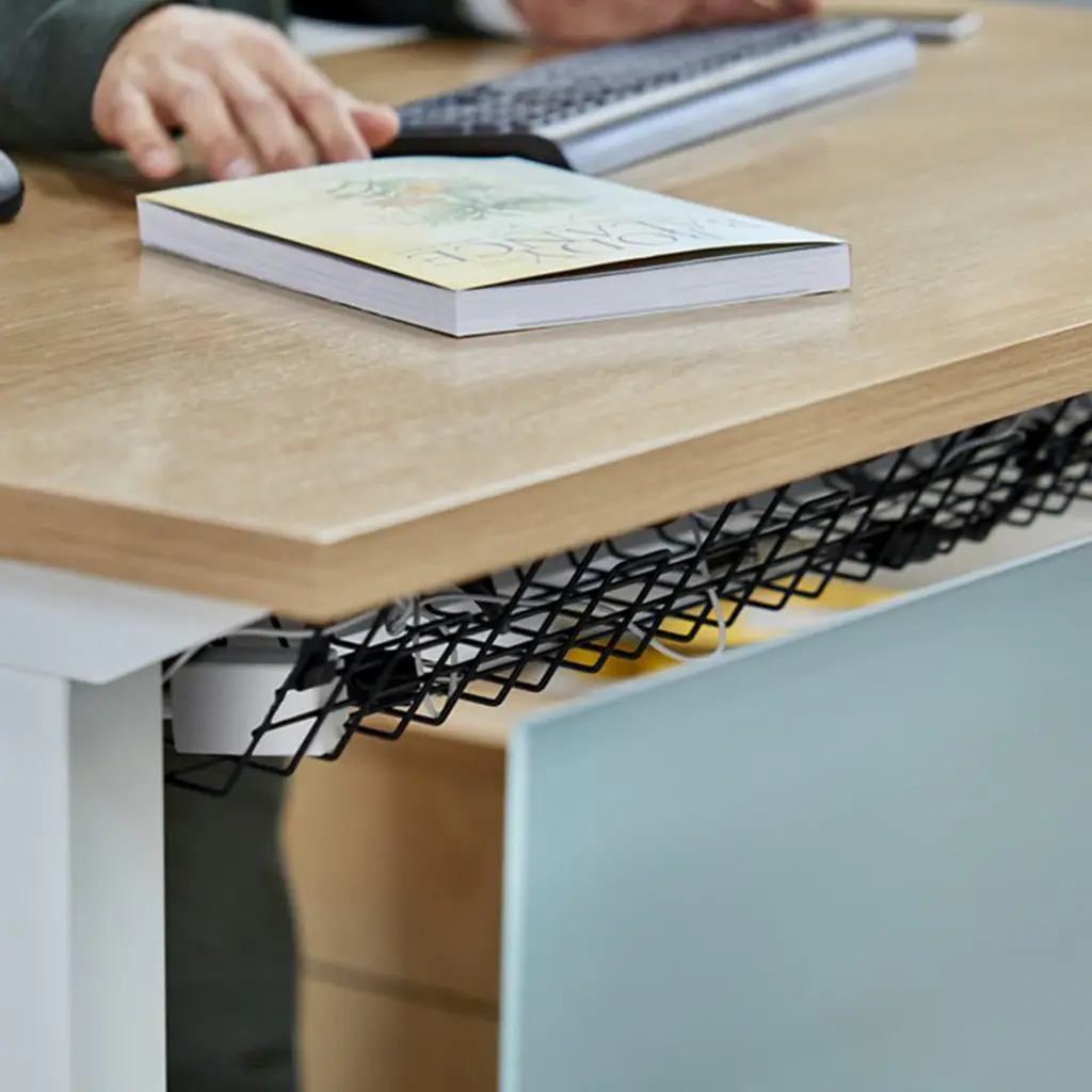 Neatly tuck wires away to keep your desktop tidy and your feet free to move. This basket cleverly conceals cords right beneath your worksurface.