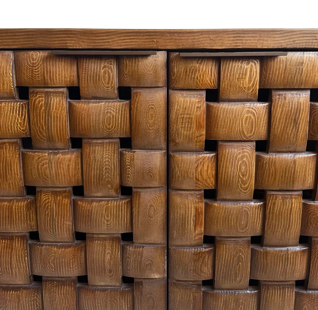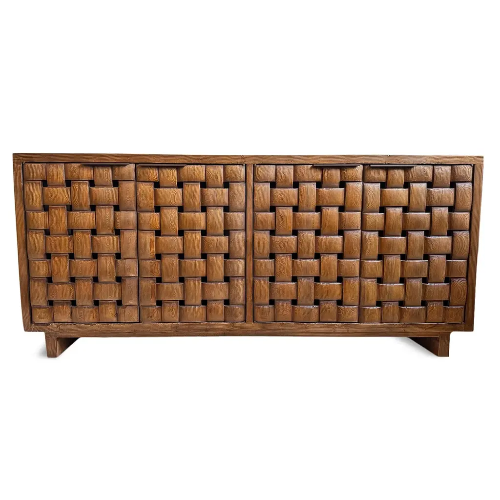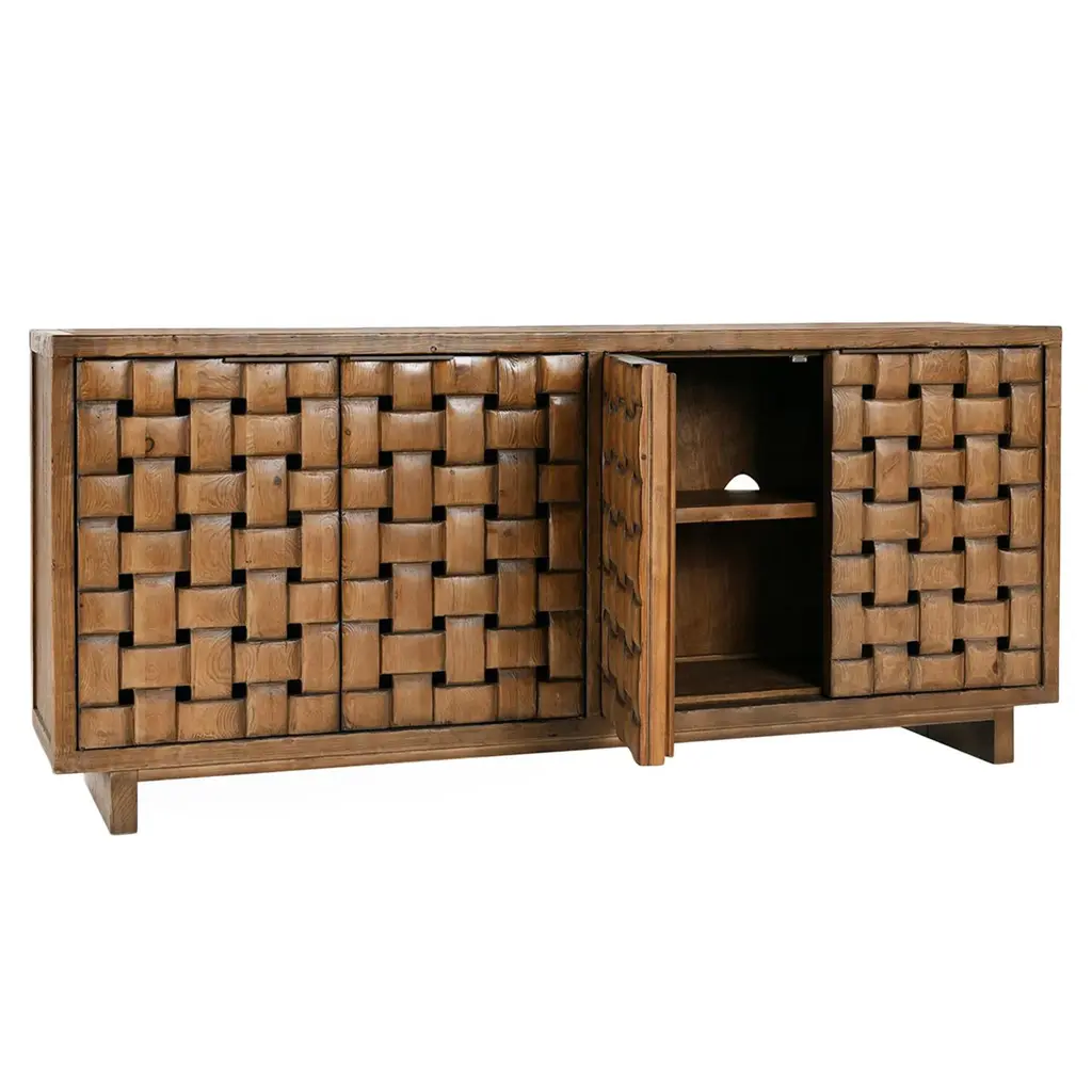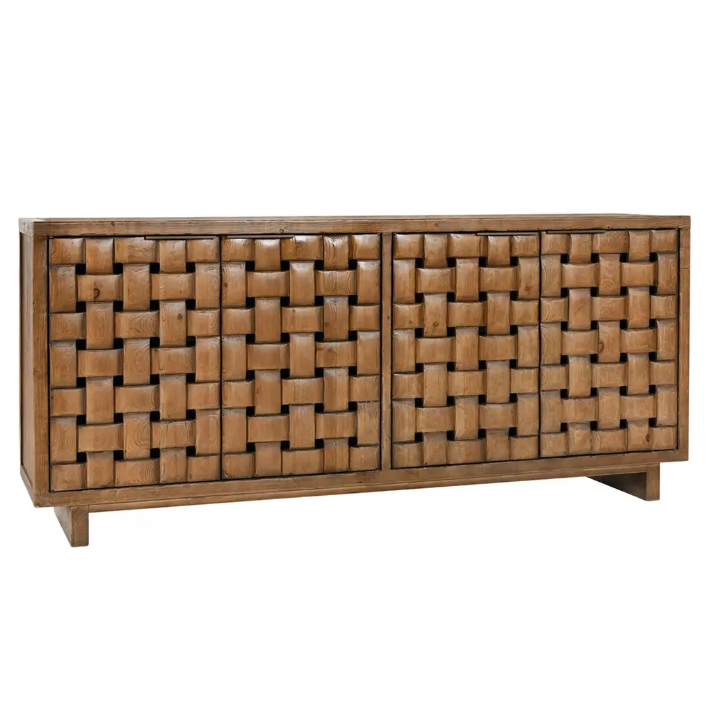 Solid pine wood sideboard with masterfully crafted basket weave design on four doors. Smooth waxed wood finish with beautiful warm tones. Cutouts in back for cord management if needed. Weighs approx. 240 lbs.