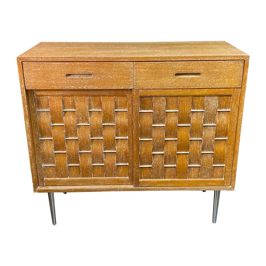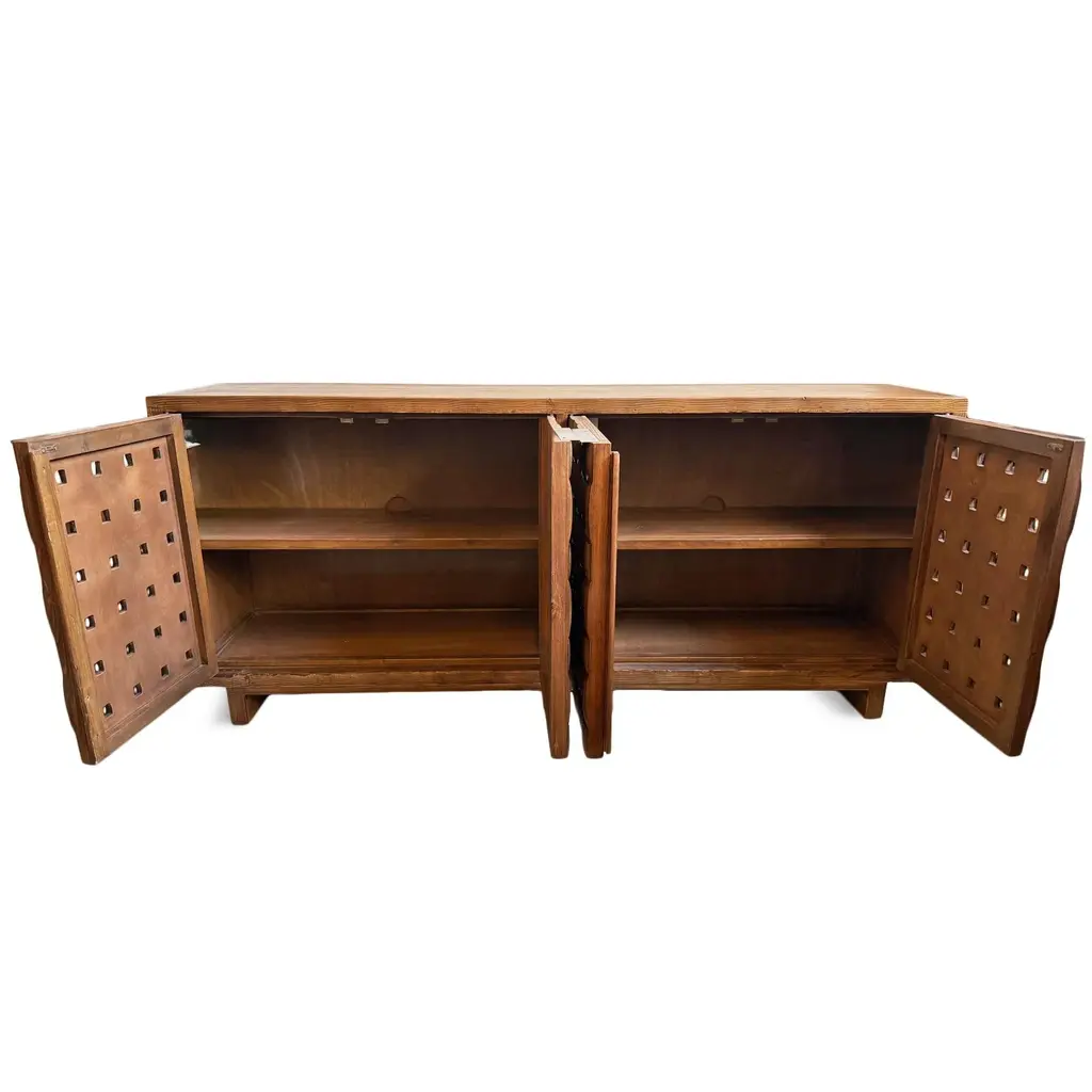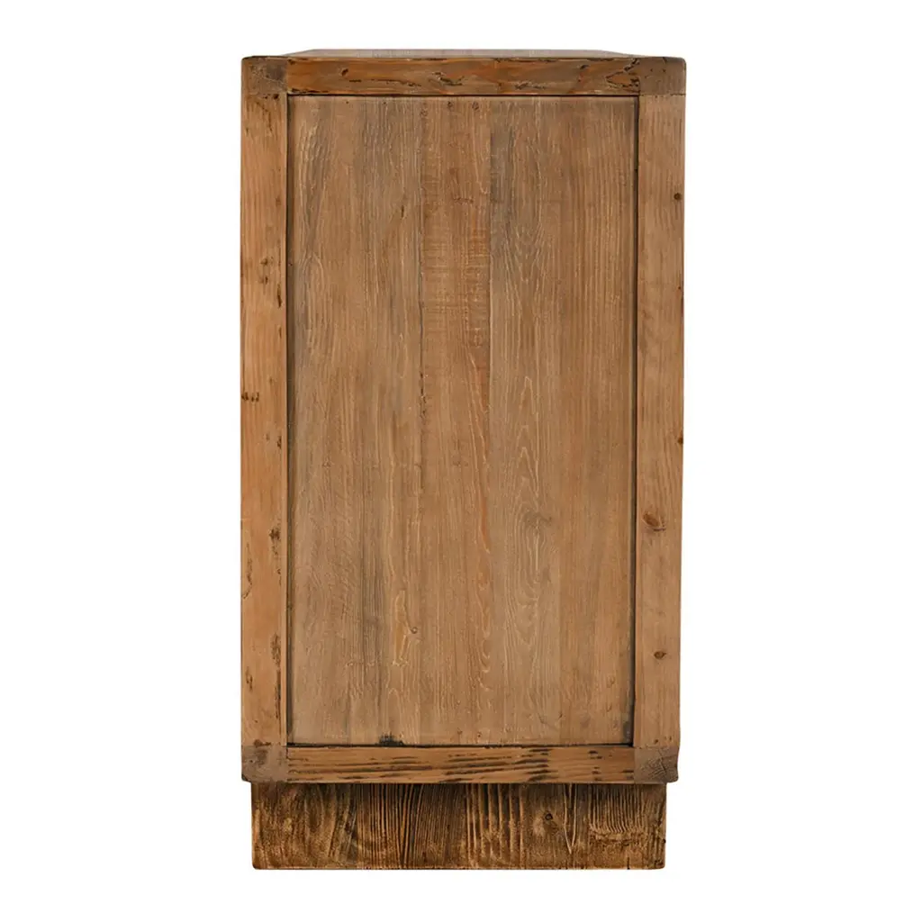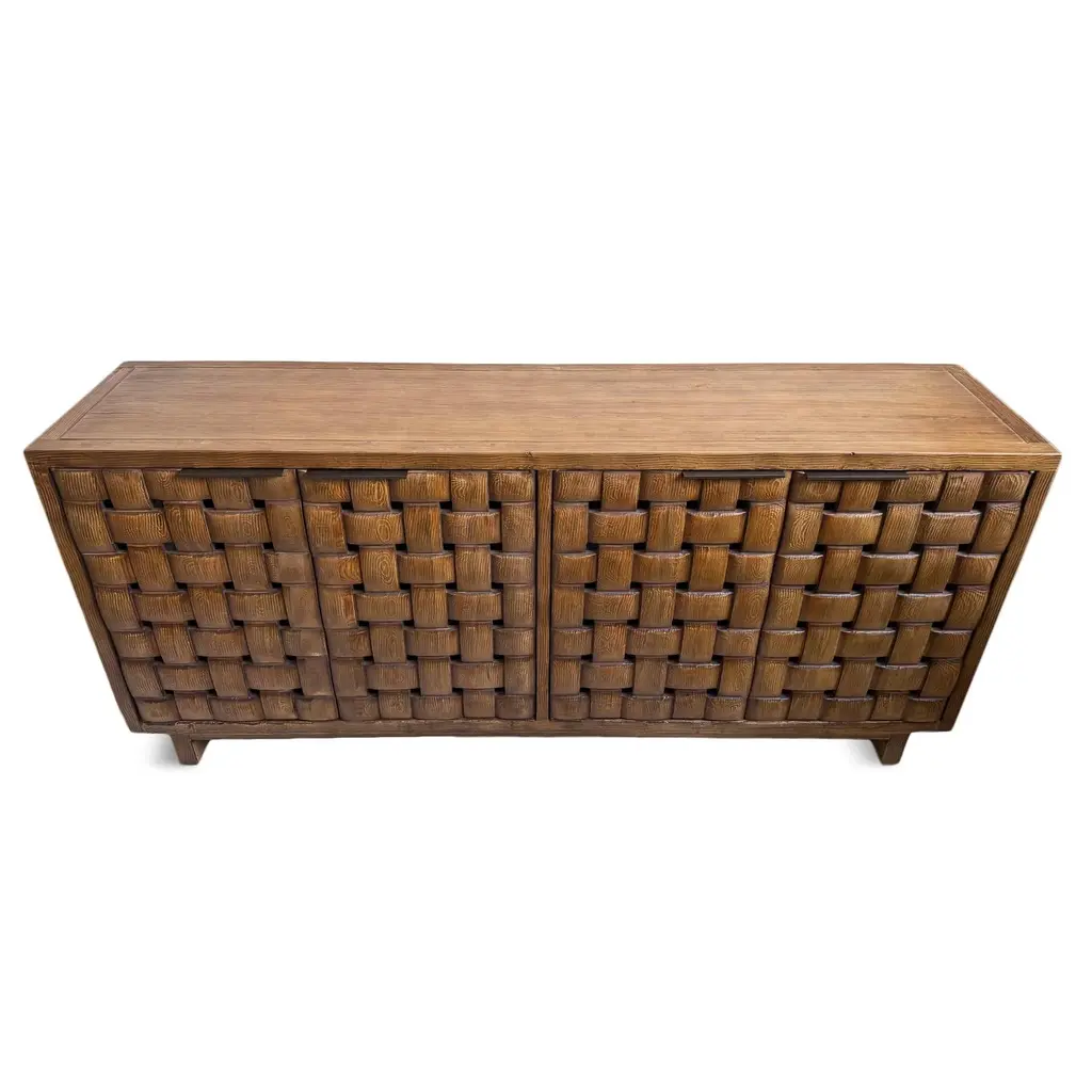 Solid pine wood sideboard with masterfully crafted basket weave design on four doors. Smooth waxed wood finish with beautiful warm tones. Cutouts in back for cord management if needed. Weighs approx. 240 lbs.