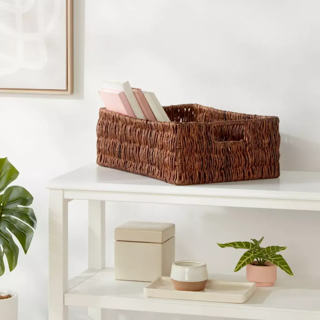 Display your favorite books or decorative items in traditional style with the Woven Banana Bark Folio Bin from Brightroom™. Woven with banana bark, this natural-shade folio bin works well in a variety of spaces. This rectangular media bin features an open top to make it easy to stash away and remove the contents, and comes with cut-out handles for easy carrying and movement around your home. Brightroom™: See your space in a new light.