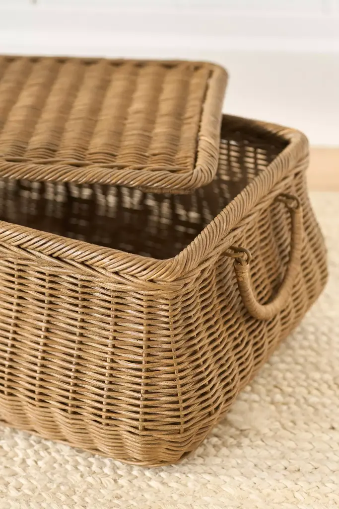This rustic-inspired basket is as functional as it is chic, with handles and a matching lid.