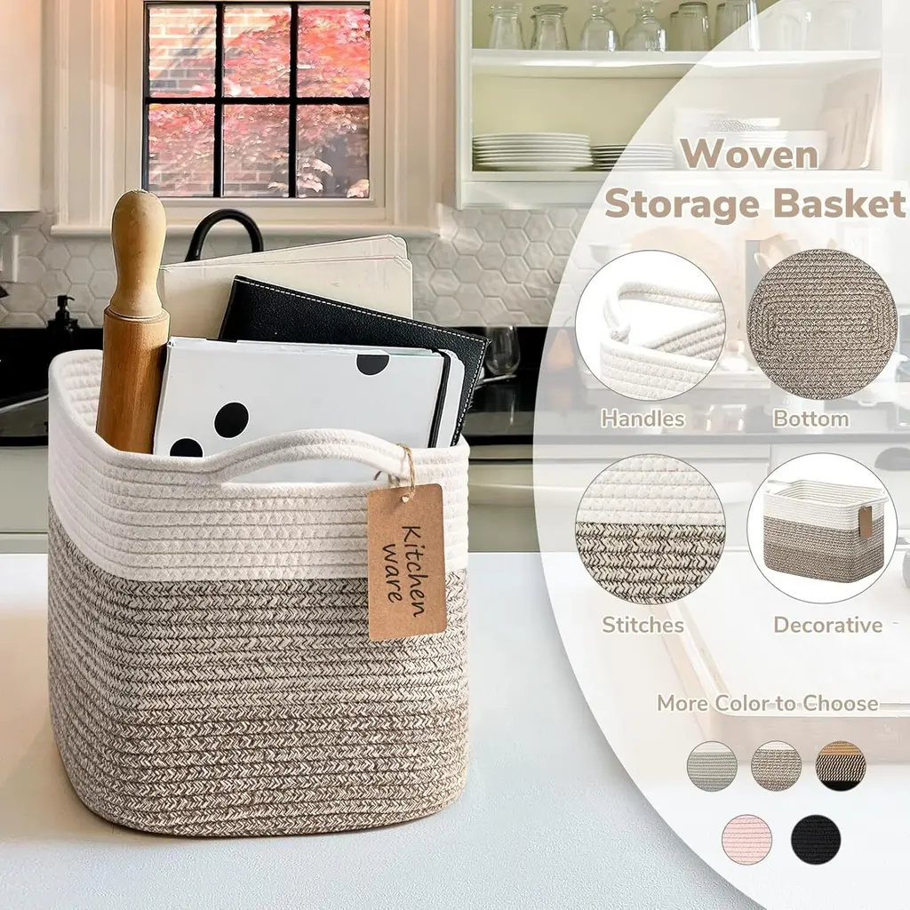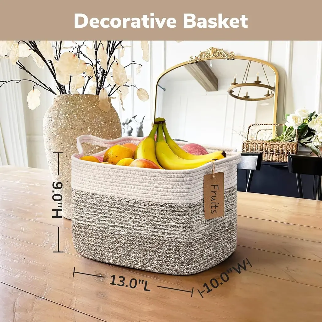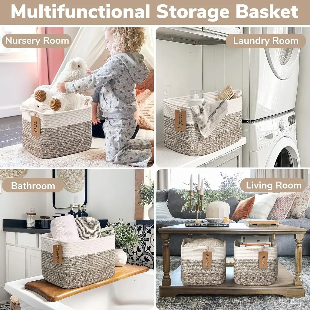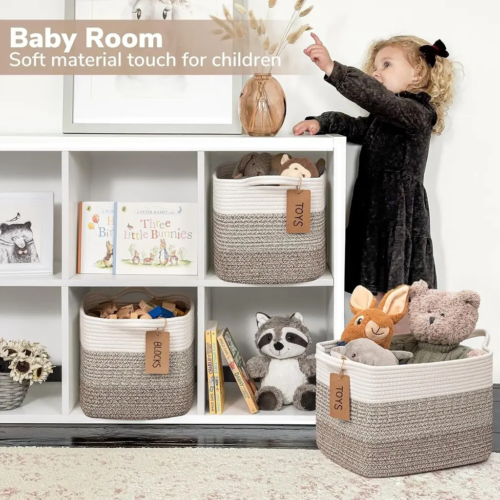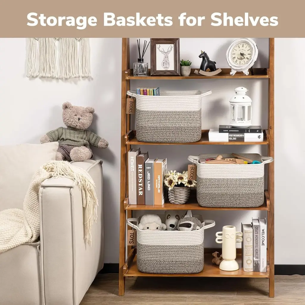 Woven Rope Storage Basket Set Of 3, Closet Baskets For Toys, Books, Rectangle Decorative Baskets - 10"d X 13"w X 9"h - White Brown