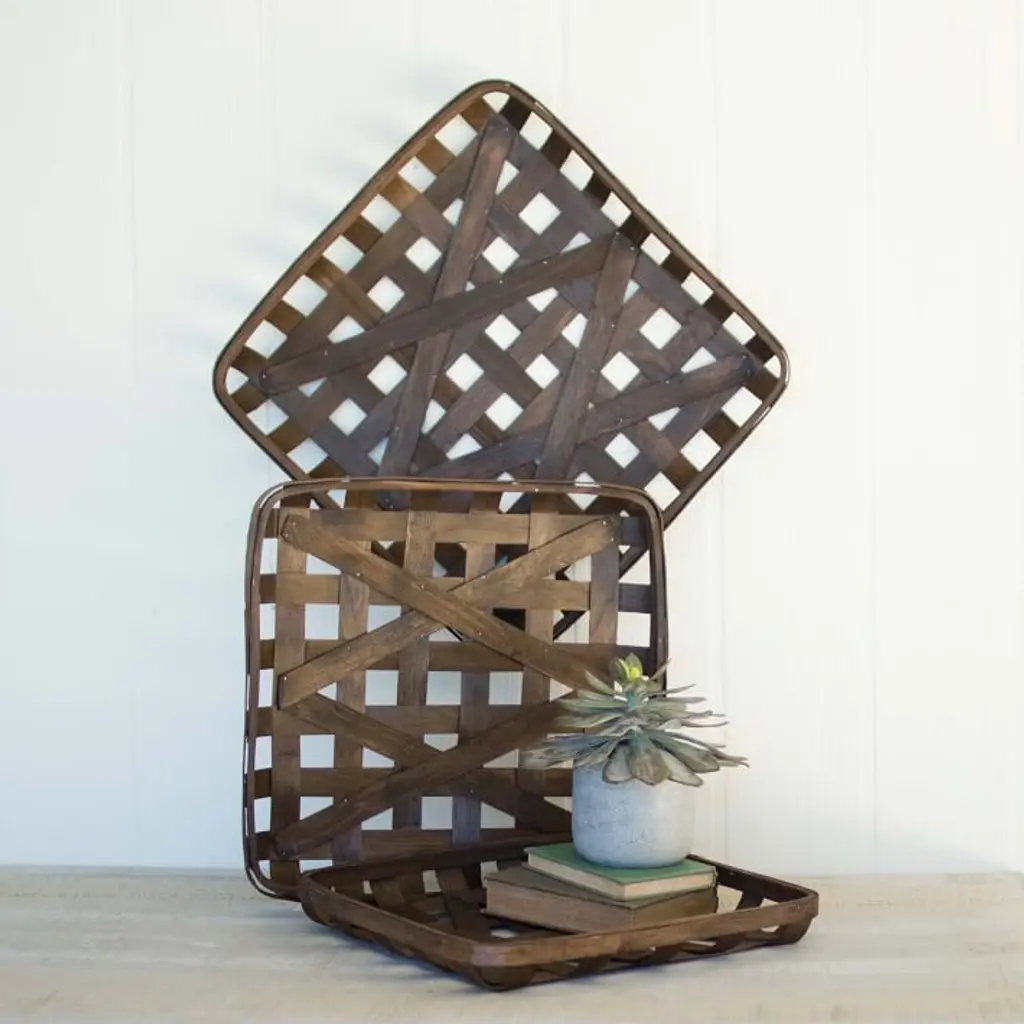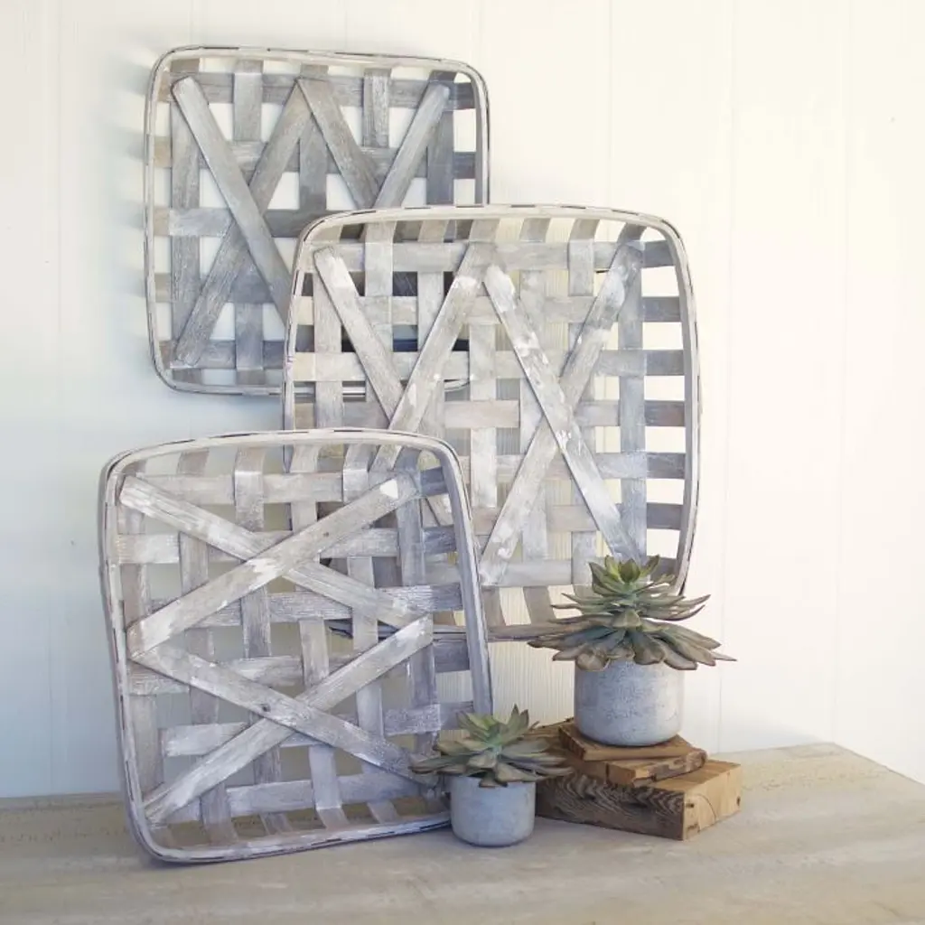 Split wood baskets. Can be hung on wall. Stackable. Sold as a set of 3. Made in China.