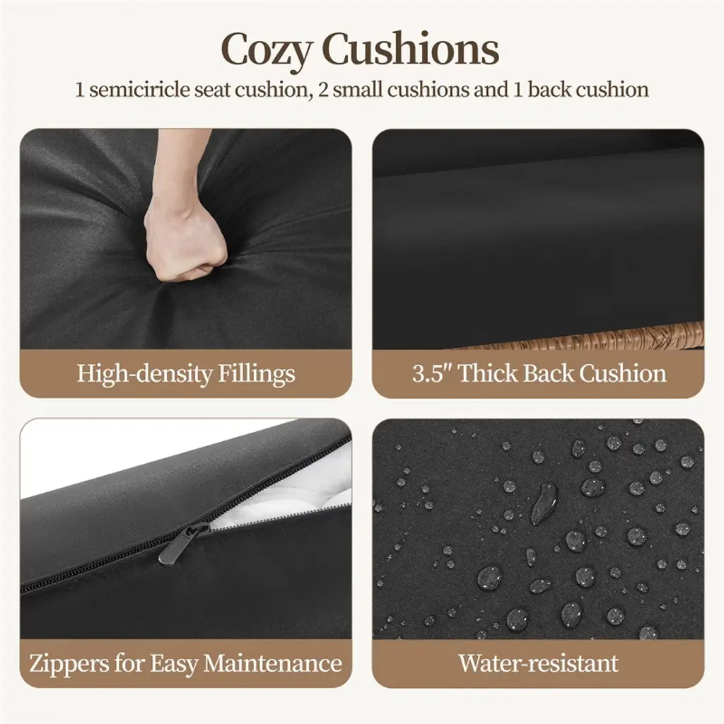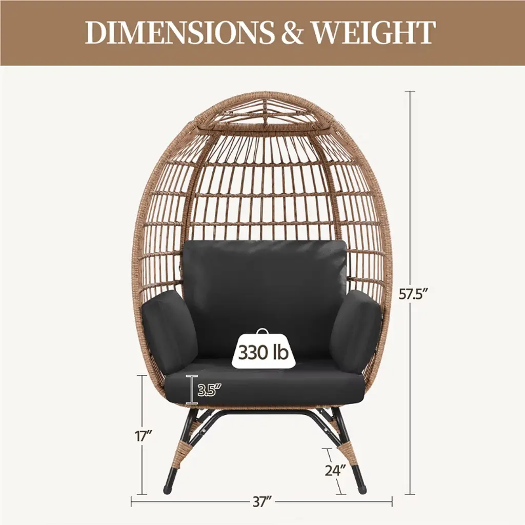 Complement your indoor or outdoor living space with this Holiday Style Basket Lounger, a perfect blend of comfort and style. This rattan basket lounger exudes a chill vacation vibe, offering a generous and cozy hideaway with soft cushions in an inviting egg shape. The spacious nest-like design provides a perfect spot for reading, meditation, or simply unwinding. Crafted from all-weather PE rattan and supported by robust iron metal, this lounger is durable and can withstand the elements. With detachable cushion covers for easy cleaning, adjustable foot pads for stability on any surface, and user-friendly assembly, this lounger ensures a hassle-free and enjoyable lounging experience. Embrace the cool and cozy ambiance with this stylish and comfortable egg lounger, designed to enhance your relaxation wherever you place it. * Specifications: Color: Ivory, BlackMaterial: HDPE, Powder-coated Iron, PolyesterDimension: 37" L × 32.5" W × 57.5" HSeat: 28.7" Depth × 35" W × 43" HEach Cushion: 3.5"Max Weight Capacity: 330 lb Please see the image for exact measurements.Please allow ± 1.5/ 0.6" measurement tolerance.Please do not overload this egg basket chair.