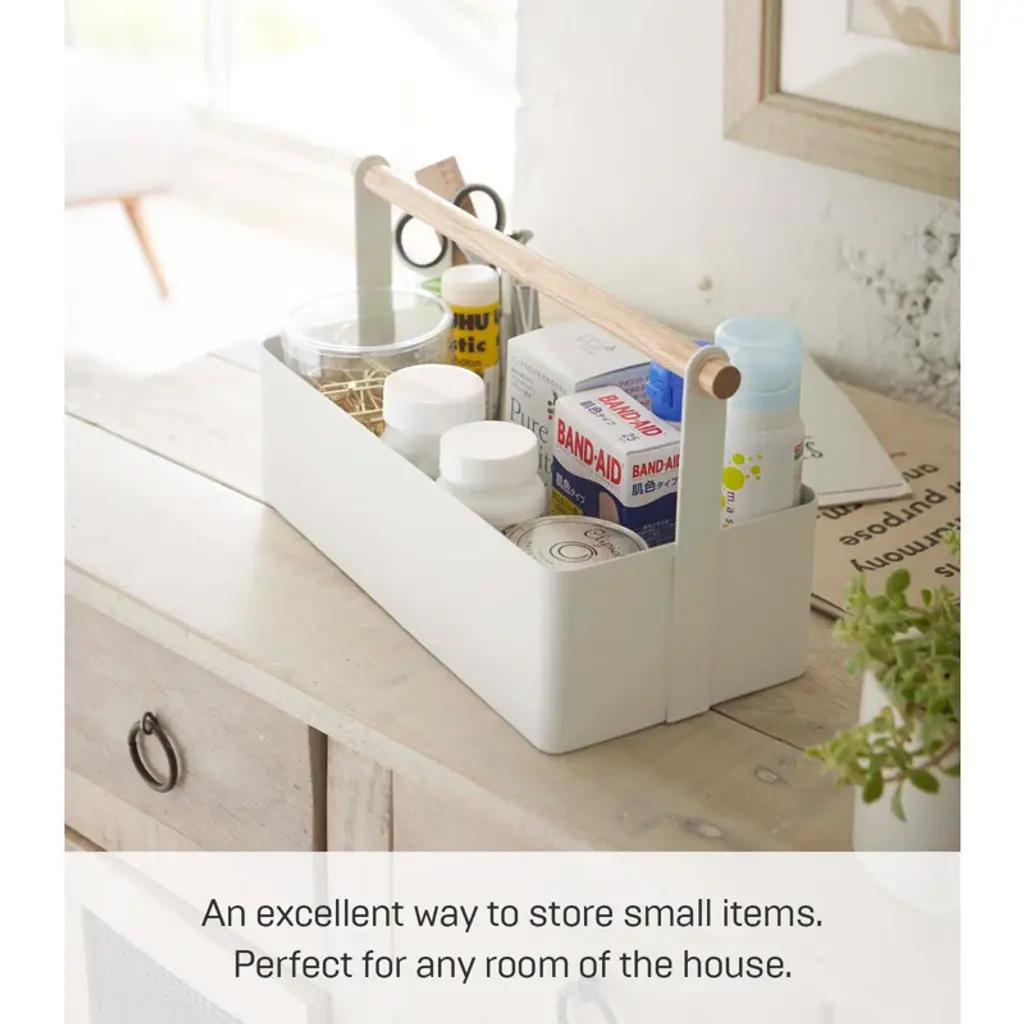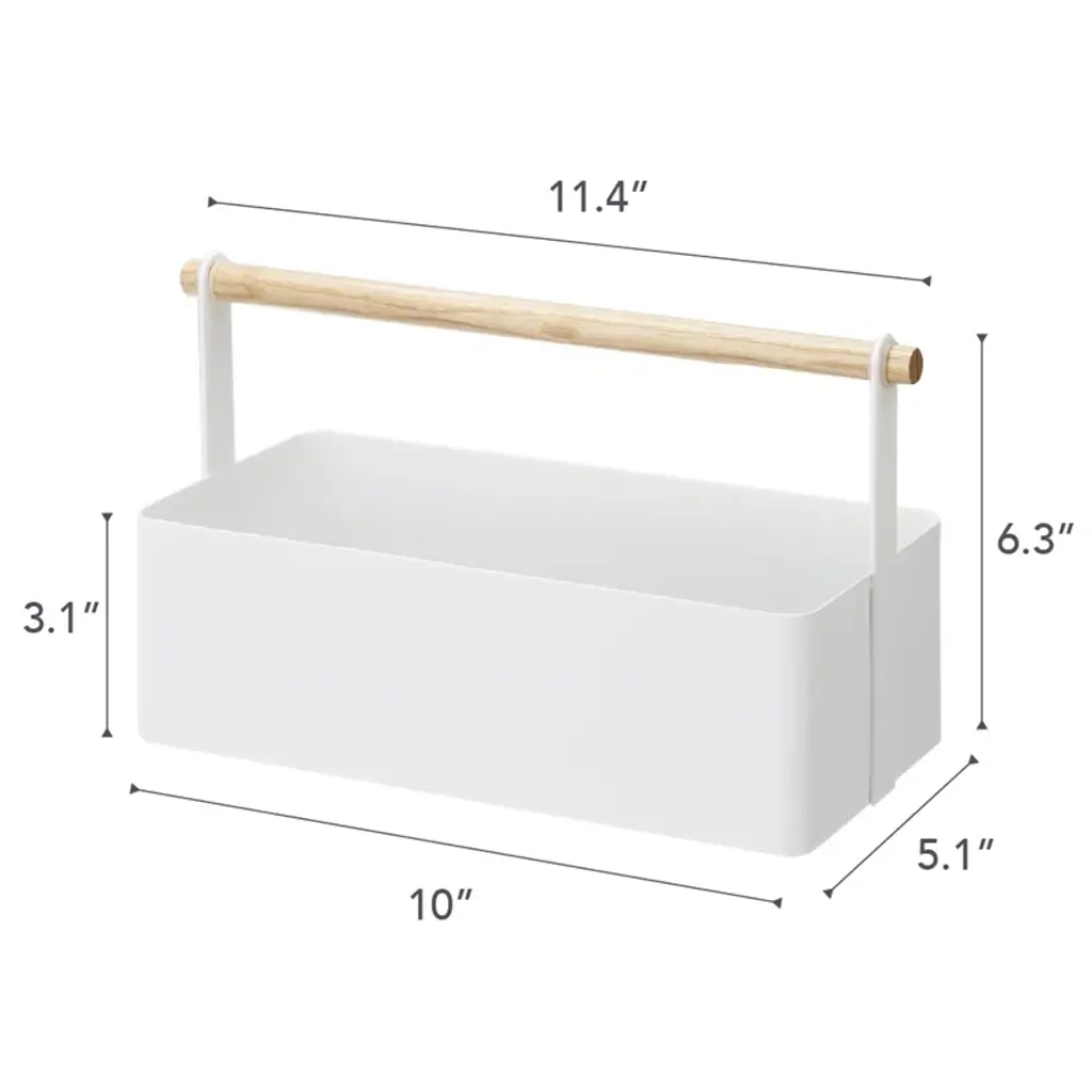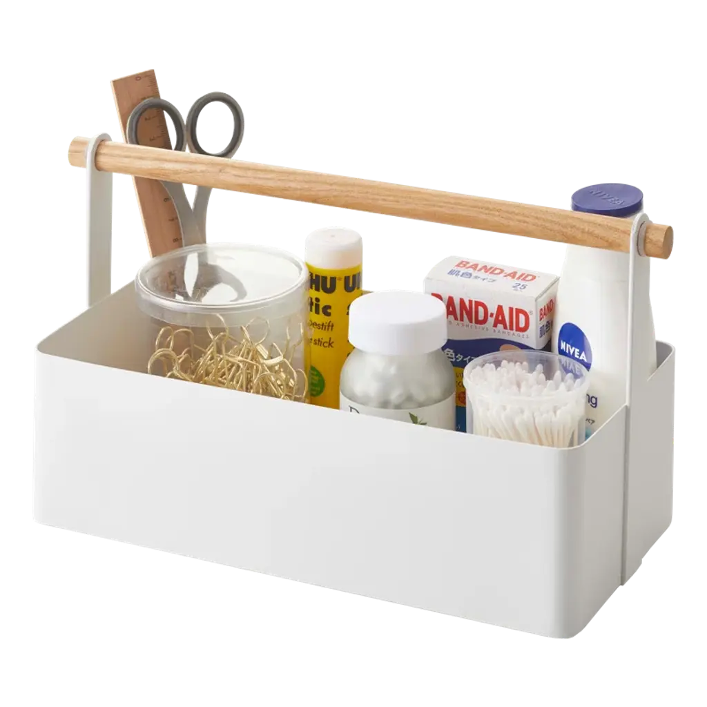 Say hello to organized bliss with this metal storage caddy. Crafted with a sleek white metal frame and natural wooden handle, it's ready to mix and match with any decor. Water and rust-resistant, it's built to last and ready to handle whatever you throw at it. Whether you're tidying up after craft time or corralling kitchen clutter, this caddy's got you covered. Plus, it's portability makes clean-up a breeze.