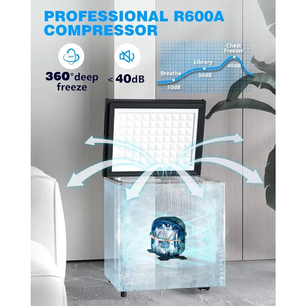 ZAFRO 1.8 Cu. Ft Chest Freezer .Energy-saving freezer with removable basket and 7 adjustable temperature settings (-7.6°F to 6.8°F). Features quiet operation (<40dB), easy-defrost drainage, and space-saving design. Perfect for homes, dorms or offices.