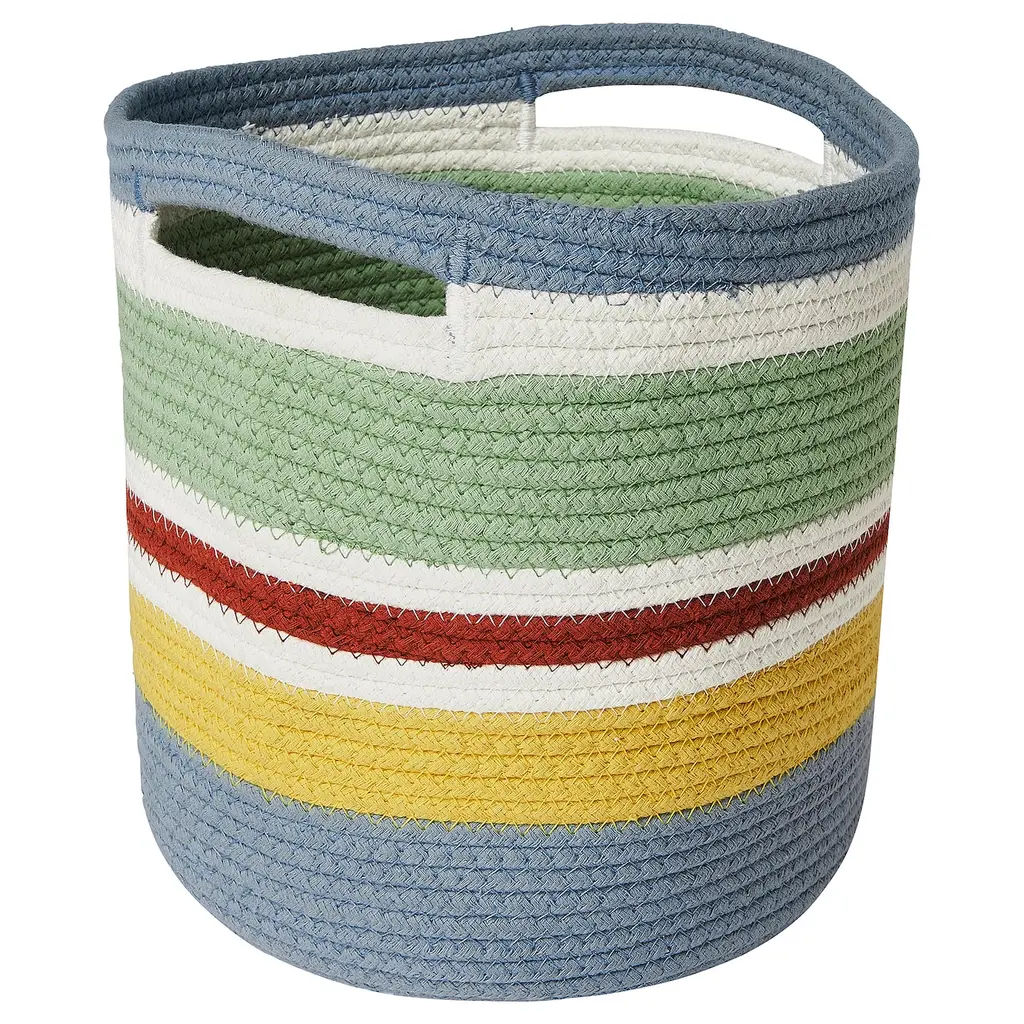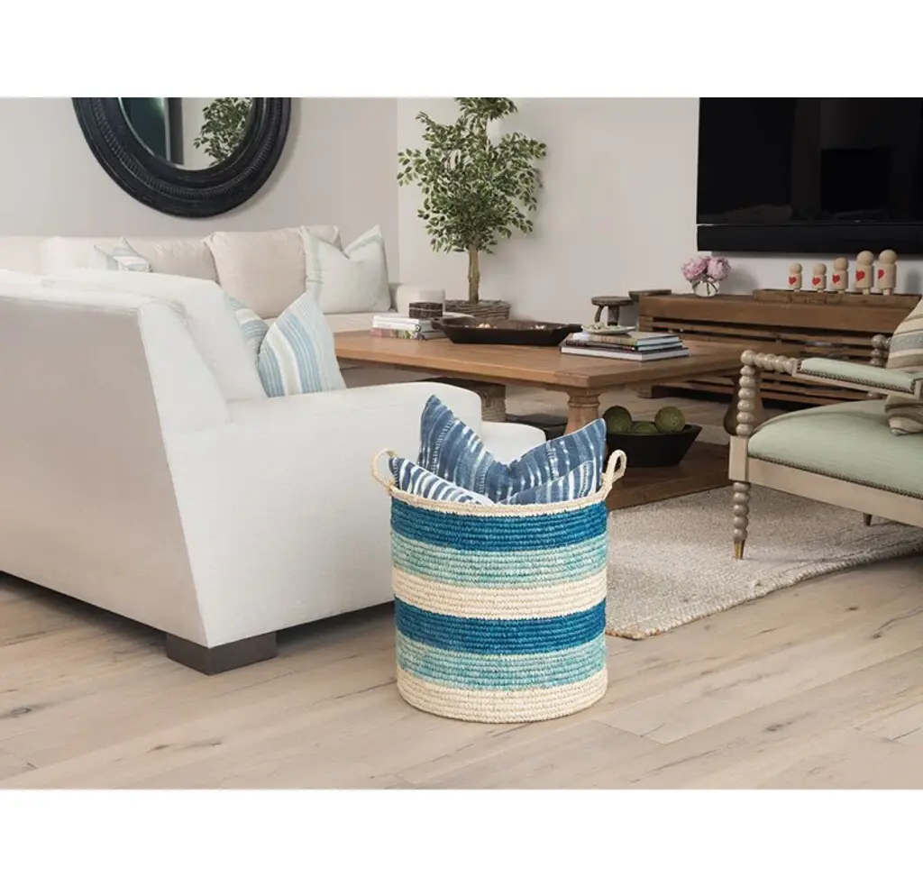 Artisans outdid themselves when creating this hand-woven round sisal storage basket with handles. The teal, beige, and navy blue are ideal for any coastal home décor color palette. Use it for linens, blankets, toys, or even as a cachepot for your indoor plants.