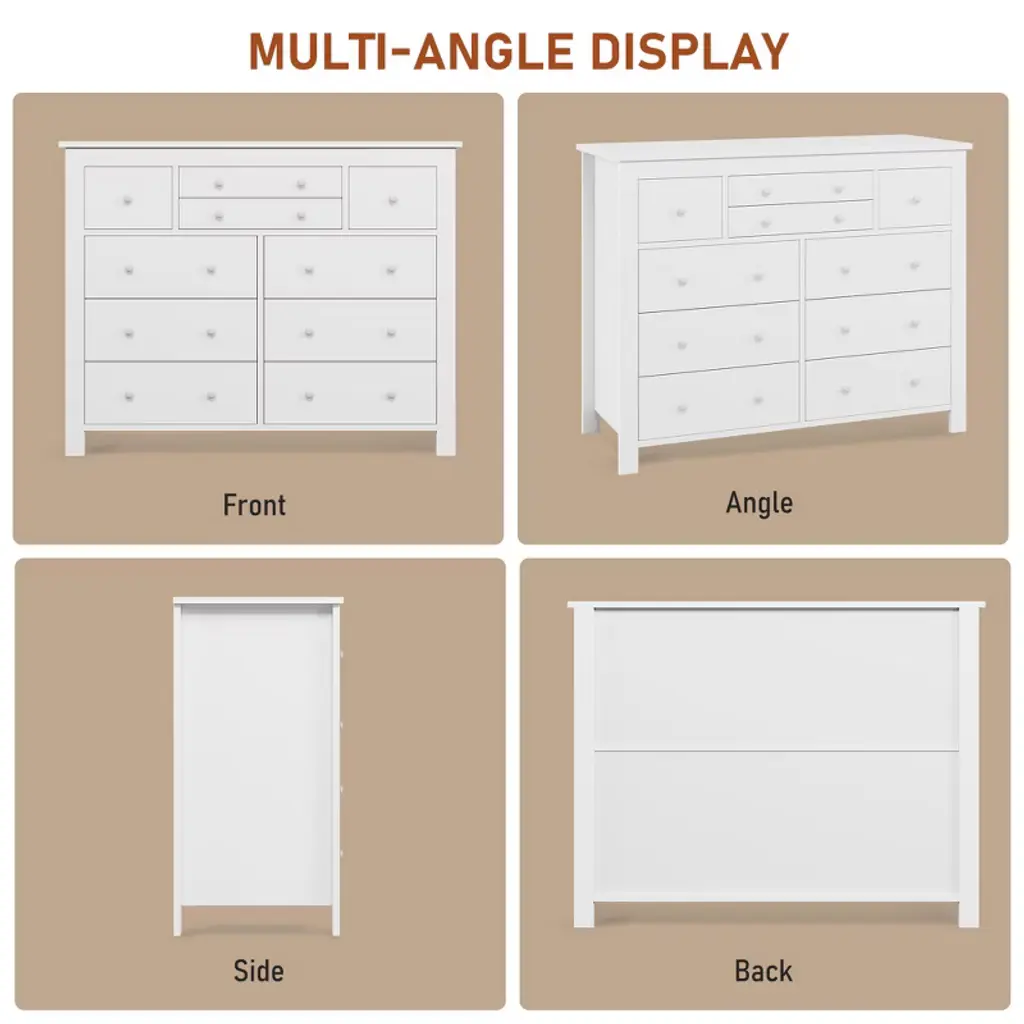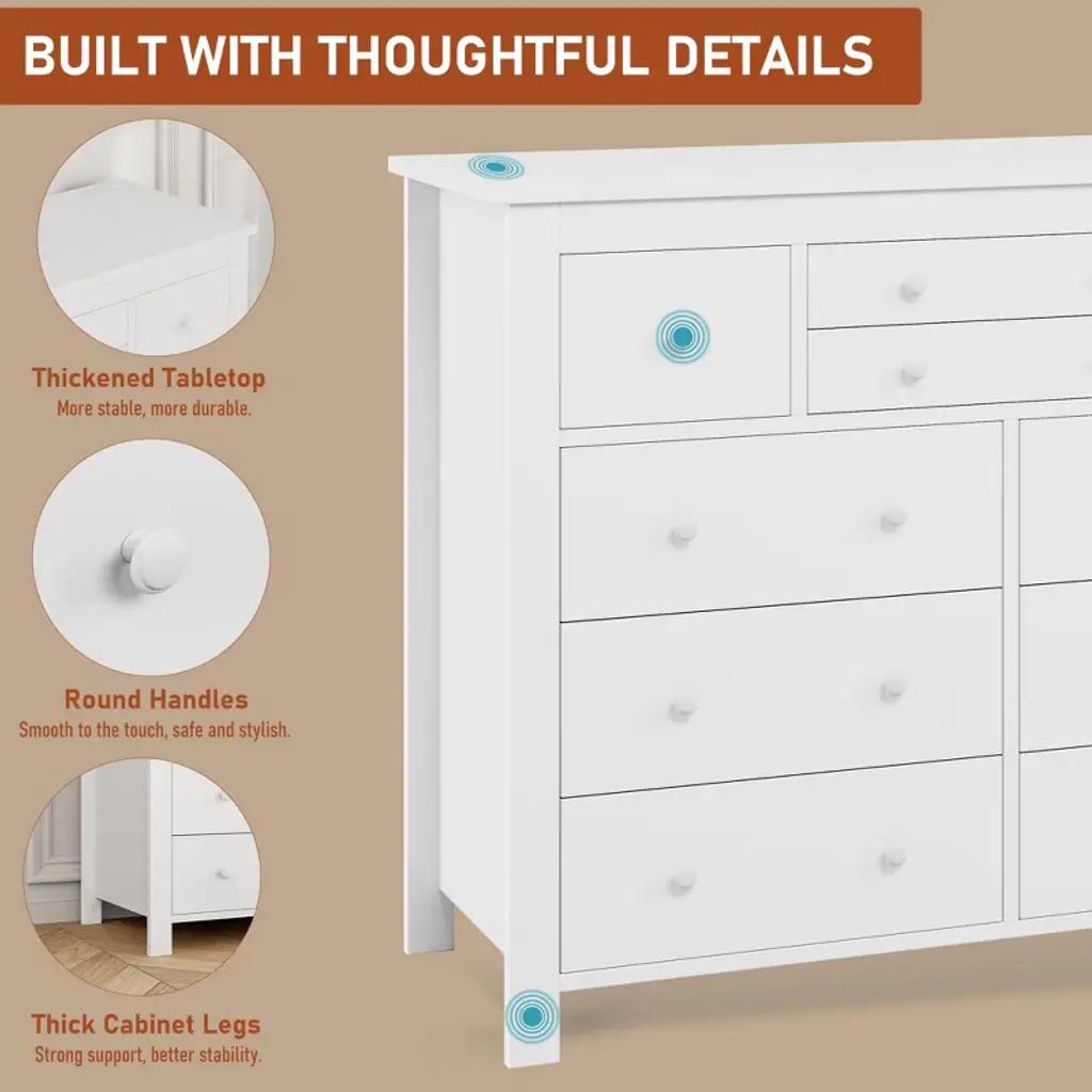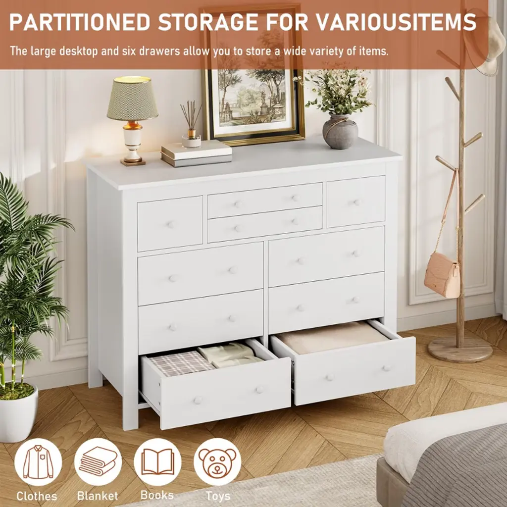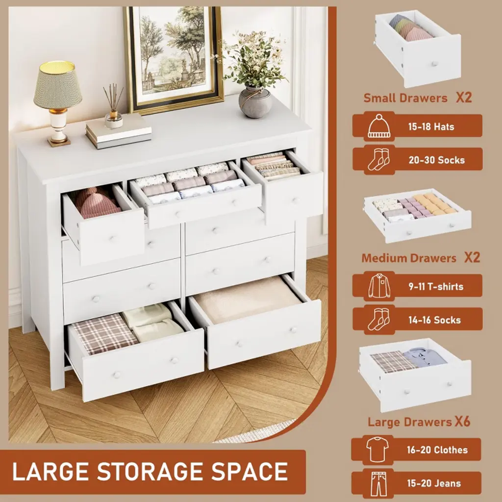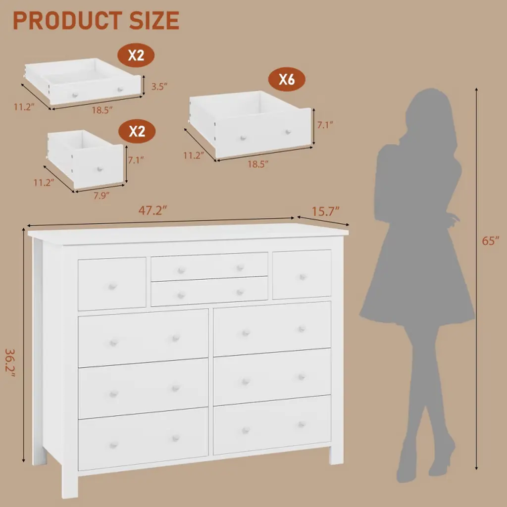 10-Drawer Dresser, Modern Wooden Chest of Drawers with Natural Texture, Sturdy Storage Organizer for Bedroom, Living Room & EntrywayOptimal Storage & OrganizationThis versatile 10-drawer dresser offers intelligently designed storage with three distinct drawer sizes, making it easy to categorize and access your essentials. From clothing and accessories to office supplies and household items, keep your space tidy and efficient.Durable Build & Contemporary StyleConstructed from high-quality engineered wood, this chest of drawers combines resilience with aesthetic appeal. The brushed finish and natural woodgrain texture enhance its modern yet timeless look, while smooth, integrated handles add a subtle touch of elegance. Scratch-resistant and easy to clean, this piece is designed to maintain its beauty through everyday use.Heavy-Duty PerformanceEngineered for stability and strength, each drawer supports up to 25 lbs, while the reinforced top can hold up to 180 lbs. Whether used as a dresser, TV stand, or display surface, this unit delivers reliable performance without compromising on safety or style.Adaptable for Every SpaceBeyond the bedroom, this dresser fits seamlessly into any room. Place it in the entryway as a functional console, in the living room as a media stand, or in a home office for organized storage¡ªits sleek design complements various decor themes.Secure & Simple SetupPrioritizing safety, this dresser includes an anti-tip kit for secure wall mounting. Detailed instructions and all necessary hardware are provided for straightforward assembly. For best results, power tools are recommended to ensure efficiency and stability.Specifications: Brand: TROPOW Dimensions: 47.2"W x 15.7"D x 36.2"H Material: Engineered Wood Finish: Brushed Wood Grain Number of Drawers: 10 Weight: 125.22 lbs Assembly Required: Yes Ideal For: Bedroom storage Living room media console Entryway organizer Home office supply storage Nursery or kids' room