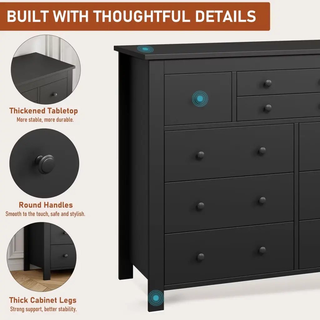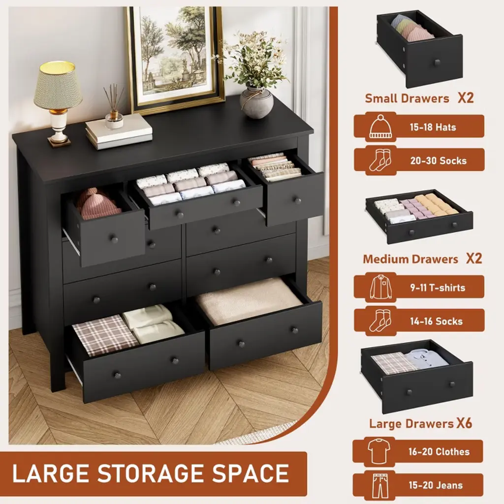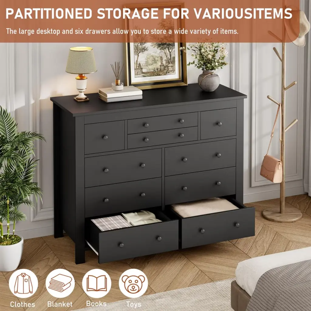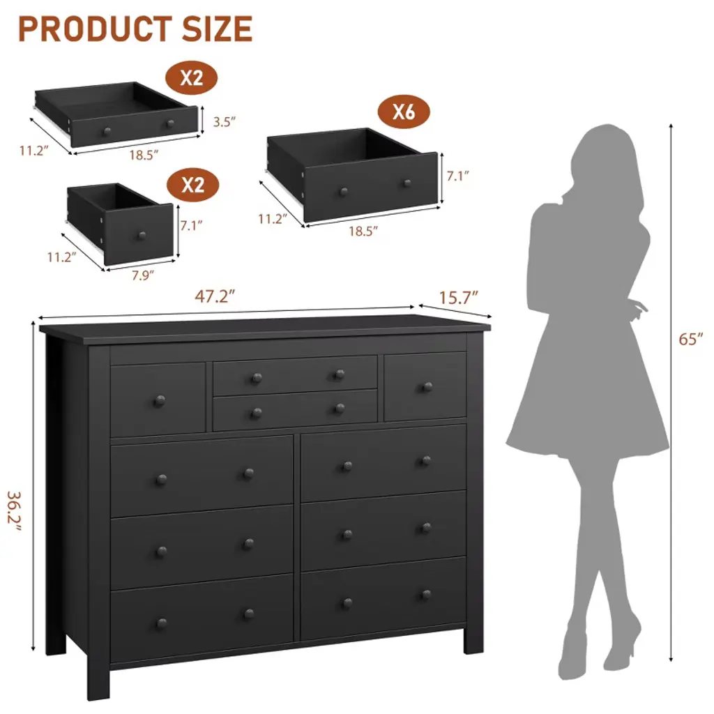 10-Drawer Dresser, Modern Wooden Chest of Drawers with Natural Texture, Sturdy Storage Organizer for Bedroom, Living Room & EntrywayOptimal Storage & OrganizationThis versatile 10-drawer dresser offers intelligently designed storage with three distinct drawer sizes, making it easy to categorize and access your essentials. From clothing and accessories to office supplies and household items, keep your space tidy and efficient.Durable Build & Contemporary StyleConstructed from high-quality engineered wood, this chest of drawers combines resilience with aesthetic appeal. The brushed finish and natural woodgrain texture enhance its modern yet timeless look, while smooth, integrated handles add a subtle touch of elegance. Scratch-resistant and easy to clean, this piece is designed to maintain its beauty through everyday use.Heavy-Duty PerformanceEngineered for stability and strength, each drawer supports up to 25 lbs, while the reinforced top can hold up to 180 lbs. Whether used as a dresser, TV stand, or display surface, this unit delivers reliable performance without compromising on safety or style.Adaptable for Every SpaceBeyond the bedroom, this dresser fits seamlessly into any room. Place it in the entryway as a functional console, in the living room as a media stand, or in a home office for organized storage¡ªits sleek design complements various decor themes.Secure & Simple SetupPrioritizing safety, this dresser includes an anti-tip kit for secure wall mounting. Detailed instructions and all necessary hardware are provided for straightforward assembly. For best results, power tools are recommended to ensure efficiency and stability.Specifications: Brand: TROPOW Dimensions: 47.2"W x 15.7"D x 36.2"H Material: Engineered Wood Finish: Brushed Wood Grain Number of Drawers: 10 Weight: 125.22 lbs Assembly Required: Yes Ideal For: Bedroom storage Living room media console Entryway organizer Home office supply storage Nursery or kids' room