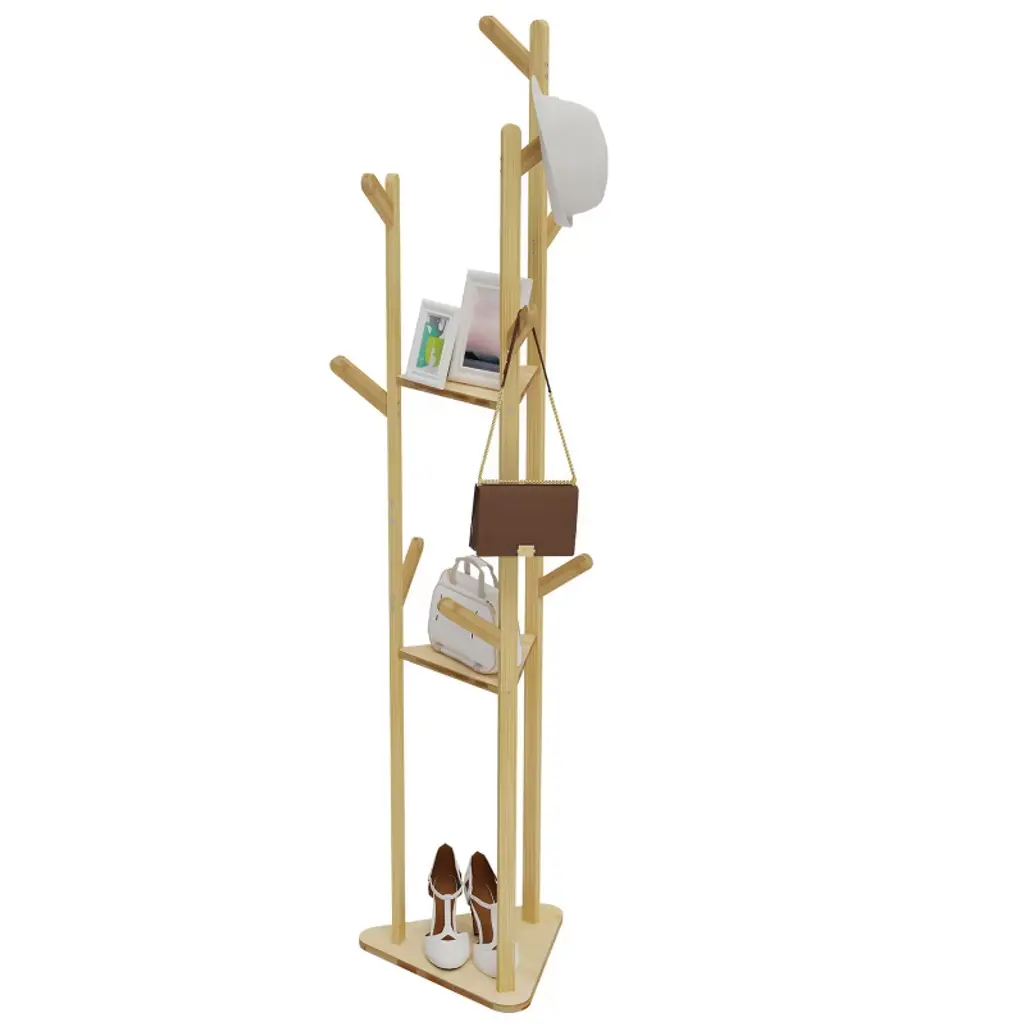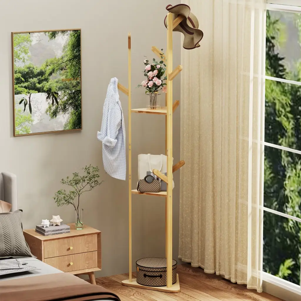 2 In1 Large Heavy Duty Bamboo Coat Rack Freestanding Clothes Hall Tree Corner Stand With 3 Tier Storage Shelf & 7 Hooks For Bedroom