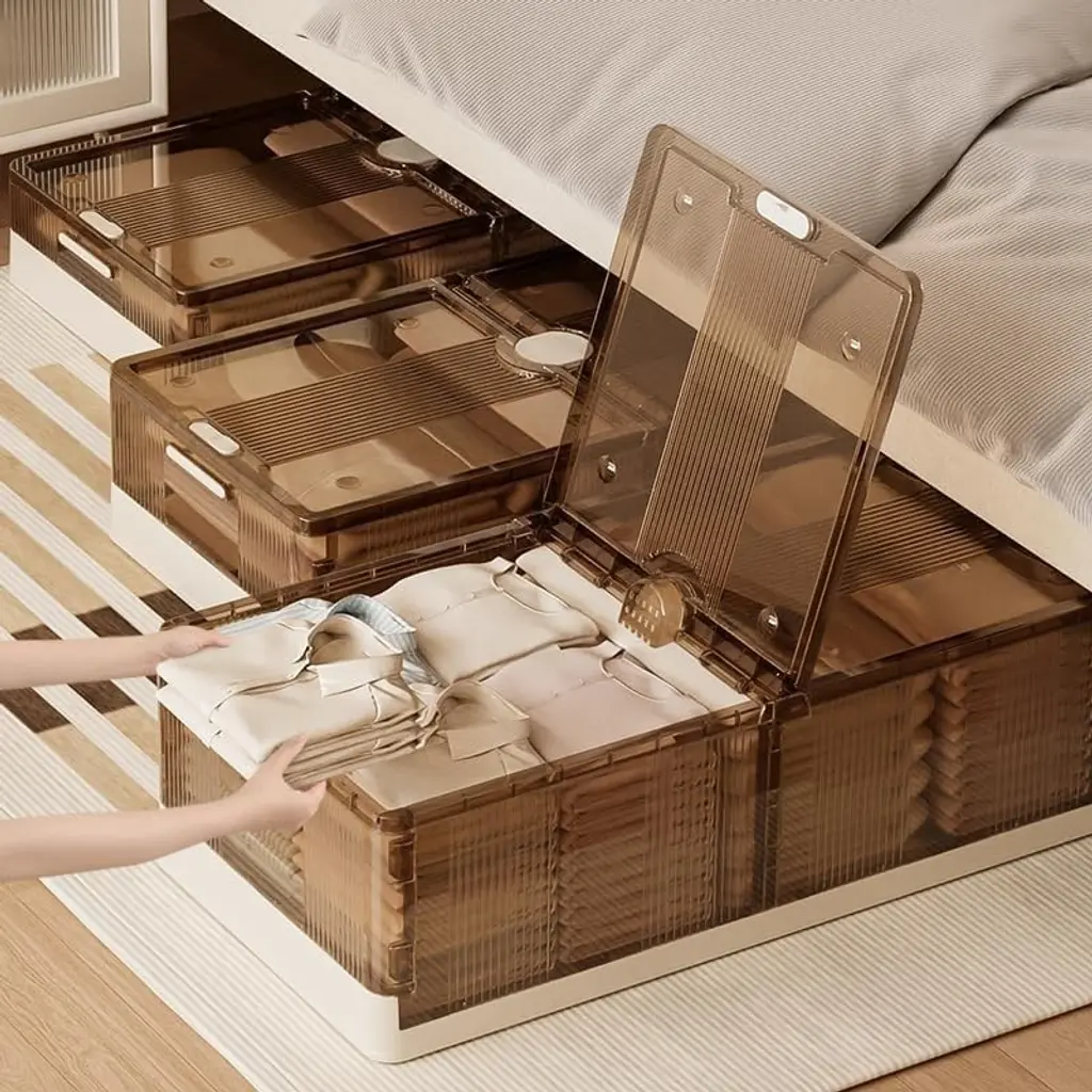 Under Bed Storage Containers with Wheels - Clear Plastic Rolling Bins with Lids, Foldable Organizer Box for Clothes, Shoes & Seasonal Items (23.23"L x 14.17"W x 22.05"H)Brand: TROPOWColor: Transparent WhiteMaterial: Durable PlasticSpecial Features: Dustproof, Pre-Installed Wheels, Foldable DesignProduct Dimensions: 23.23" L x 14.17" W x 22.05" HAssembly Required: No tools neededProduct OverviewMaximize your storage space with the TROPOW Under Bed Storage Containers, featuring clear plastic bins with wheels for easy access and organization. These flat rolling storage boxes are perfect for clothes, shoes, blankets, and seasonal items, helping you declutter bedrooms, apartments, and small spaces. With a dustproof lid, smooth-rolling wheels, and stackable design, these under-bed organizers offer convenient, space-saving storage without sacrificing accessibility.Key Features1. Large, Space-Saving Storage Capacity Spacious Interior: Measures 23.23" x 14.17" x 22.05"¡ªideal for bulky items like winter coats, shoes, bedding, or toys. Under-Bed Design: Fits neatly under most beds (including platform, queen, and king sizes). Multi-Use Storage: Great for closets, dorm rooms, RVs, and small apartments. 2. Easy-Access Rolling Wheels & Hidden Handles Pre-Installed Wheels: Smooth-gliding mobility for effortless retrieval (best on hard floors). Side Handles: Easy to pull out from under furniture. Double-Sided Flip Lid: Open from either side for quick access. 3. Stackable & Versatile Organization Interlocking Design: Securely stack multiple bins for vertical storage. Foldable When Empty: Collapses flat for compact storage when not in use. 4. Dustproof & Pest-Resistant Protection Sealed Lid: Keeps contents clean, dust-free, and moisture-resistant. Elevated Base: Prevents bugs and dirt from entering. 5. No-Tool Assembly in Seconds Ready in 30 Seconds: Simply unfold and lock into place. Portable & Lightweight: Easy to move and reposition. Why Choose These Under Bed Storage Bins?? Saves Space ¨C Utilizes unused under-bed storage efficiently.? Easy Roll-Out Access ¨C Wheels and handles make retrieval simple.? Clear Visibility ¨C See contents at a glance without opening.? Stackable & Foldable ¨C Customizable storage that collapses when empty.? Dust & Pest Protection ¨C Keeps items clean and secure.