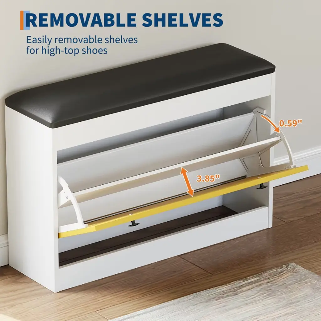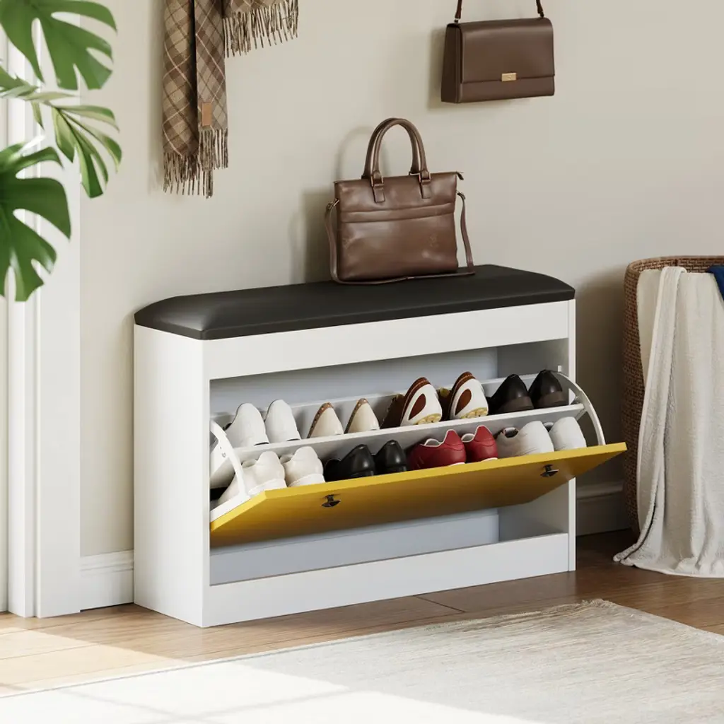 Introducing the 31.5" Shoe Storage Bench, a modern and versatile solution designed to keep your entryway, hallway, bedroom, or living room organized and stylish. This shoe cabinet features a flip drawer design that allows easy access to your footwear while keeping them neatly tucked away. The built-in seat cushion provides a comfortable spot to sit while putting on or taking off shoes, making it both functional and practical.Crafted with space-saving in mind, this compact shoe storage furniture fits perfectly in tight spaces without compromising on capacity. Its flip doors open smoothly to reveal multiple compartments, offering ample room to store various shoe sizes and styles. The sleek, modern design complements any home decor, adding a touch of elegance to your living space.Key Features:- Flip shoe cabinet design for quick and convenient shoe access- Multi-compartment shoe organizer to accommodate multiple pairs- Comfortable seat cushion for added convenience- Compact and space-saving, ideal for entryways and hallways- Modern aesthetic that blends seamlessly with contemporary interiors- Durable construction ensures long-lasting useUpgrade your home organization with this modern shoe storage solution that combines functionality, style, and comfort. Say goodbye to clutter and welcome a tidy, inviting entryway with the 31.5" Shoe Storage Bench.
