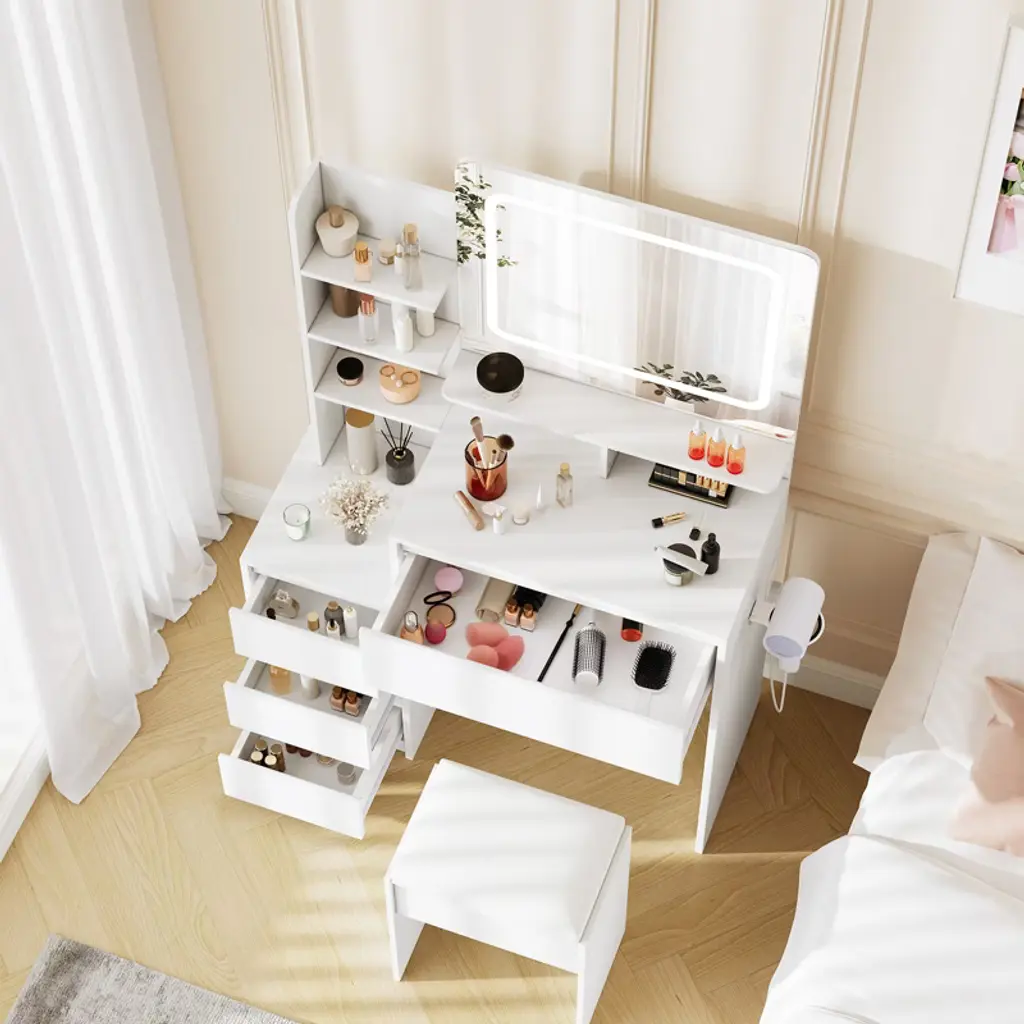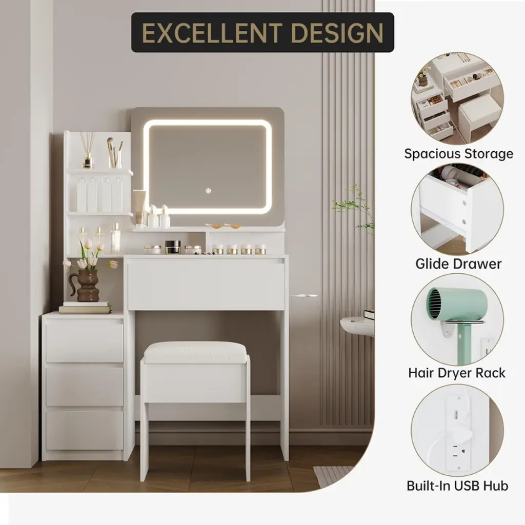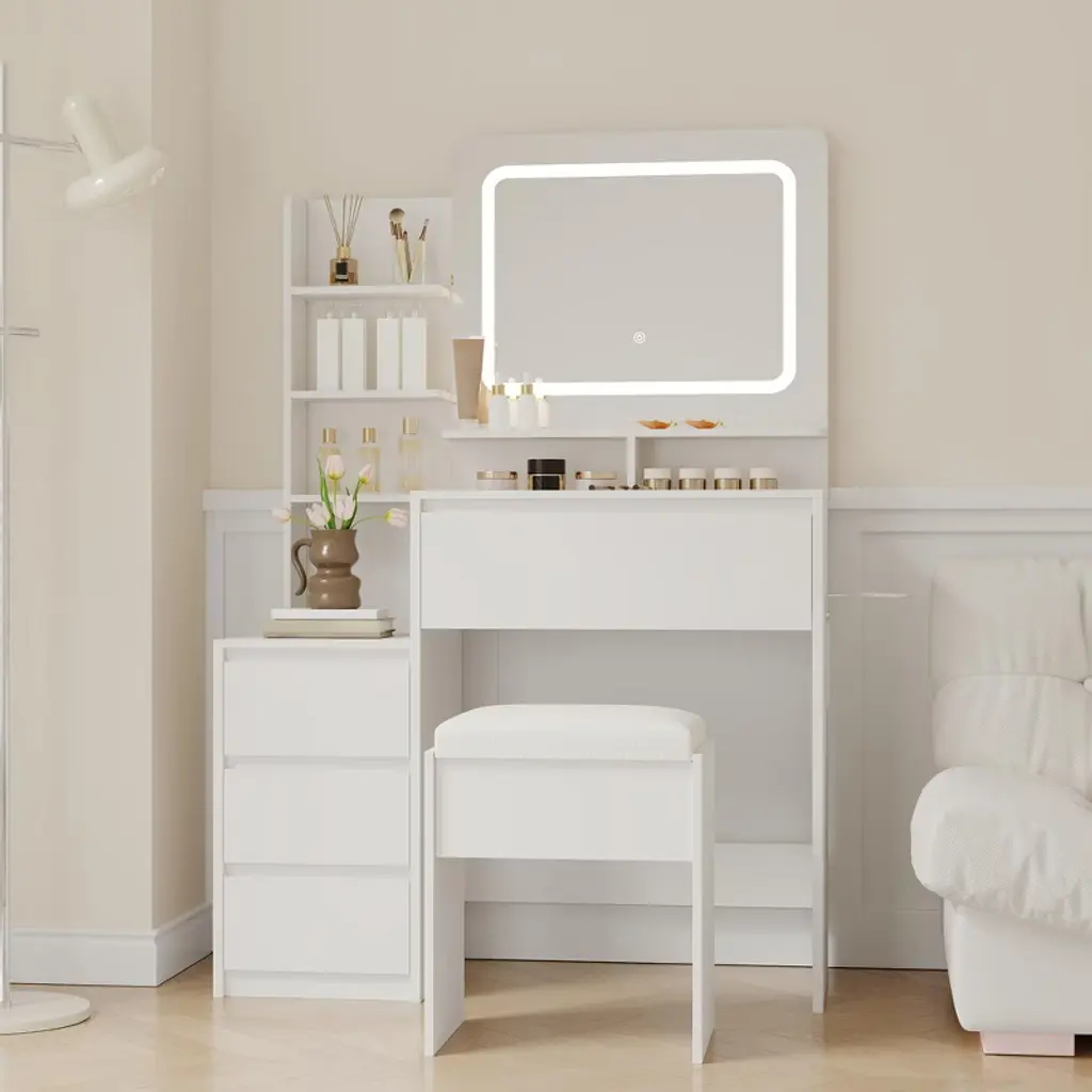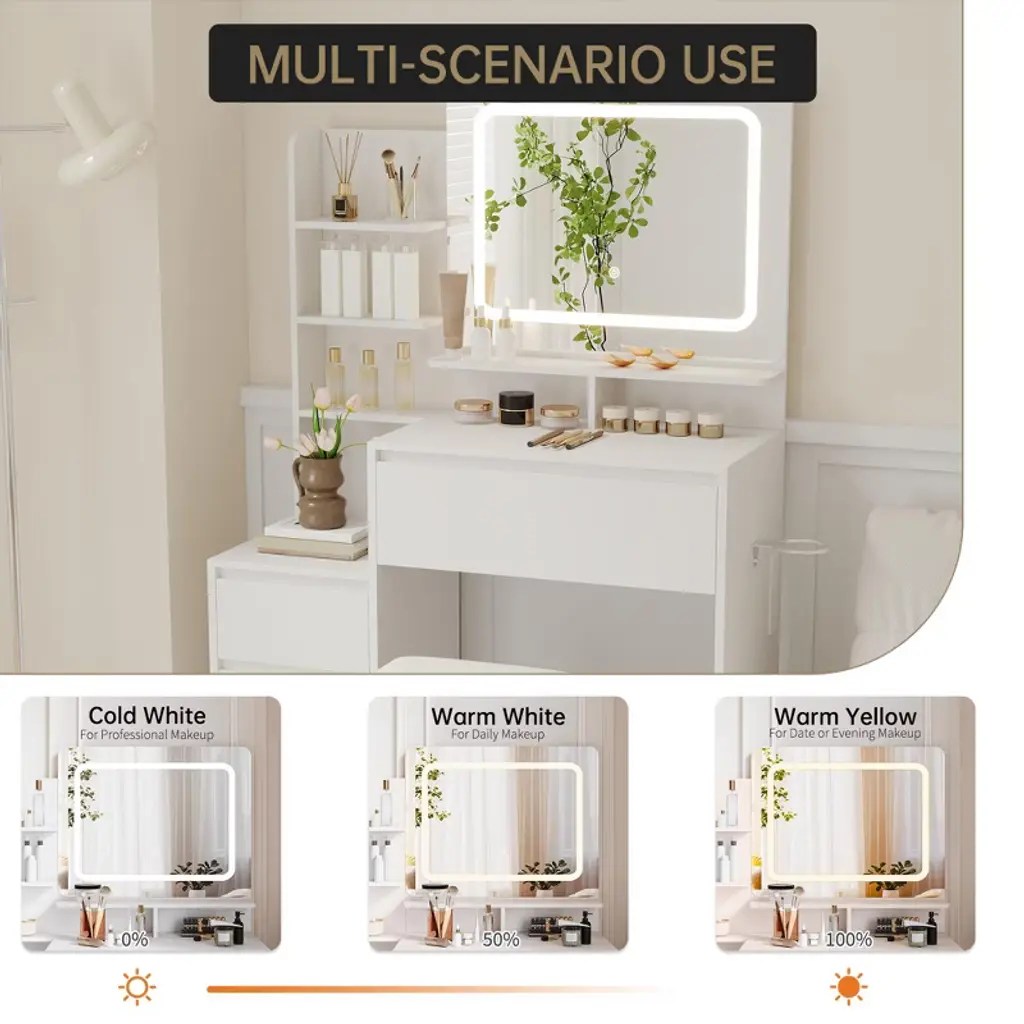 36-inch Makeup Vanity Desk, Modern Vanity Table For Bedroom, 4 Large Drawers, 3 Lighting Modes, Storage Shelves For Bedroom, White
