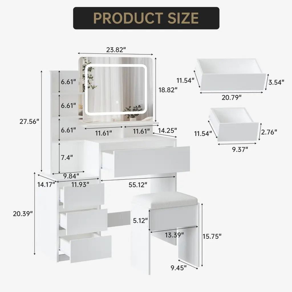 Introducing the perfect Kids Vanity with Lighted Mirror, designed especially for little girls aged 3 to 9 years. This stylish and functional dressing table is crafted from high-quality MDF, offering durability and a modern look that fits beautifully in any bedroom or playroom. The vanity features an adjustable LED light around the mirror, providing the perfect illumination for makeup play and dress-up fun, helping your child feel like a star.This compact and small wooden dressing table is thoughtfully designed with both a drawer and open shelves, offering ample storage space for makeup, hair accessories, and other. Its sleek and modern design makes it a charming addition to your home vanity furniture collection, combining practicality with style.Key Features:- Made from durable MDF material for long-lasting use- Modern, stylish design that complements any bedroom decor- Adjustable LED light around the mirror for perfect lighting- Functional drawer and open shelves for organized storage- Compact size ideal for small spaces- Perfect for children aged 3 to 9 yearsThis Kids Vanity with Lighted Mirror is more than just a makeup table; it's a special place where your little girl can express creativity, develop self-confidence, and enjoy hours of imaginative play. Make her feel special with this beautiful and practical dressing table that grows with her. Order now and bring a touch of magic to her daily routine!