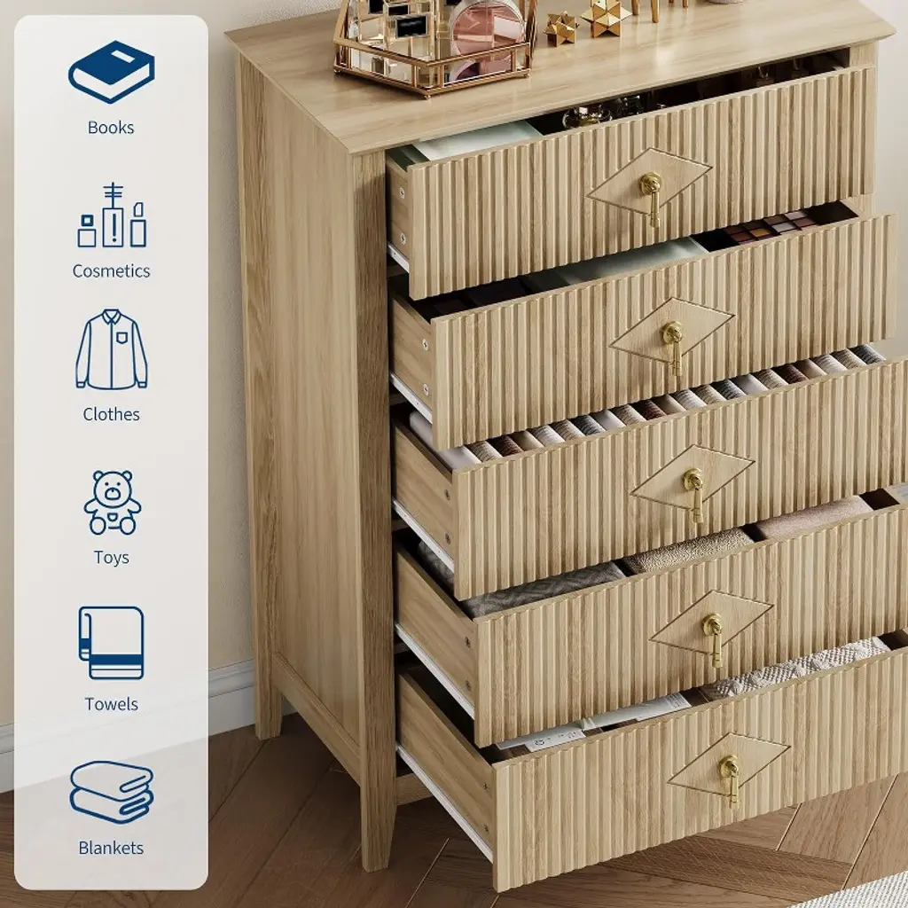 This chest of drawers features fluted panels, and thickened tabletop eatures natural wood grain that complements the natural oak finish. The exclusive gold-tone metal handles reflect light like jewelry, creating a luxury dresser for bedroom that outshines plain chrome fixtures. Which creating a personalized and distinctive appearance.