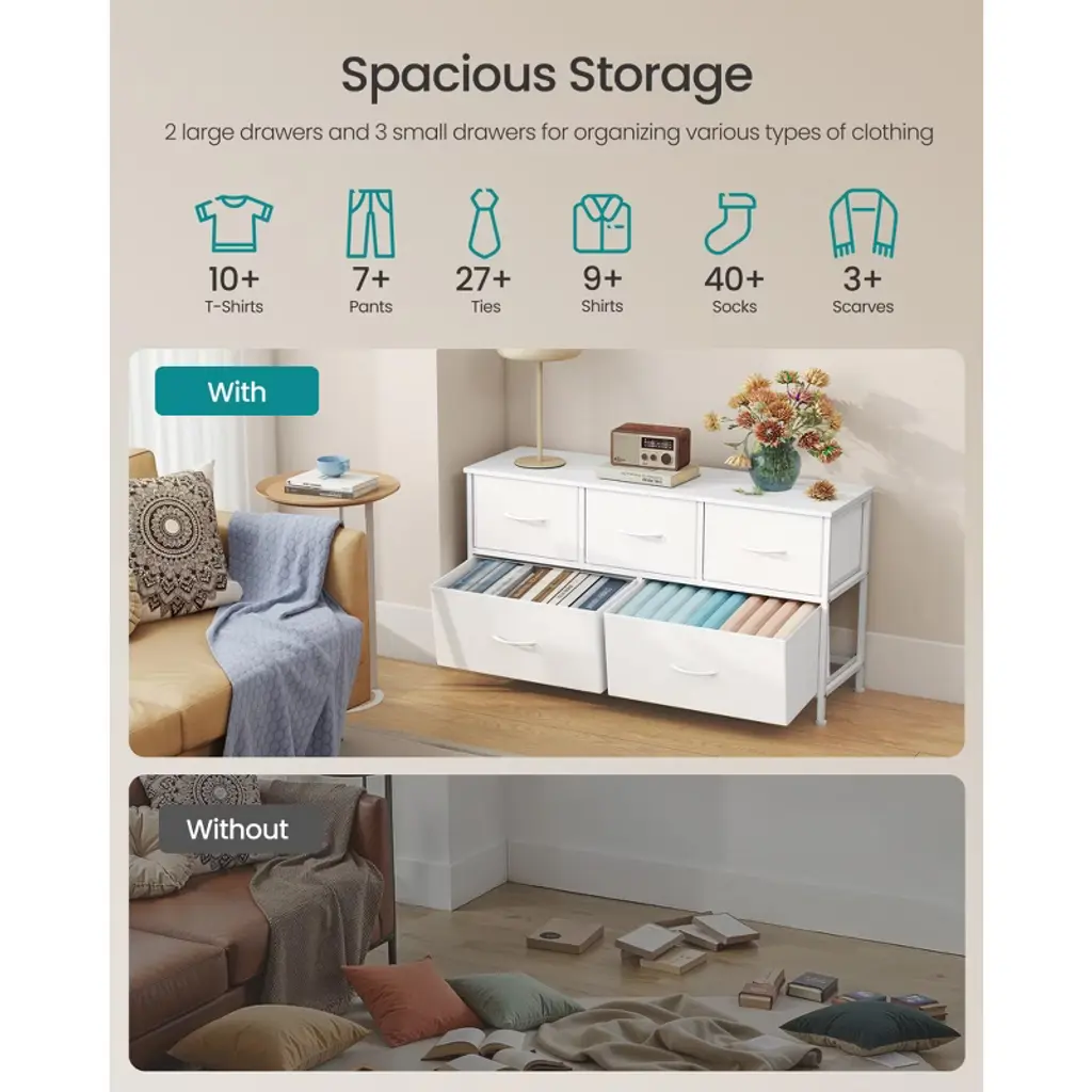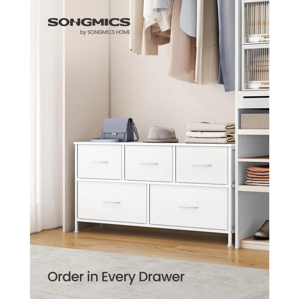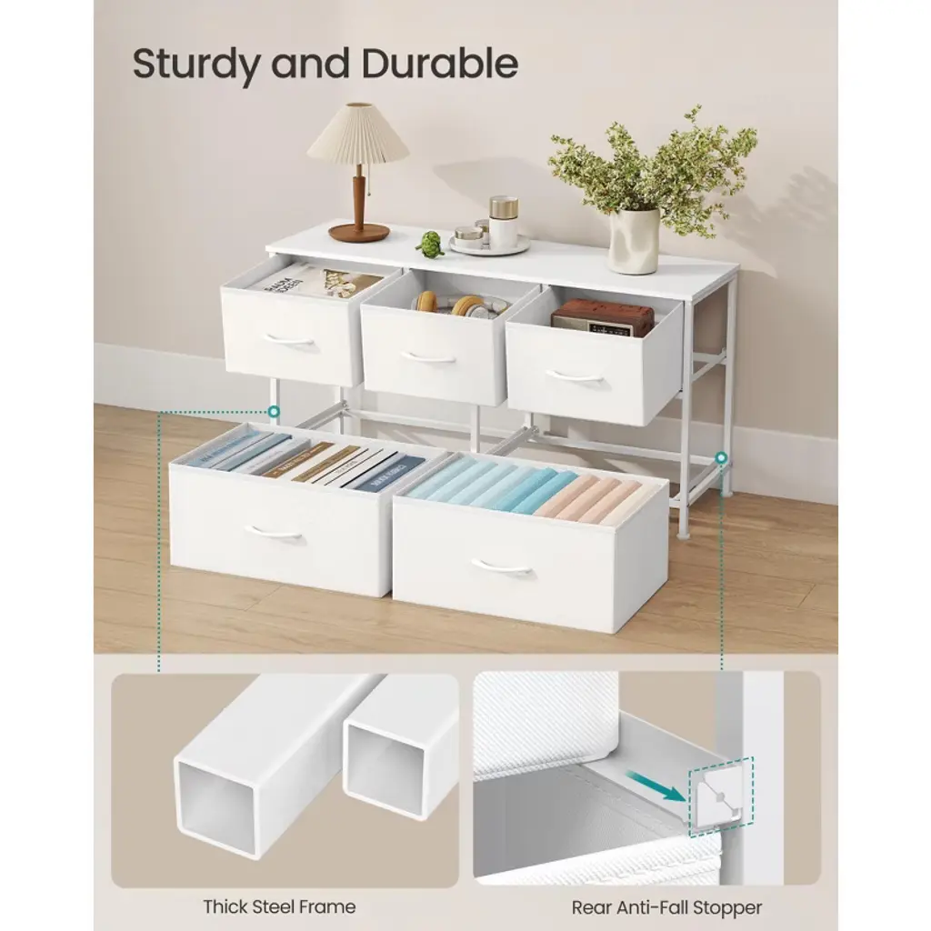 5-drawer Fabric Dresser With Steel Frame, Tv Stand Storage Organizer, 88 Lb Top Load, For Bedroom Closet Entryway, White