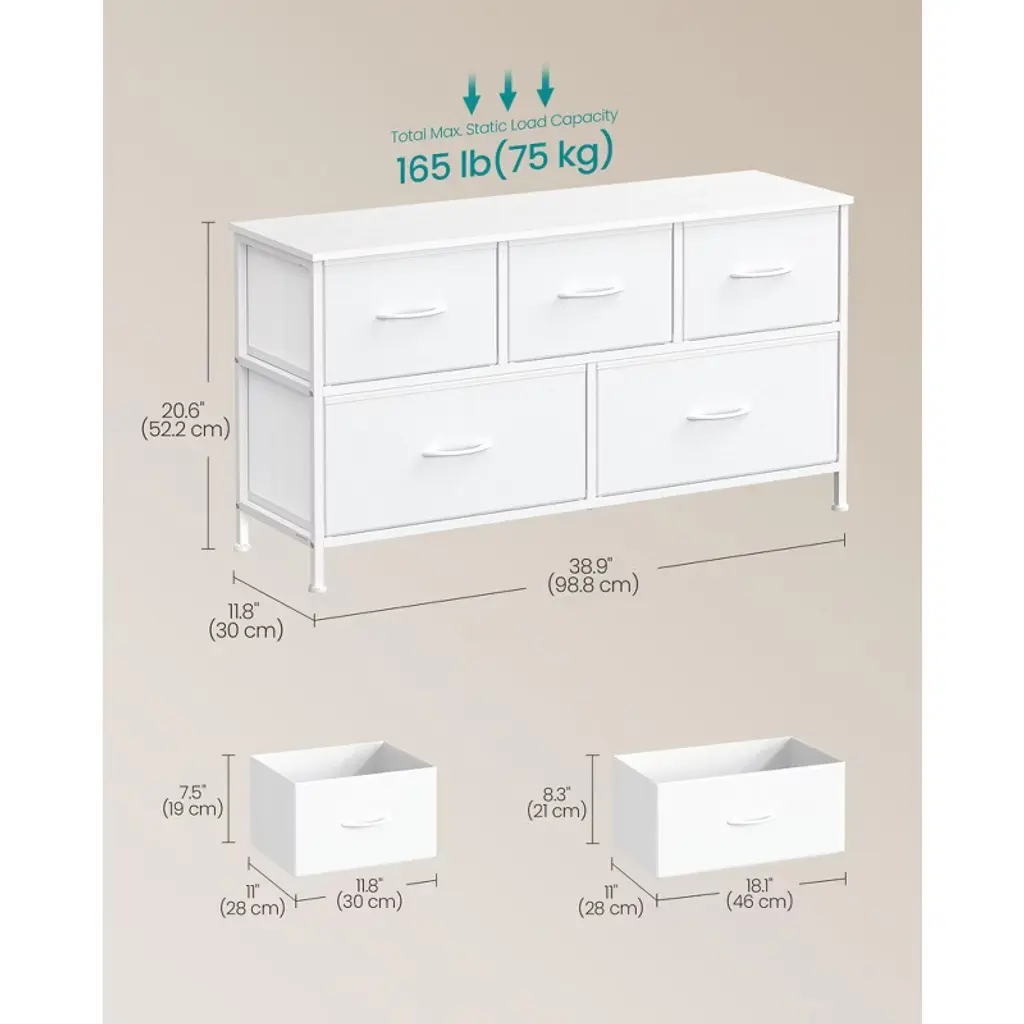 This multifunctional 5-drawer dresser combines a robust steel frame and MDF-reinforced non-woven fabric drawers, offering versatile use as a TV stand or storage organizer. The top surface supports up to 88 lbs, while large drawers hold 22 lbs and small drawers 11 lbs each. Ideal for bedrooms, entryways, or closets, it includes adjustable feet for stability and an anti-tip kit for safety. The minimalist design ensures easy assembly with included tools. Product Size: 11.8"D x 38.9"W x 20.6"H (30 x 98.8 x 52.2 cm) Product Weight: 20.2 lb (9.2 kg) Max. Static Load Capacity of the Top Surface: 88 lb (40 kg) Max. Static Load Capacity of Each Small Drawer: 11 lb (5 kg) Max. Static Load Capacity of Each Large Drawer: 22 lb (10 kg)